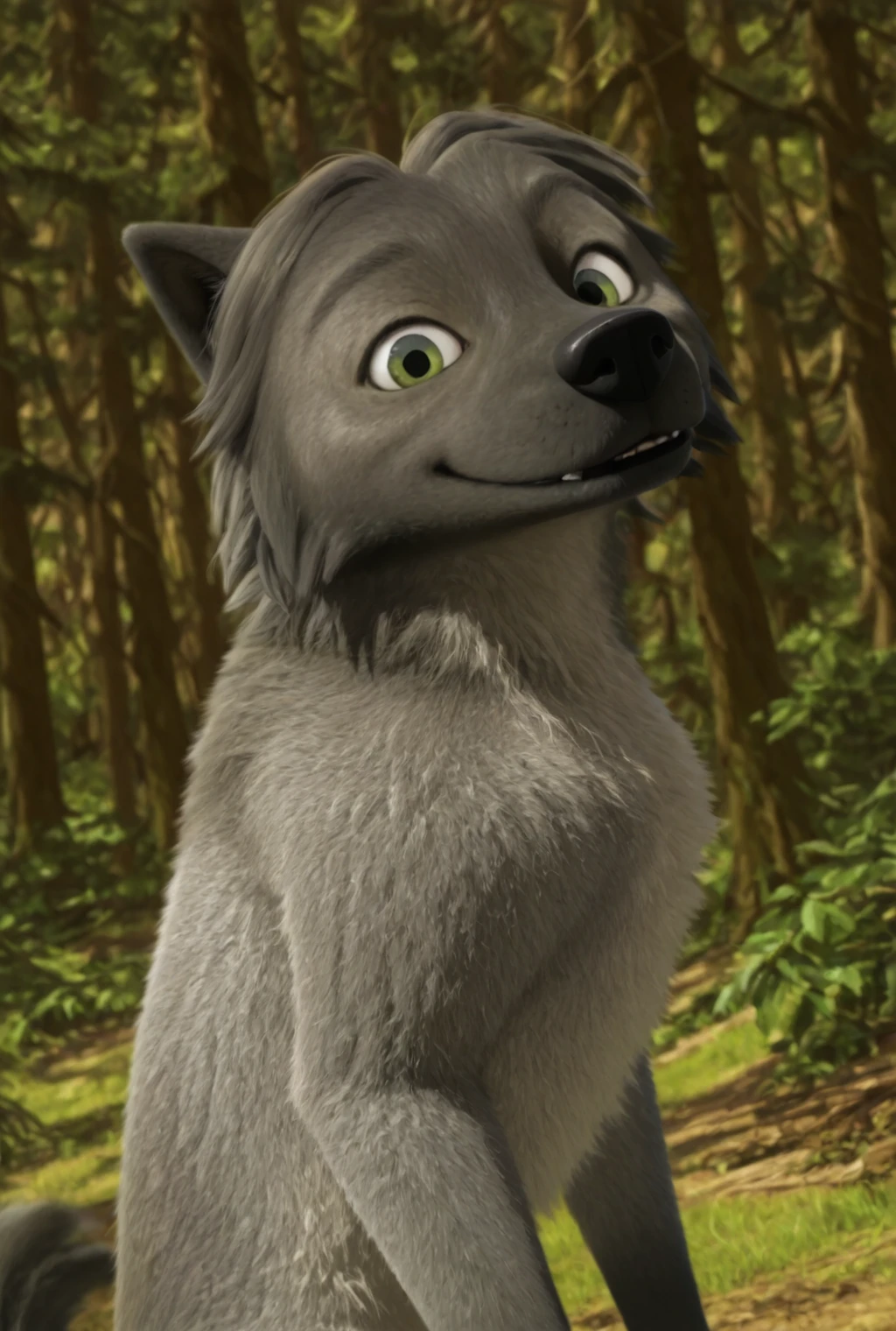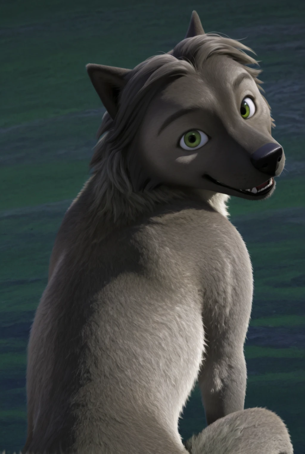 wolf, male, dark gray and white fur, green eyes, yellow eyes, slender body, dark eyebrows