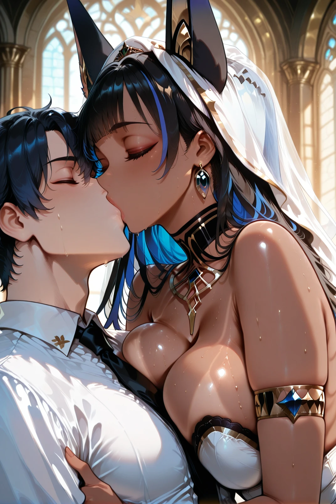 ilcleopatra, 1girl, 1boy, ?????, black hair, hetero, breasts, internal ???????, ???, ???, cross-section, dark skin, multicolored hair, thighhighs, vaginal, animal ears, earrings, ??? in ?????, large breasts, long hair, ass, jewelry, dress, uncensored, dark-skinned female, ???????????, sweat, suspended congress, white thighhighs, heart, uterus, gloves, elbow gloves, white dress, bridal gauntlets, extra ears, veins, garter straps, teeth, mole, ?????????, ??????, white gloves, veil, streaked hair, standing, blush, indoors, parted lips, ??? overflow, ????, thighs, looking at another, lifting person, clenched teeth, two-tone hair, blue hair, from side, veiny ????? <lora:illustrious cleopatra 768X1152:1>cat ears