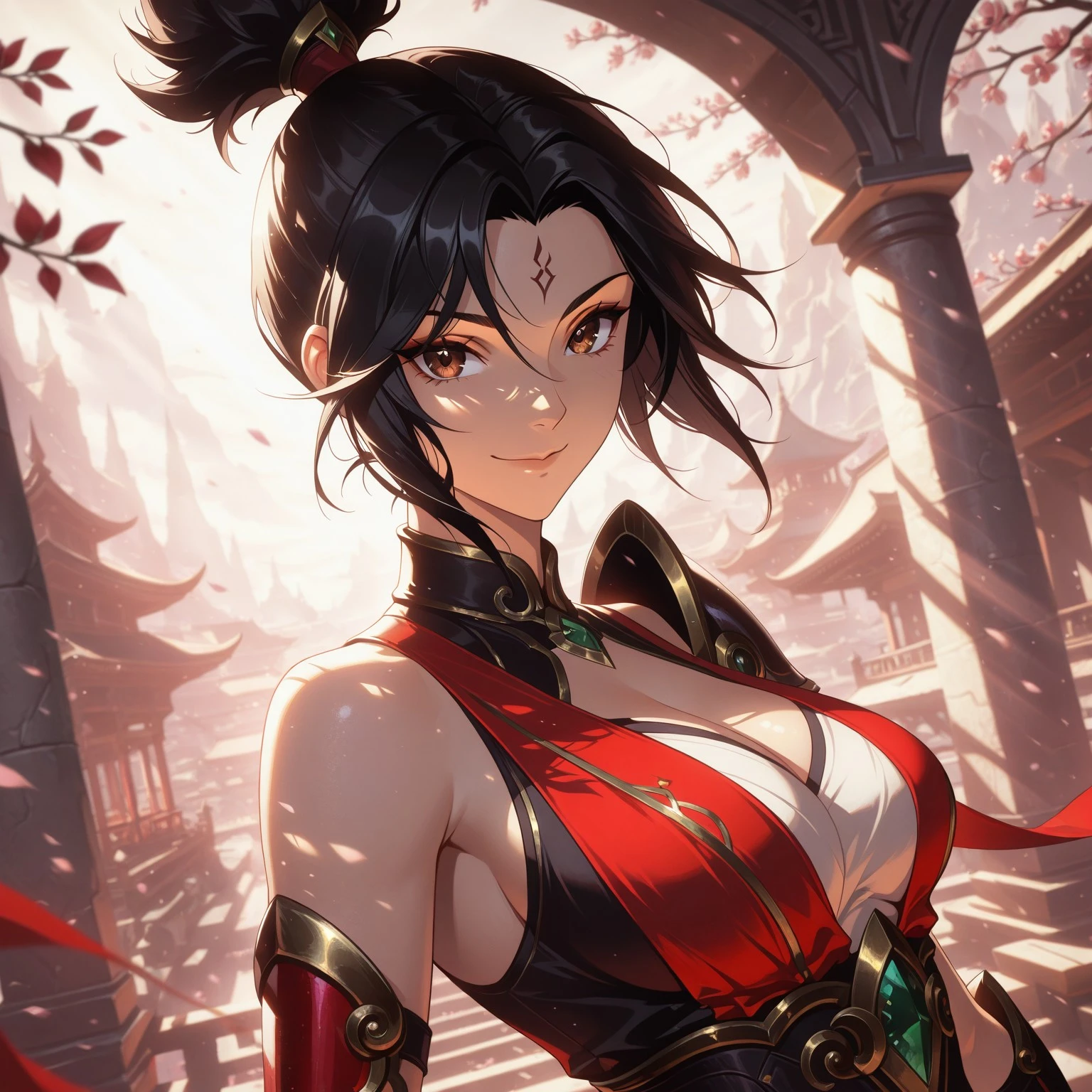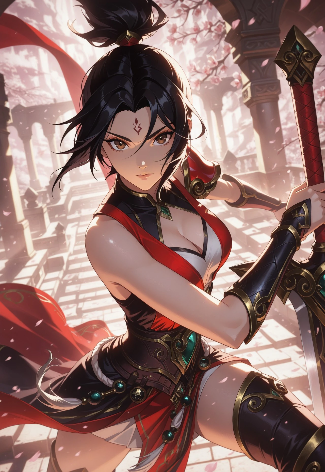 VSriven, short hair, black hair, ponytail, forehead marking, brown eyes, single pauldron, shoulders, multicolored dress, arm guards, thigh-high boots, greatsword, holding a greatsword,