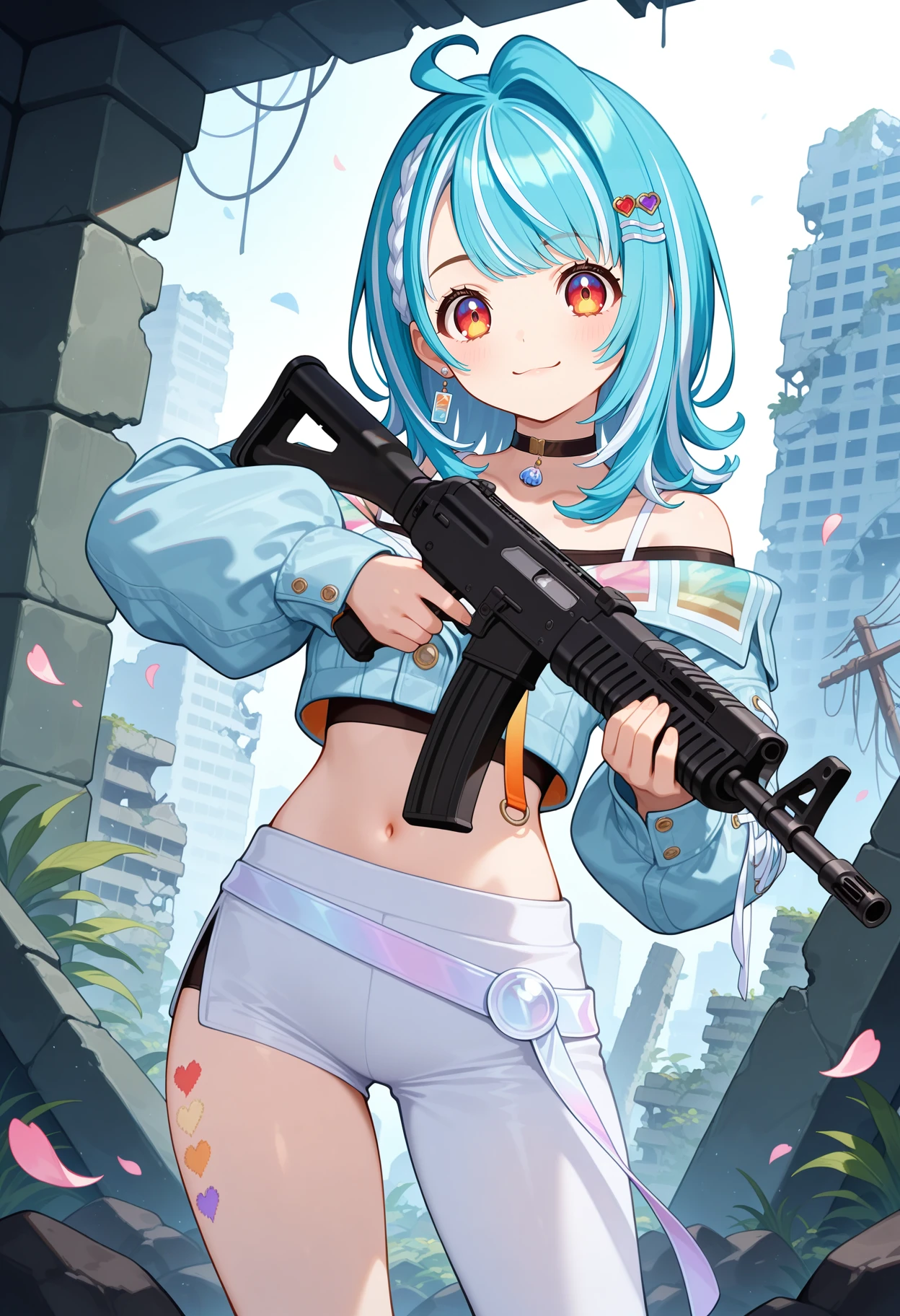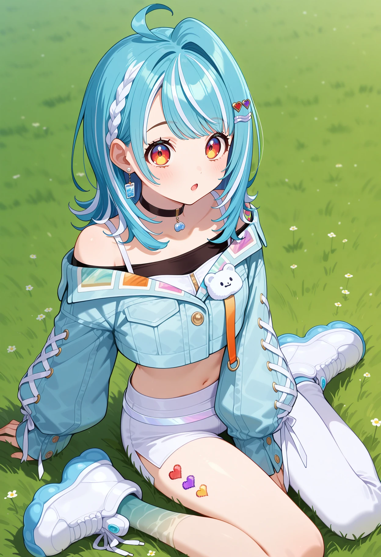 aaramune, medium hair, blue hair, streaked hair, ahoge, braid, hair ornament, earrings, black choker, off shoulder, crop top, cropped jacket, blue jacket, long sleeves, single pantsleg, white pants, leg tattoo