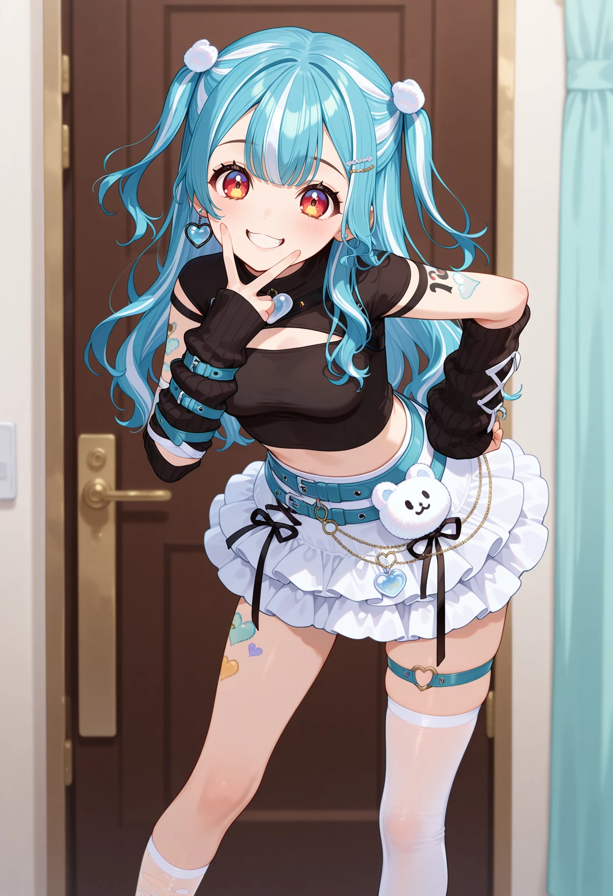 ccramune, long hair, streaked hair, blue hair, two side up, hairclip, earrings, harness, clothing cutout, black shirt, arm tattoo, black arm warmers, midriff, blue belt, layered skirt, white skirt, single thighhigh, white thighhighs, leg tattoo, thigh strap