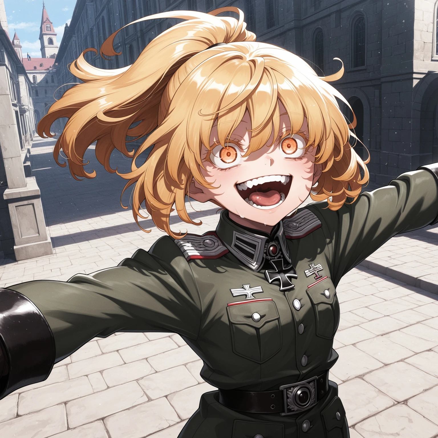 blonde hair, facial hair, medium hair,ponytail, military uniform,gloves, belt, iron cross, jacket, peaked cap,military hat, boots, black footwear