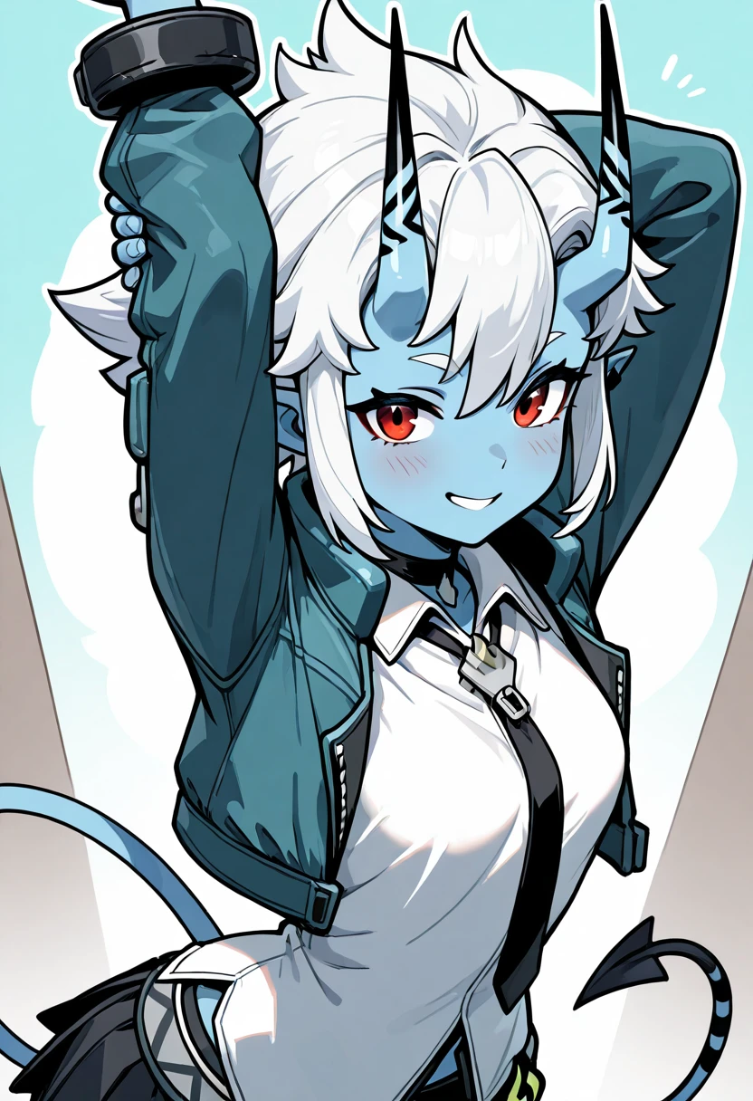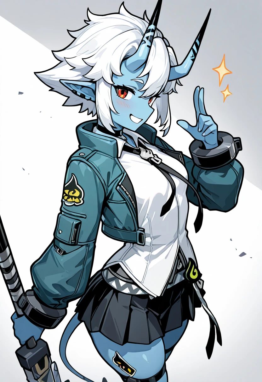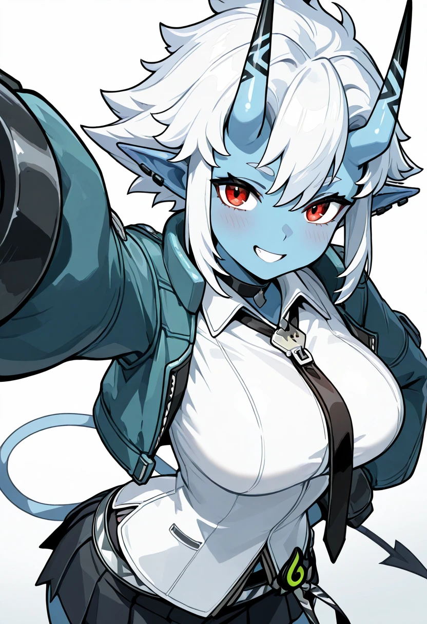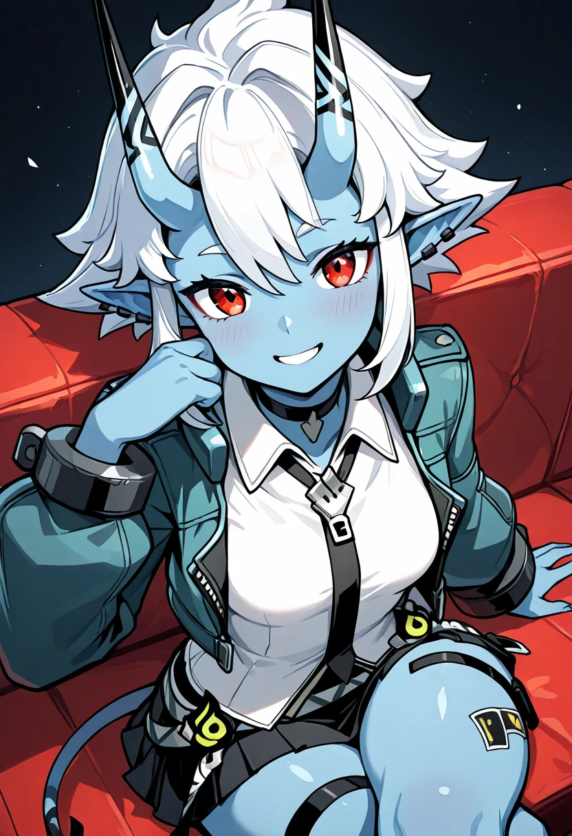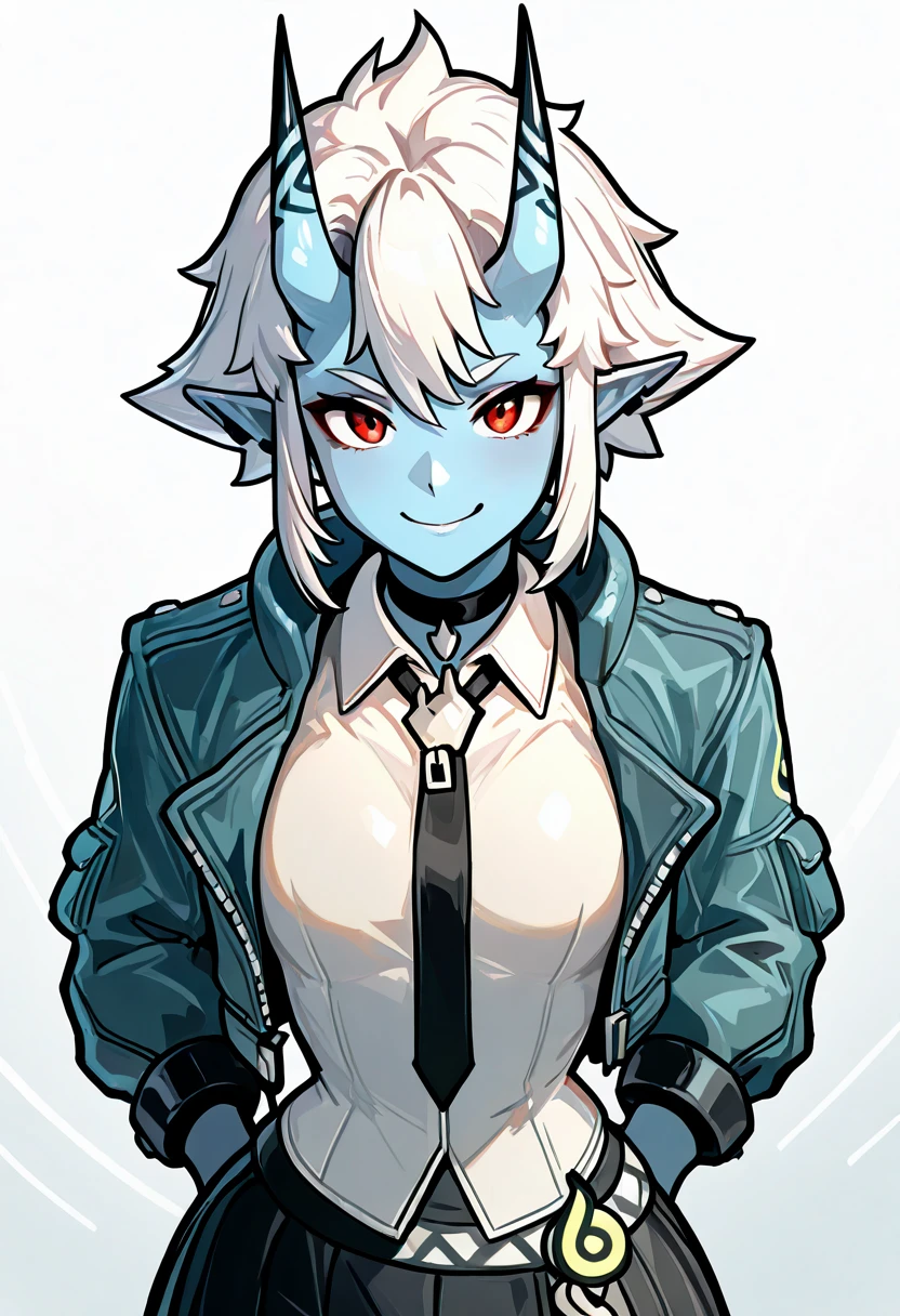 zzSoukaku, red eyes, blue skin, white hair, short hair, horns, oni, pointy ears, black choker, jacket, white collared shirt, black tie, black skirt,