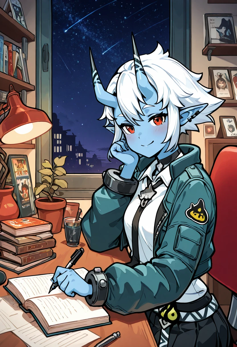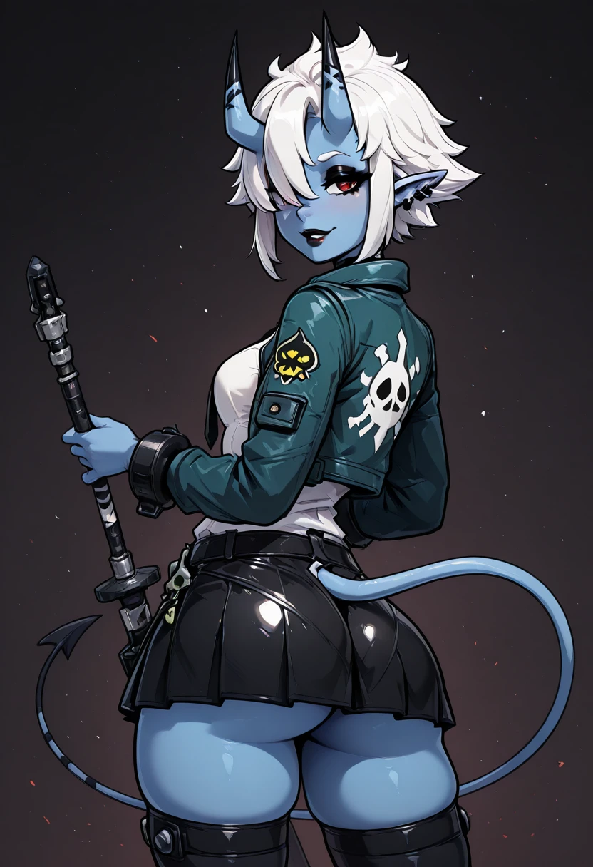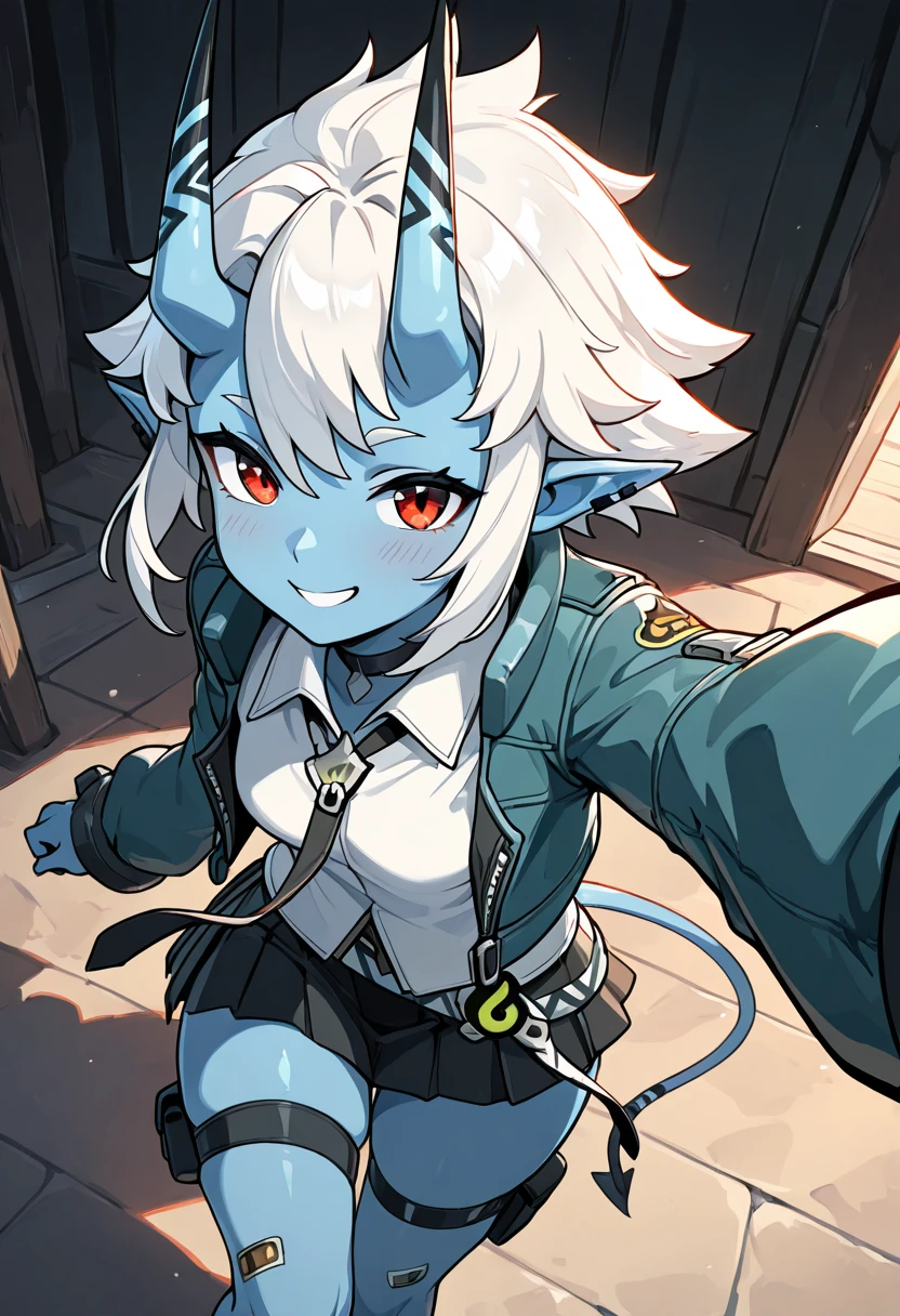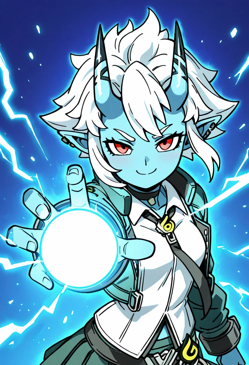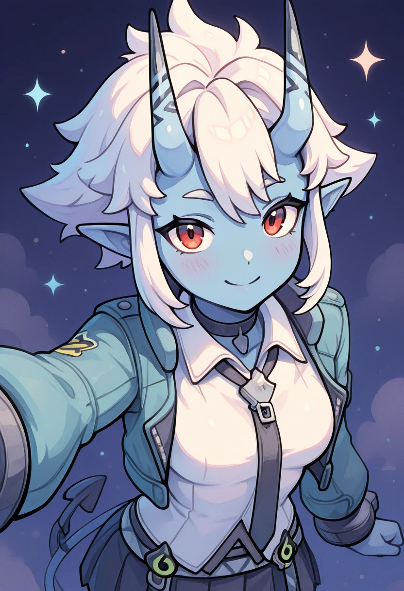 zzSoukaku, red eyes, blue skin, white hair, short hair, horns, oni, pointy ears, black choker, jacket, white collared shirt, black tie, black skirt,