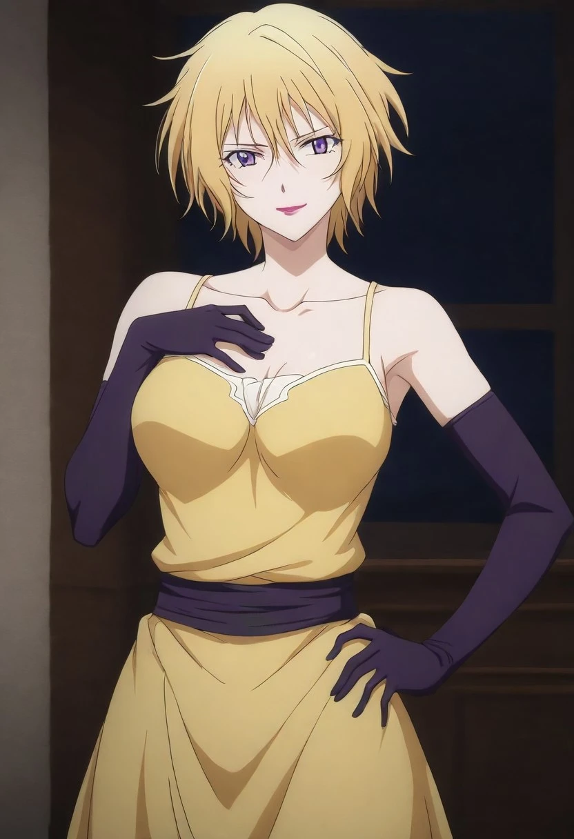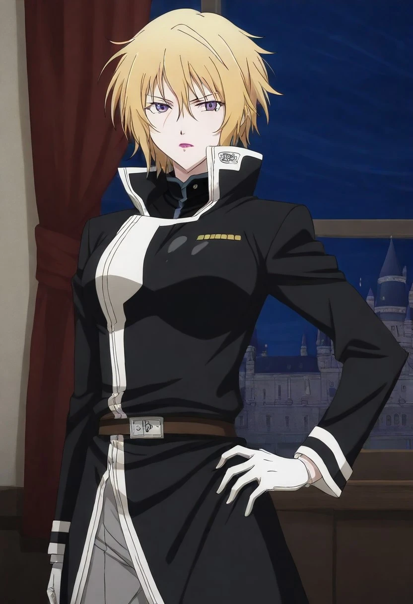 1 girl, solo, ElsaBB, purple eyes, short hair, blonde hair, hair between eyes, scar on face, lipstick, black uniform, long uniform, white gloves, brown belt, grey pants, white boots