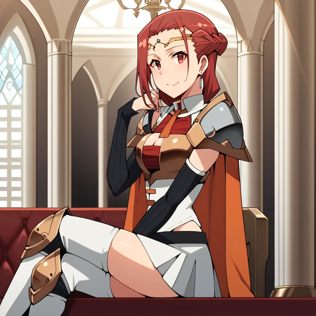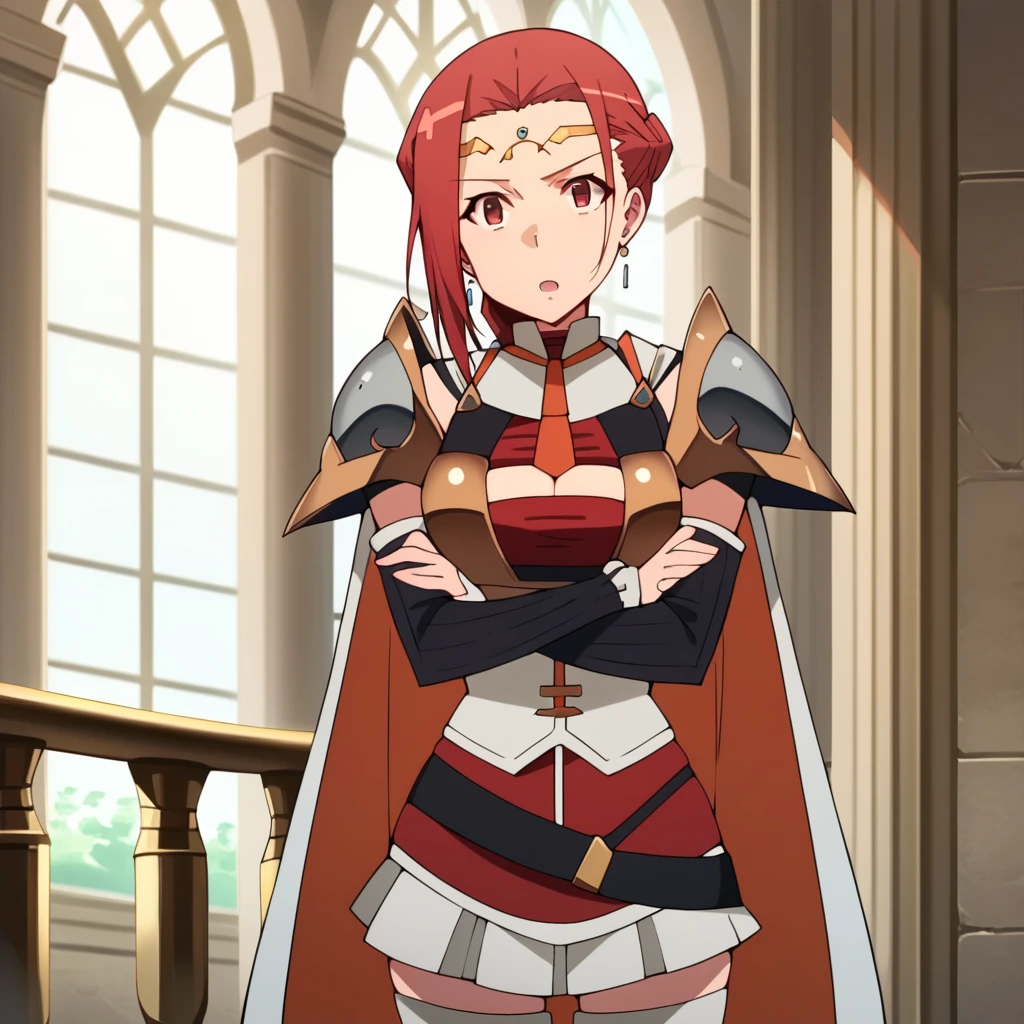 Lada_Def, black arm warmers, red skirt, white skirt, pleated skirt, jewelry, white corset, chestplate, armor, cleavage cutout, orange necktie, white collar, multicolored shirt, red shirt, black shirt, white shirt, collared shirt, sleeveless shirt, shoulder armor, earrings, pauldrons, two-tone cape, white cape, red cape, bare shoulders, white thighhighs, thighhighs, knee pads, gold trim, black belt, Formal Outfit: