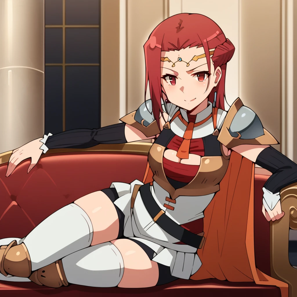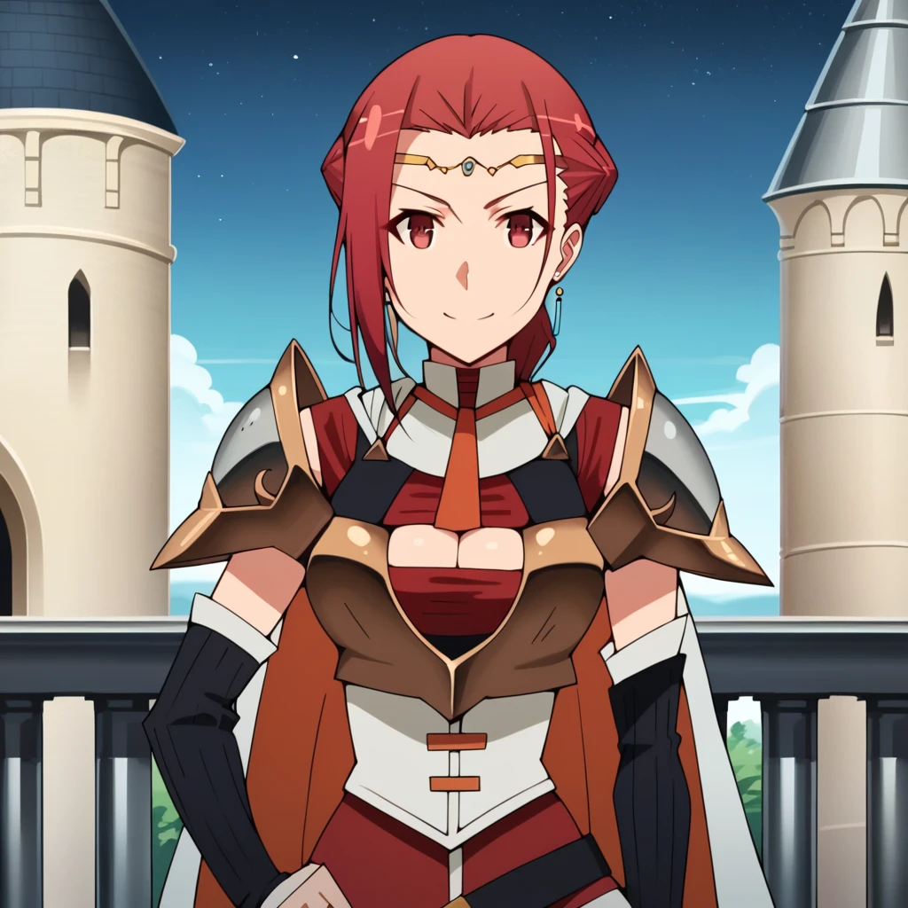 Pina, red hair, red eyes, short hair, circlet, earrings Default Outfit: