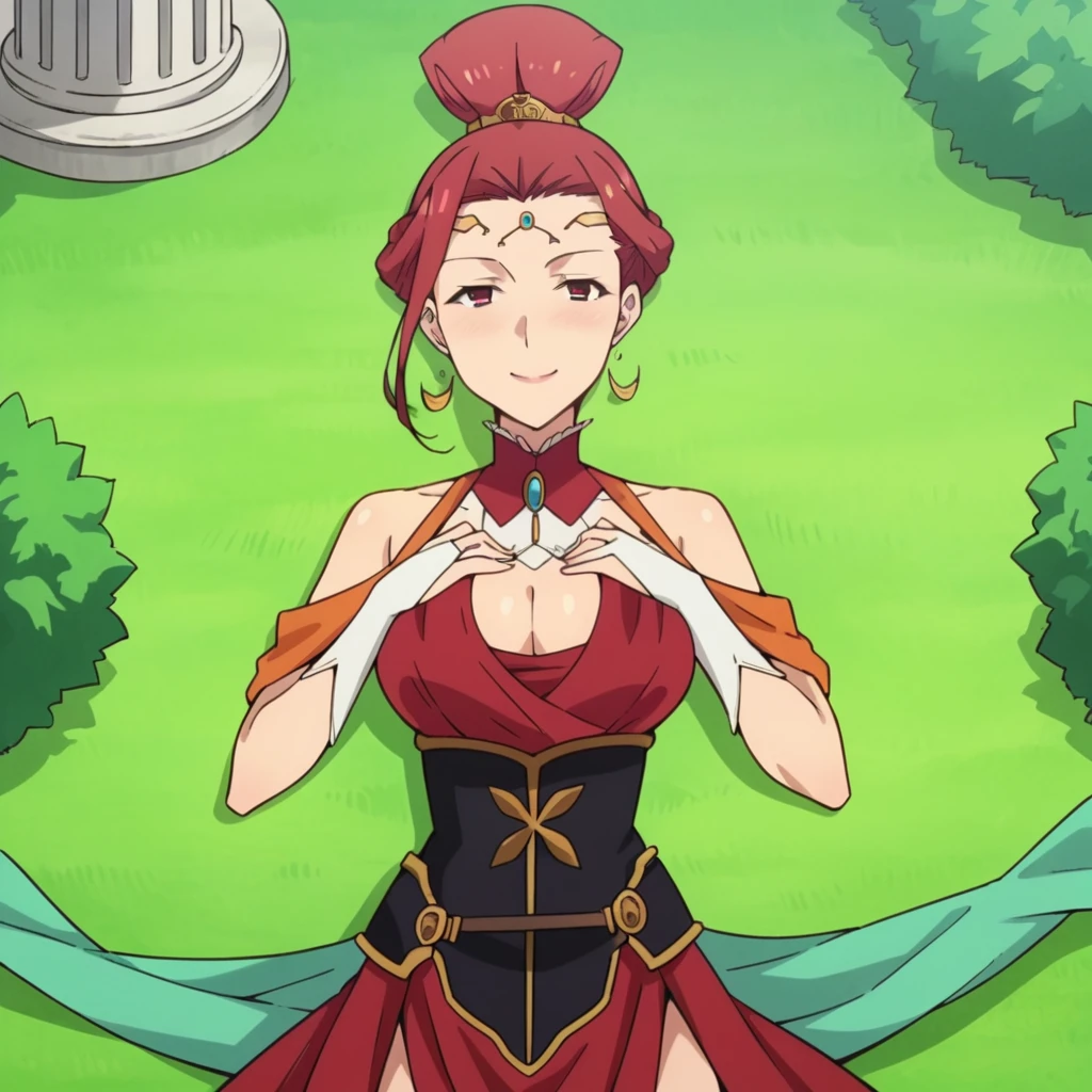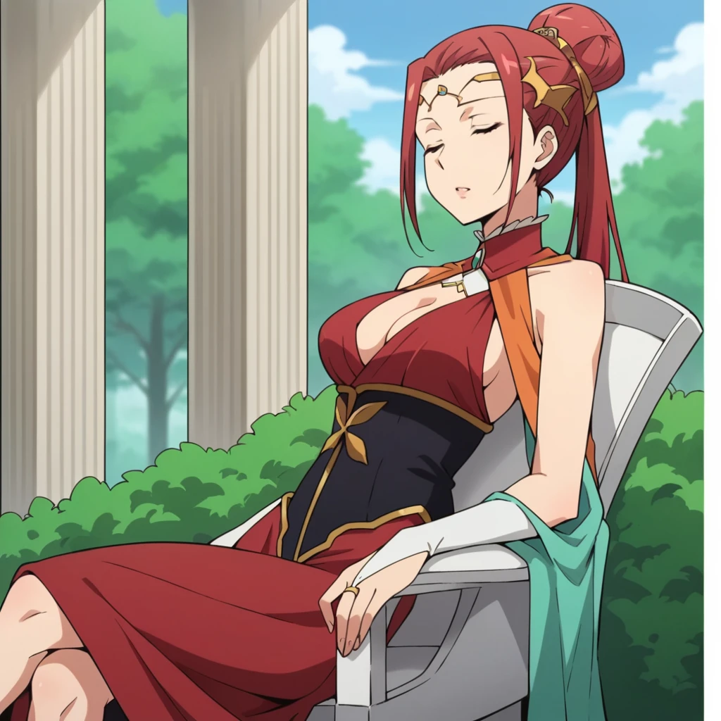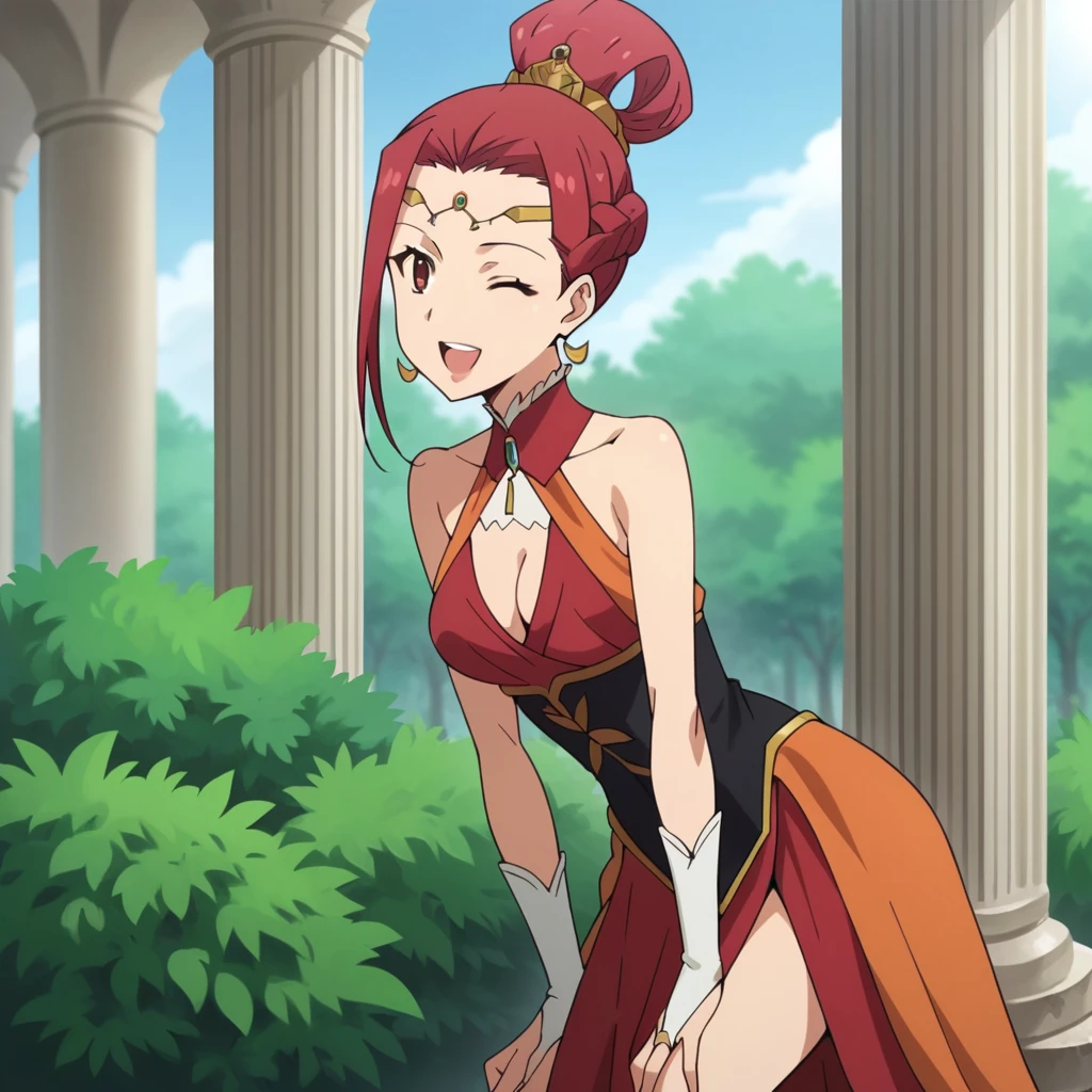 Lada_Alt, single hair bun, hair ring, red dress, halter dress, cleavage cutout, center opening, clothing cutout, single hair bun, ponytail, sleeveless dress, detached collar, red collar, gem, black corset, alt corset, underbust, long skirt, red skirt, side slit, hair ornament, bridal gauntlets, white gloves, orange shawl,The results of your generations are dependent on the additional LoRAs, weights, and models you use, so it may not work or come out as consistent as my sample images.