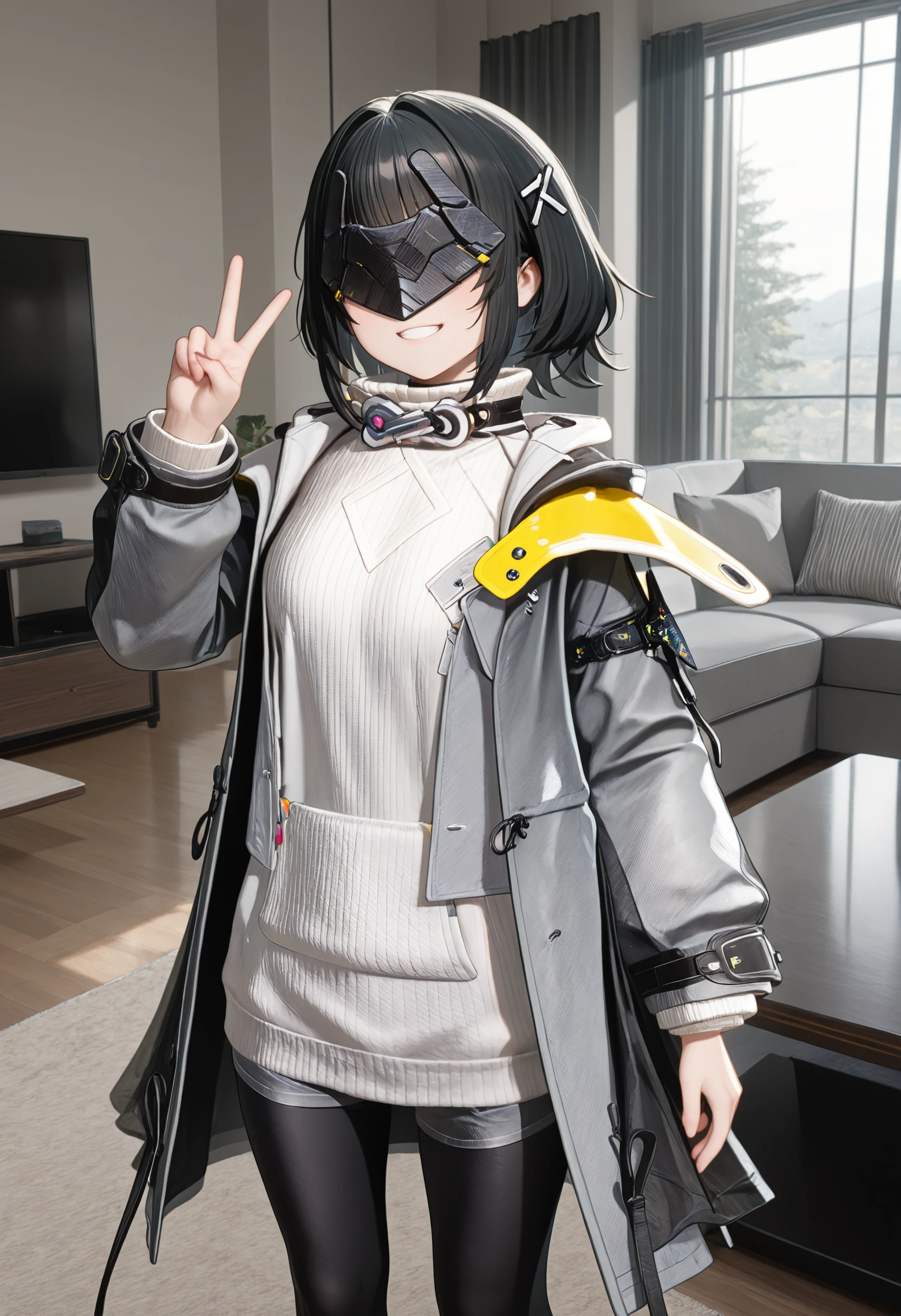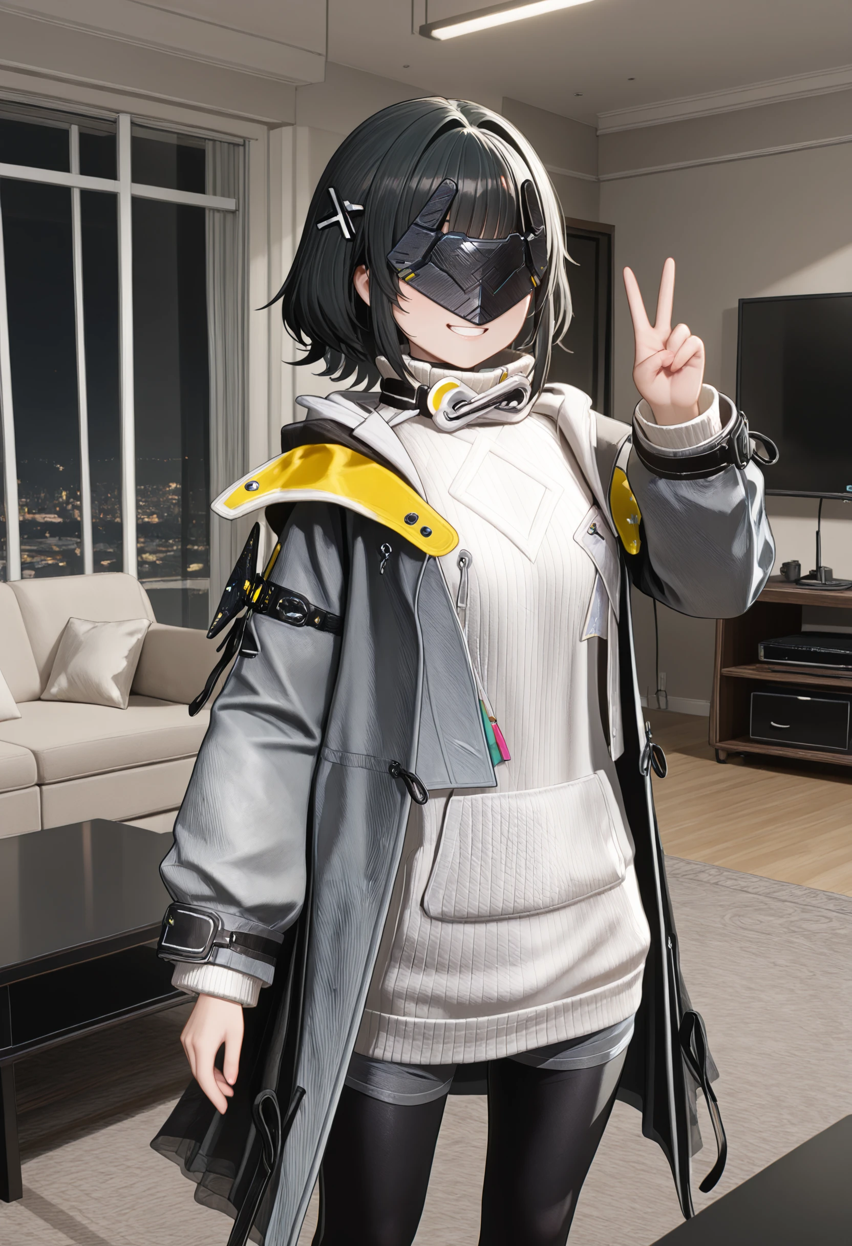 black collar, long white sweater, high collar, metal pendant, gray jacket, open jacket, hooded jacket, yellow jacket details, jacket ornaments, double jacket, tassels, sweater pocket, gray shorts, black leggings, black shoes