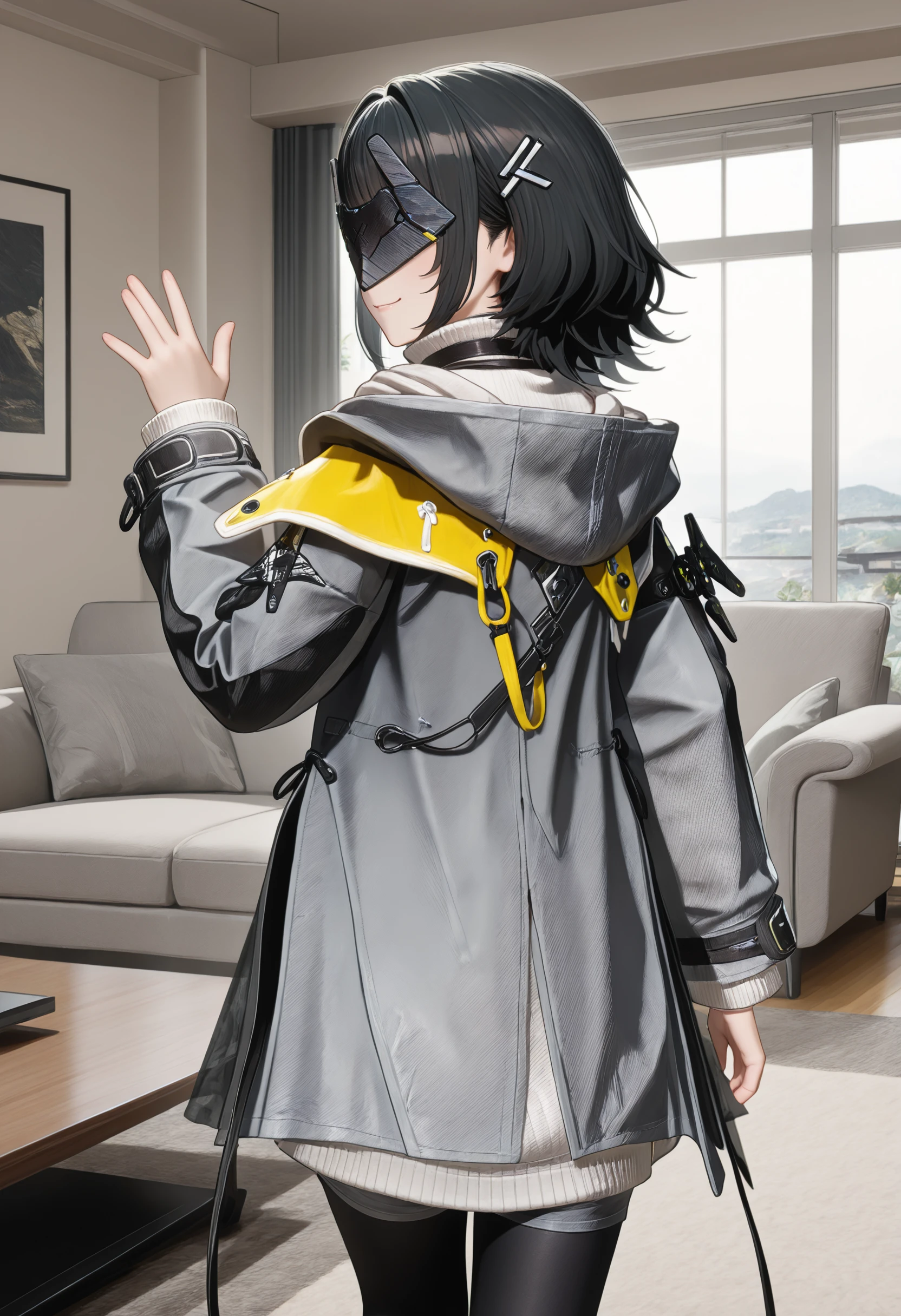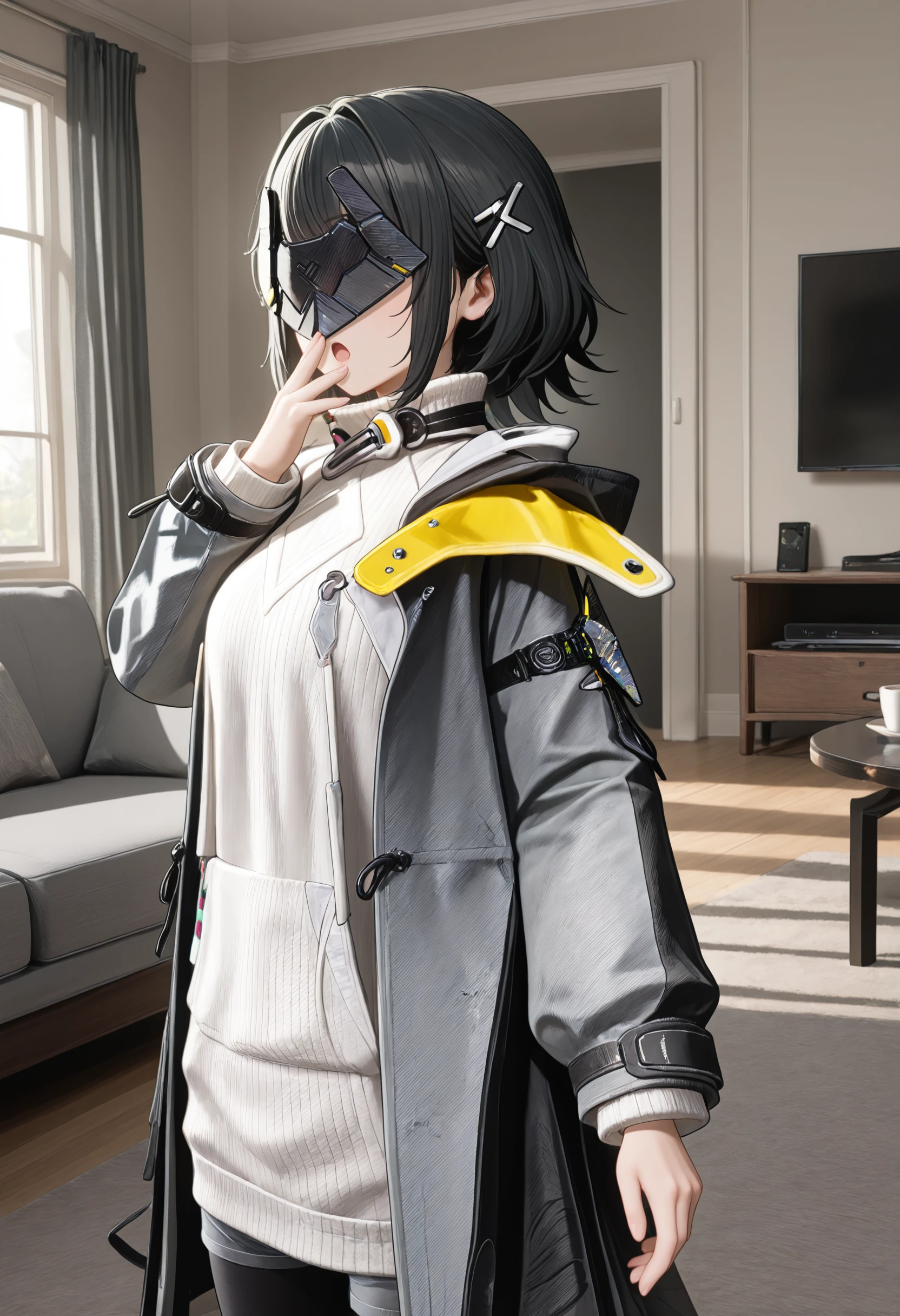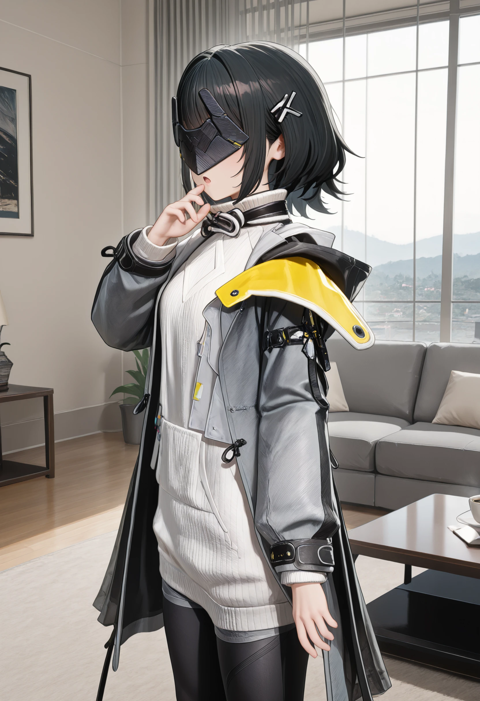 endfield style, 1girl, female endministrator, black hair, short hair, hair clip, metal face mask,