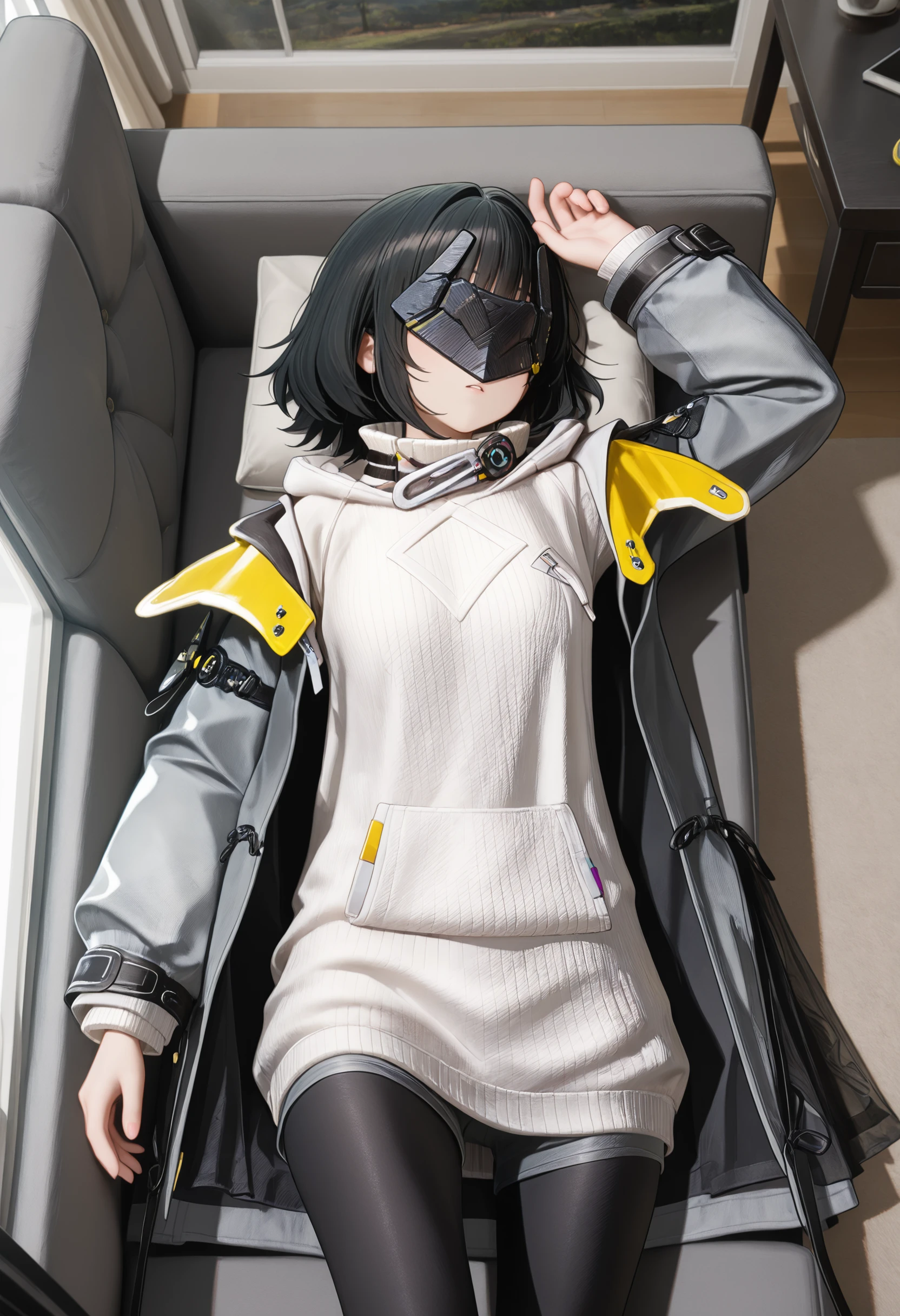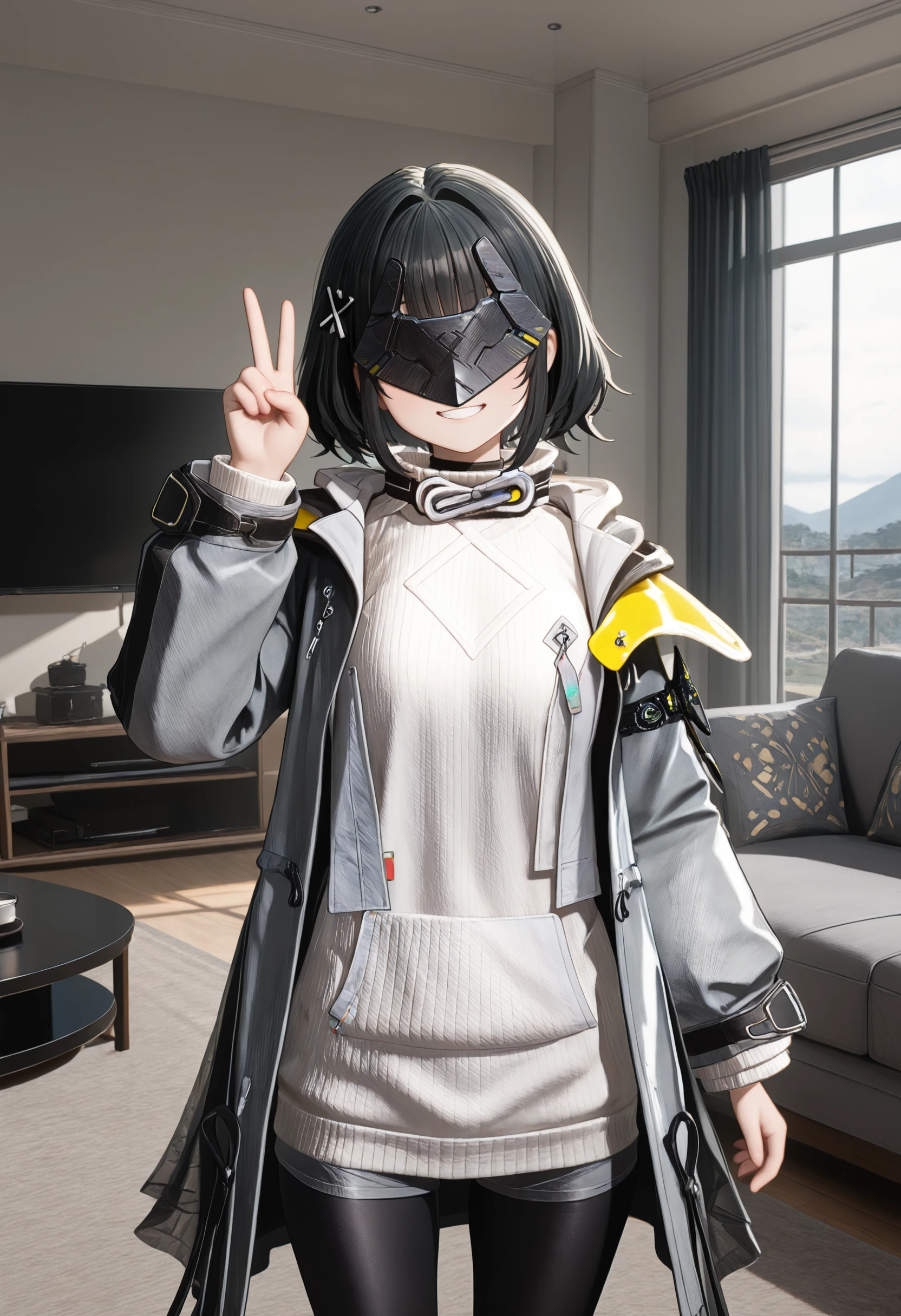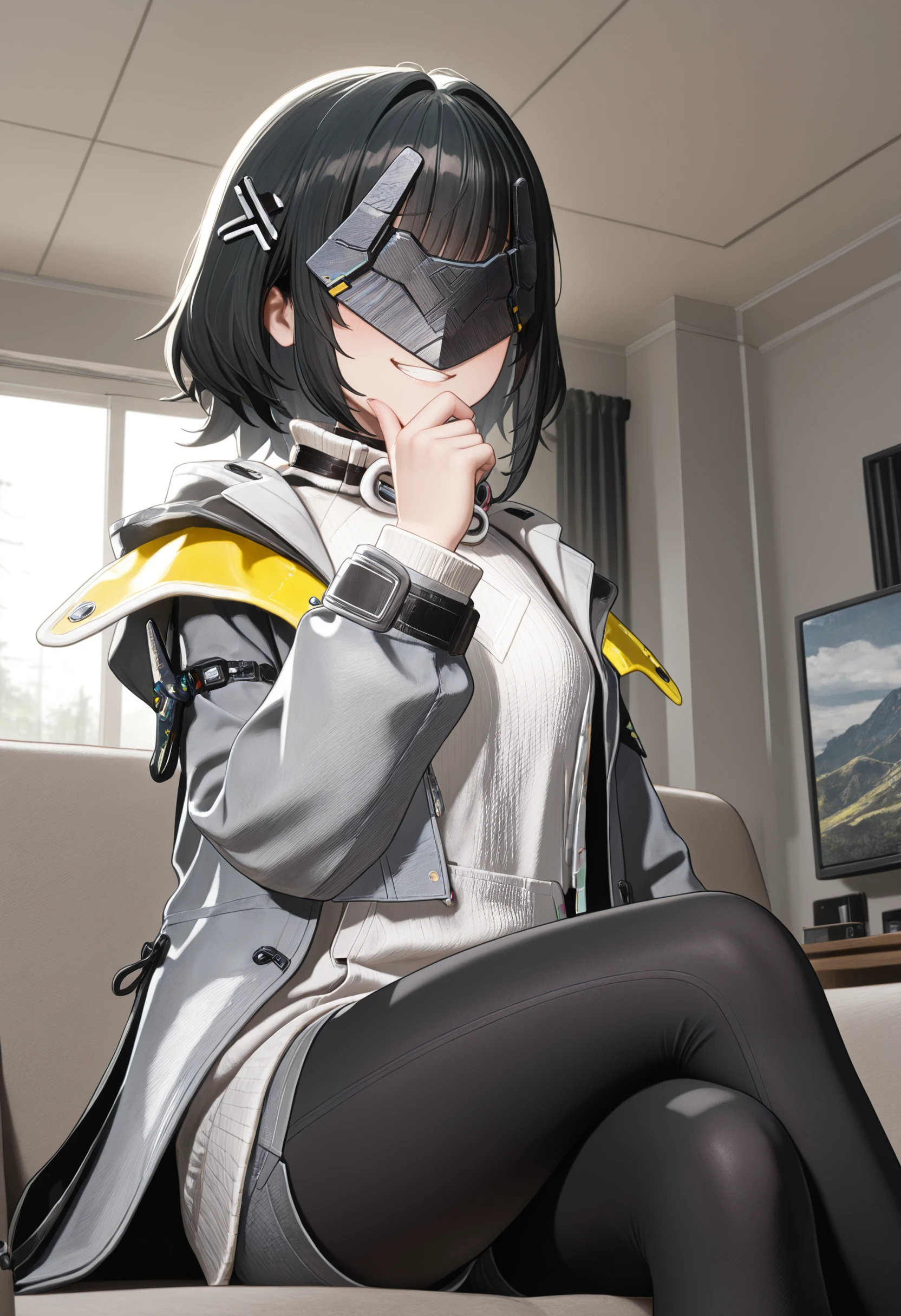 endfield style, 1girl, female endministrator, black hair, short hair, hair clip, metal face mask,
