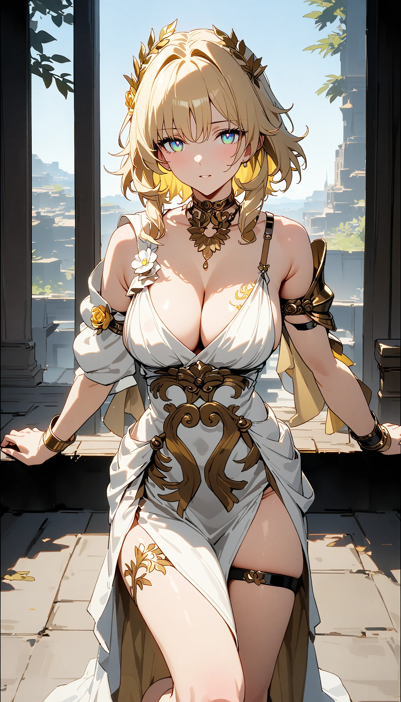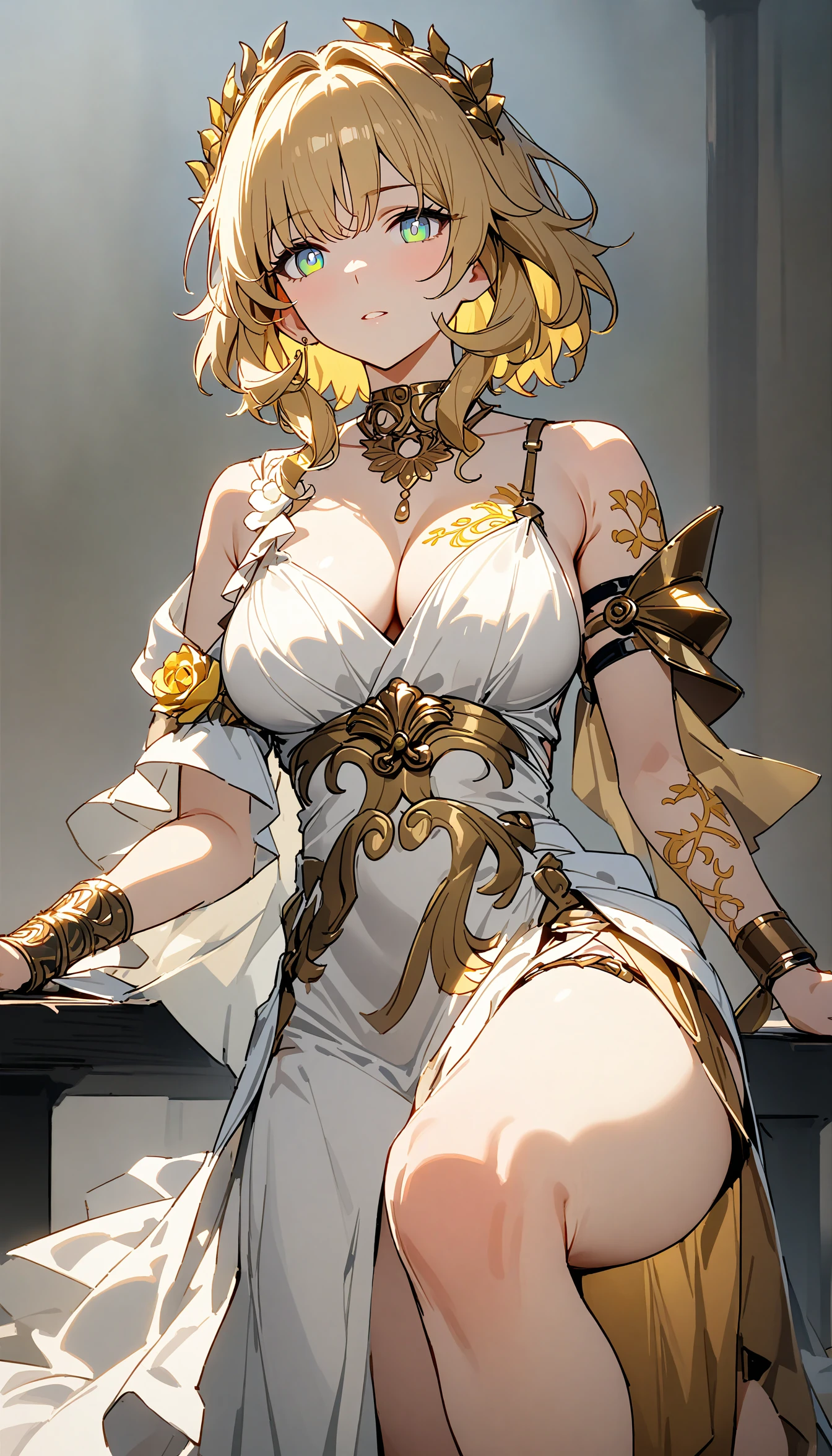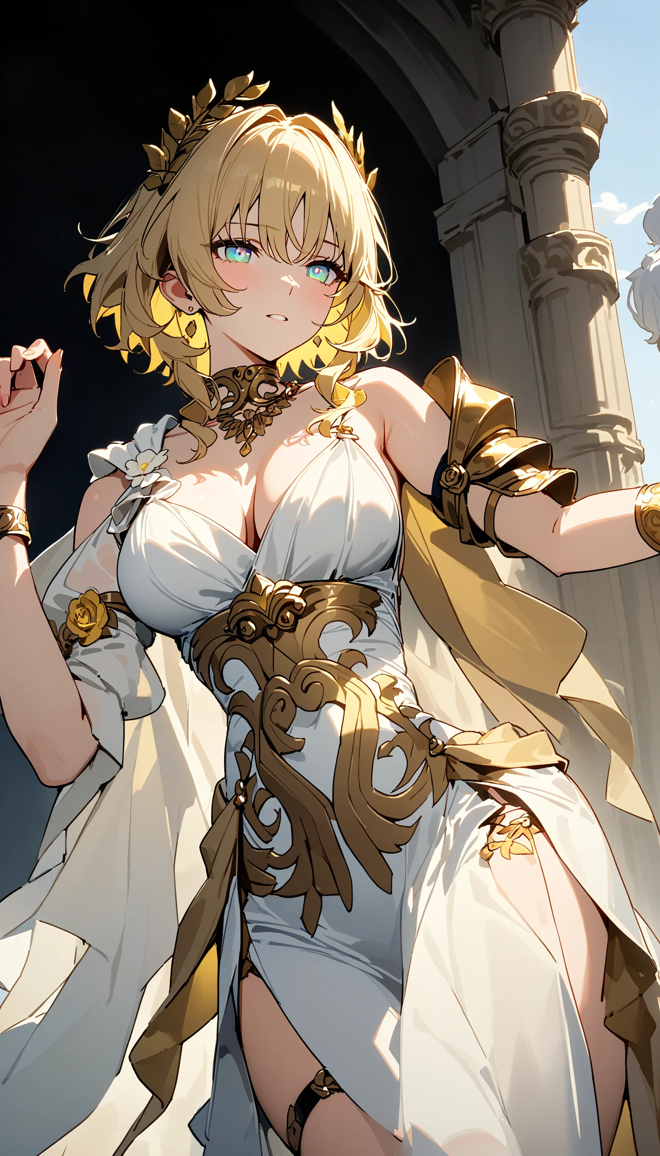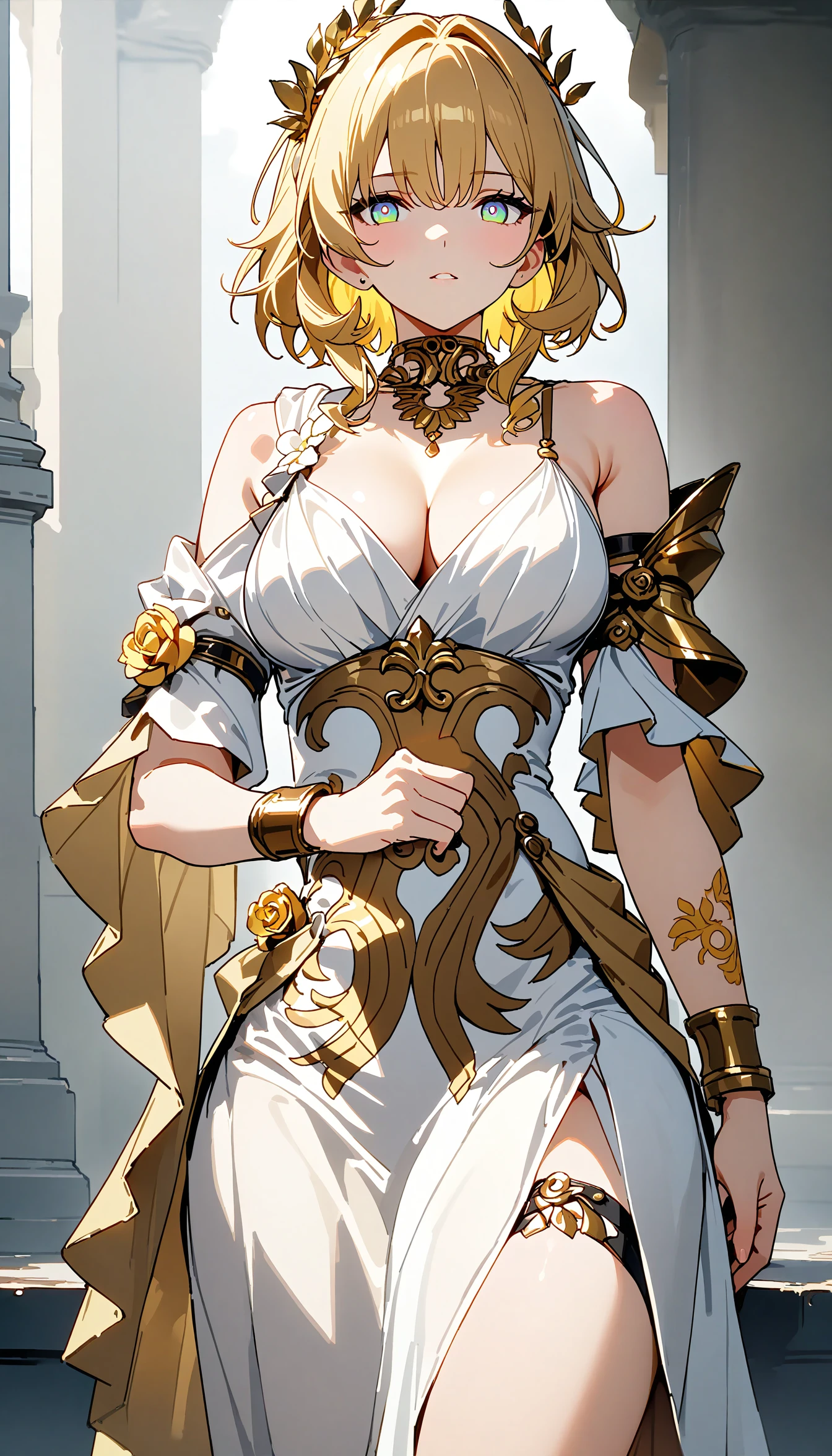 (best quality,8K, masterpiece :1.3),anime,Aglaea, none pupil, (green eyes:0.5), pure eyes, goddess, mature, white dress, white flower, golden flower ornament, straped dress, long skirt, white skirt, side slit, detached sleeves, gold trim, greek clothes, arm armor, brown armor, wristband, golden tattoo, medium breasts, (cleavage:0.6), necklace, bare shoulders, gold rose, pleated sleeves, short sleeves, single sleeve, (thigh strap:0.5),