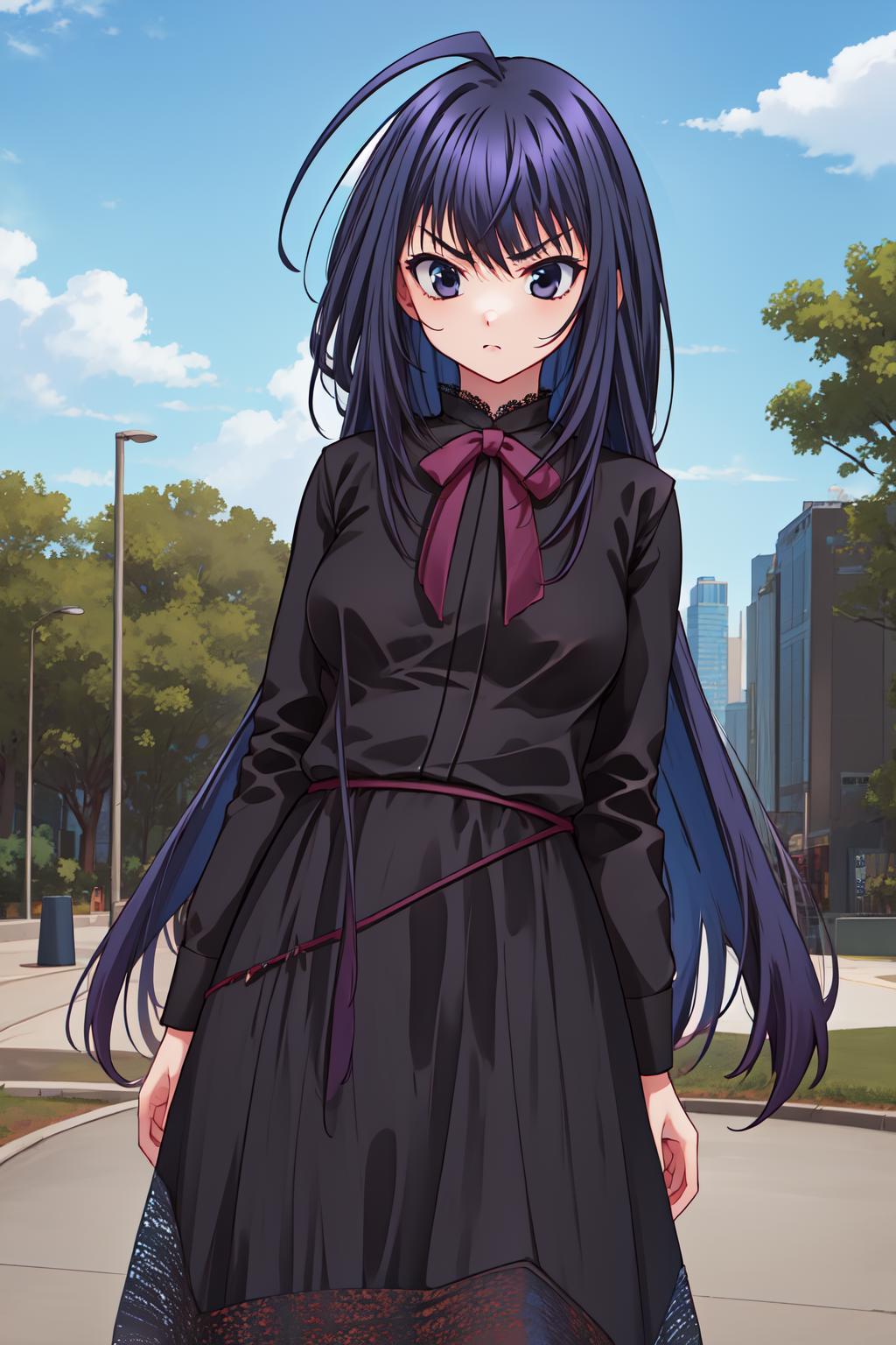 ever17_tugumi, black eyes, black hair, long hair, very long hair, ahoge, ribbon, bow, long sleeves, dress, black dress, black skirt, long skirt, lace,
