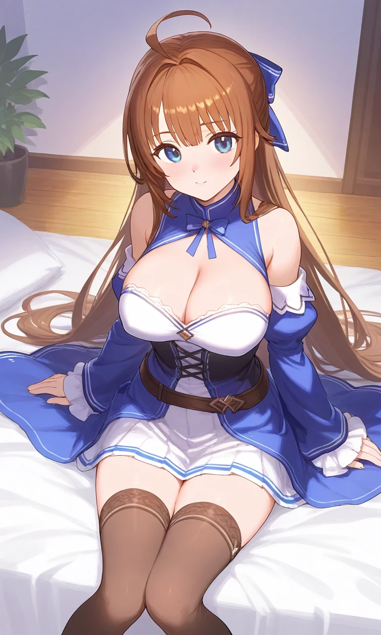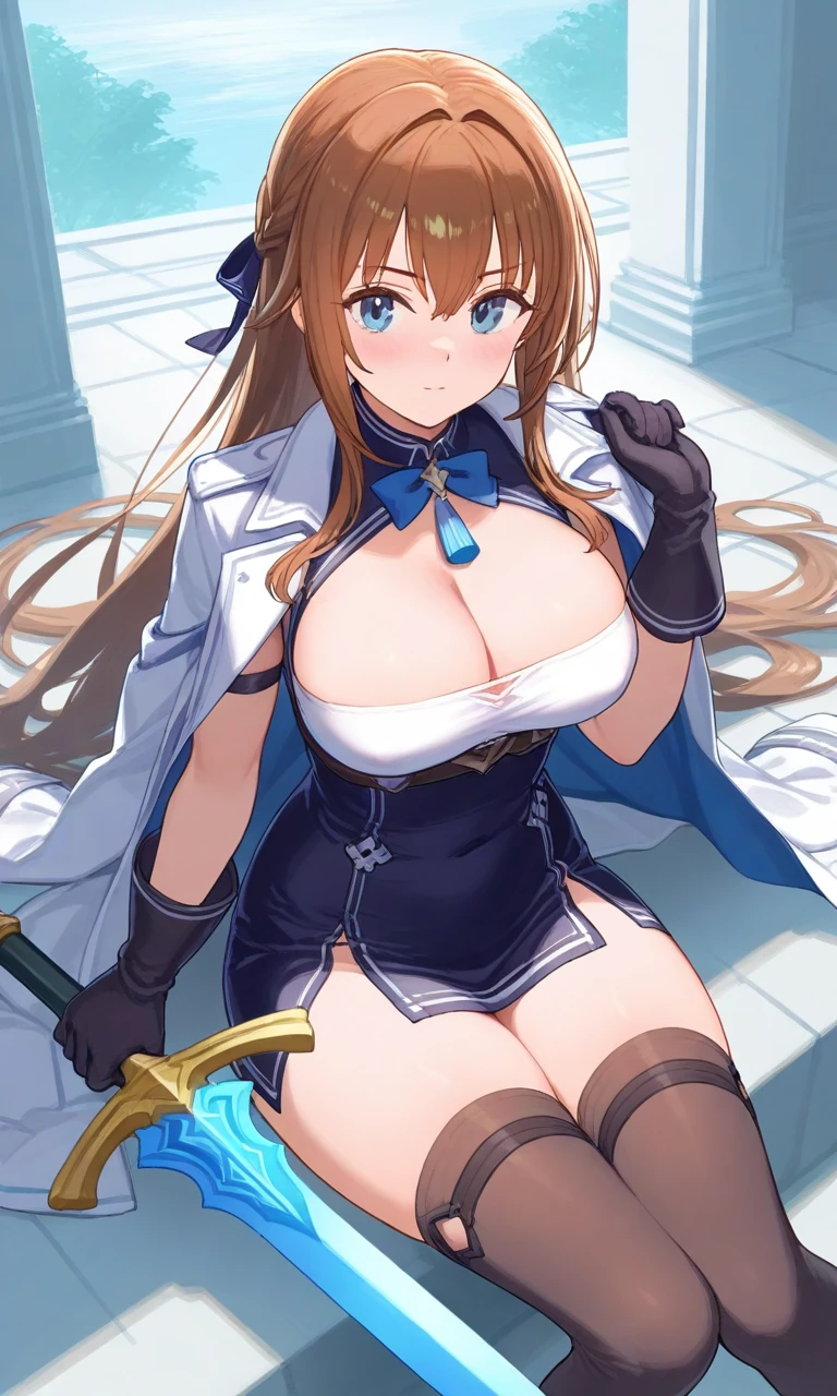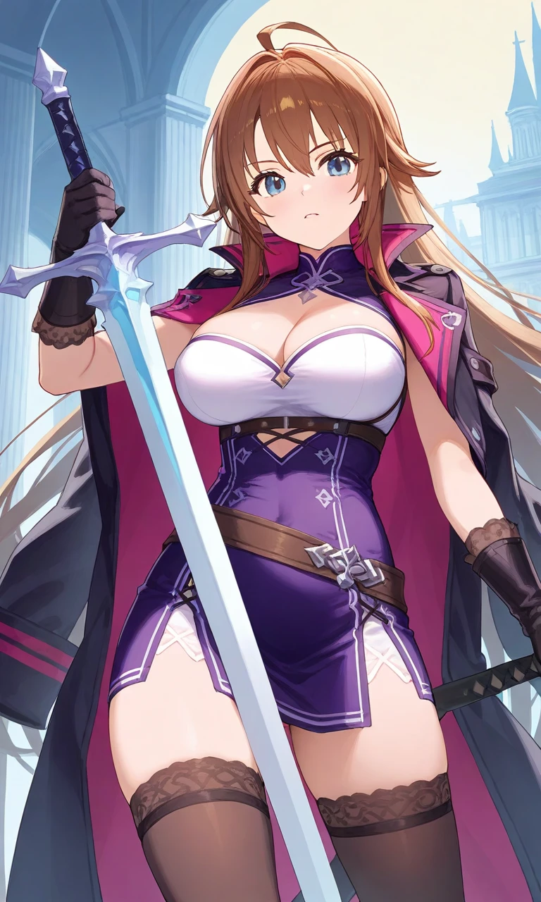 1girl, breasts, sword, weapon, gloves, blue eyes, long hair, solo, thighhighs, large breasts, holding sword, holding, holding weapon, cleavage, brown hair, jacket on shoulders, black gloves, dress