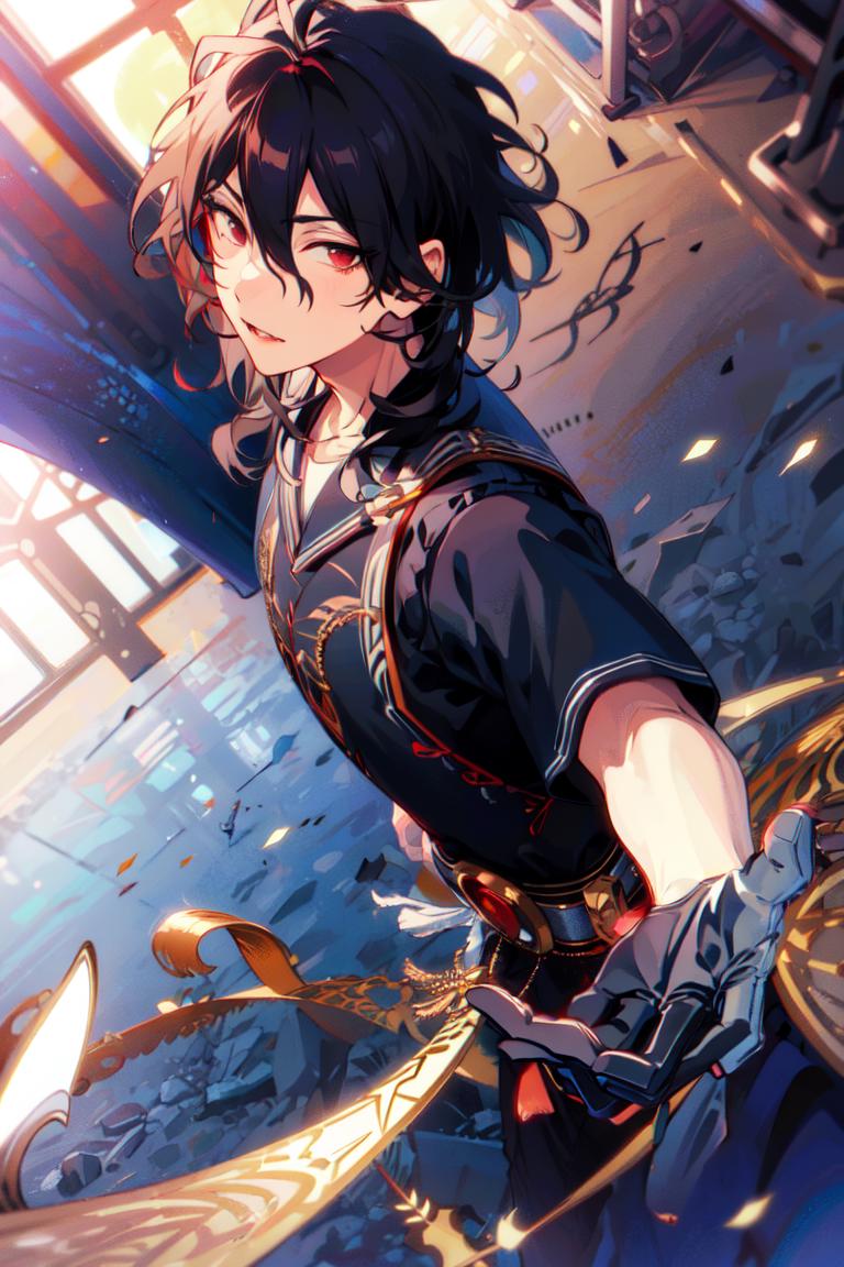 1boy,male focus, black hair, red eyes, reisu, belt, blue pants, black striped shirt, earrings, necklace