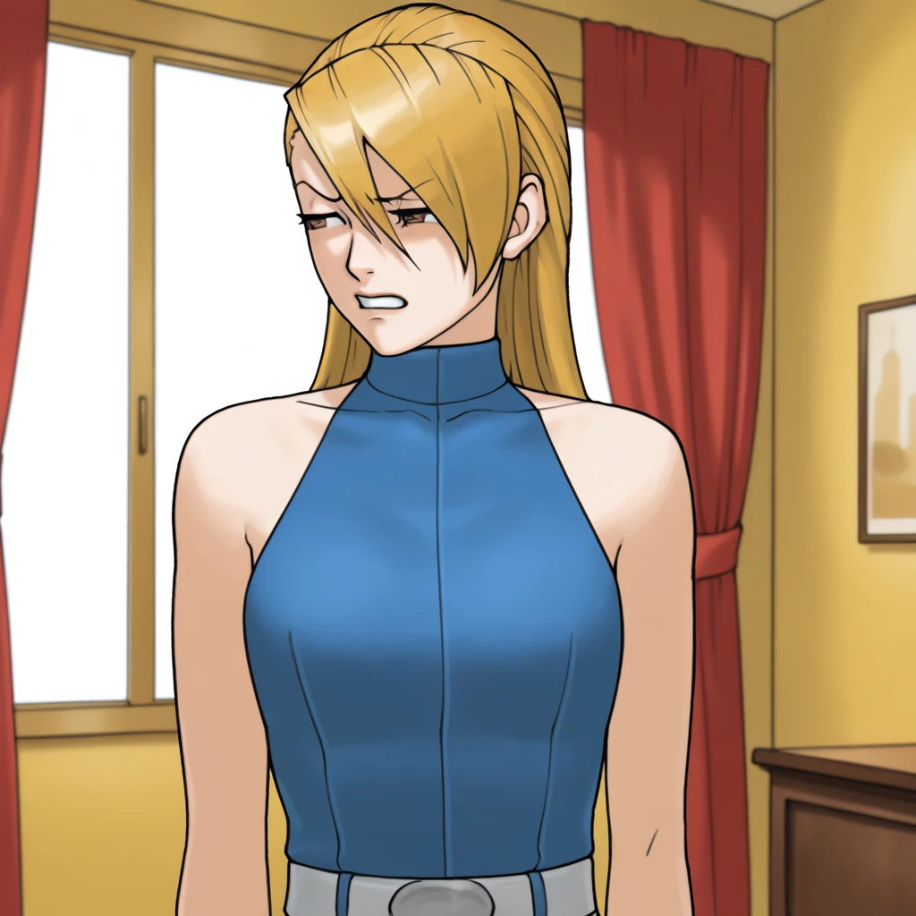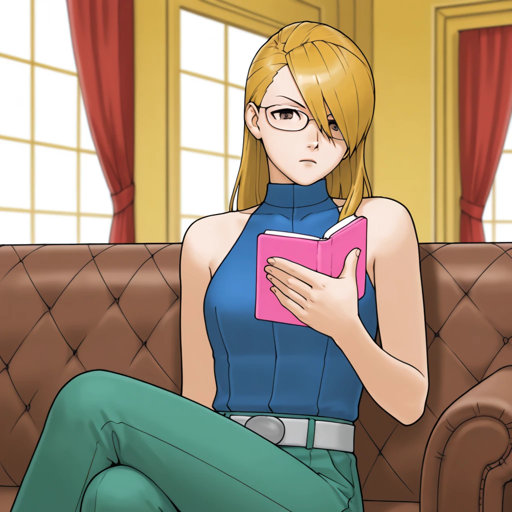 long hair, blue sleeveless turtleneck, white belt, green pants