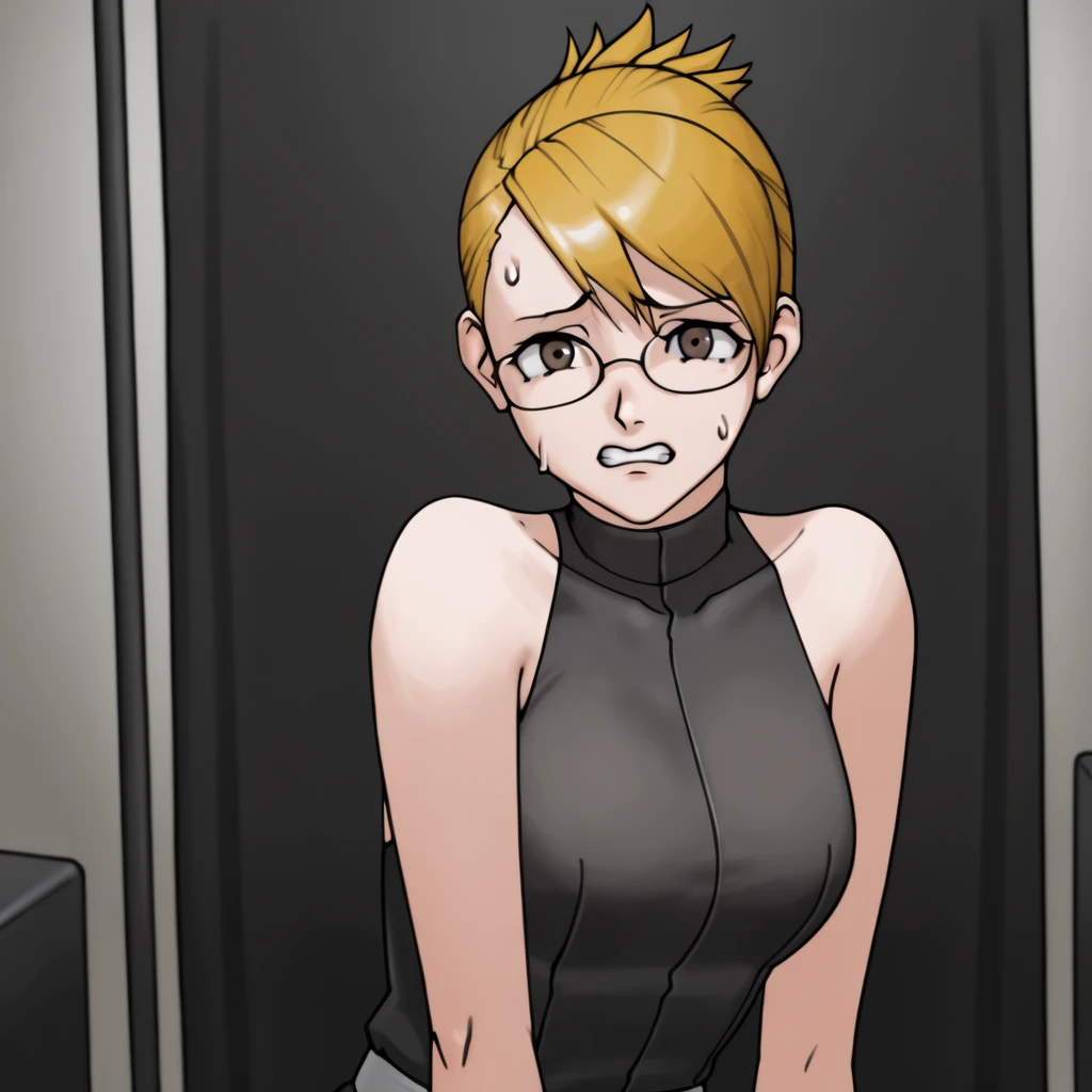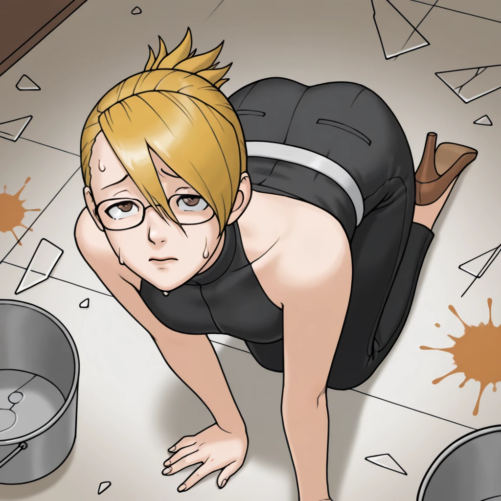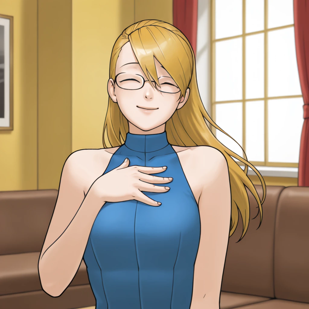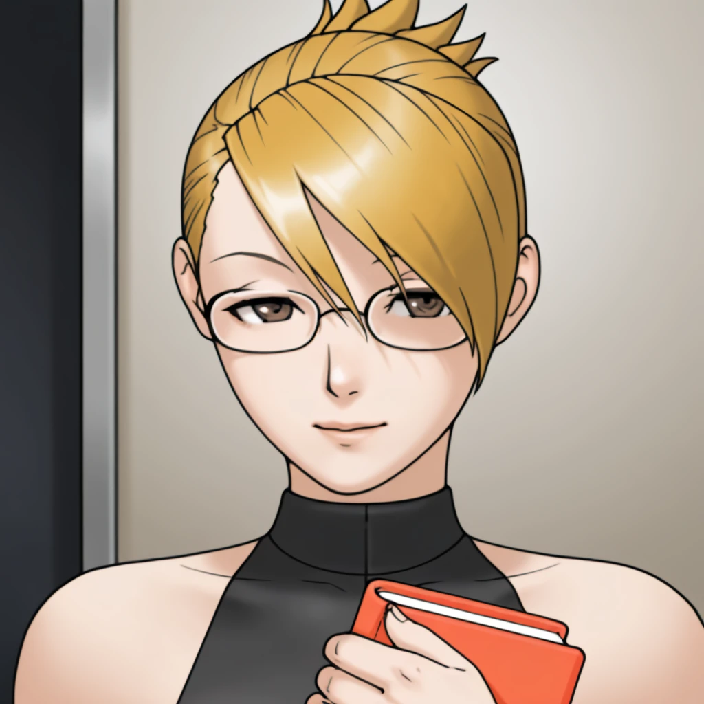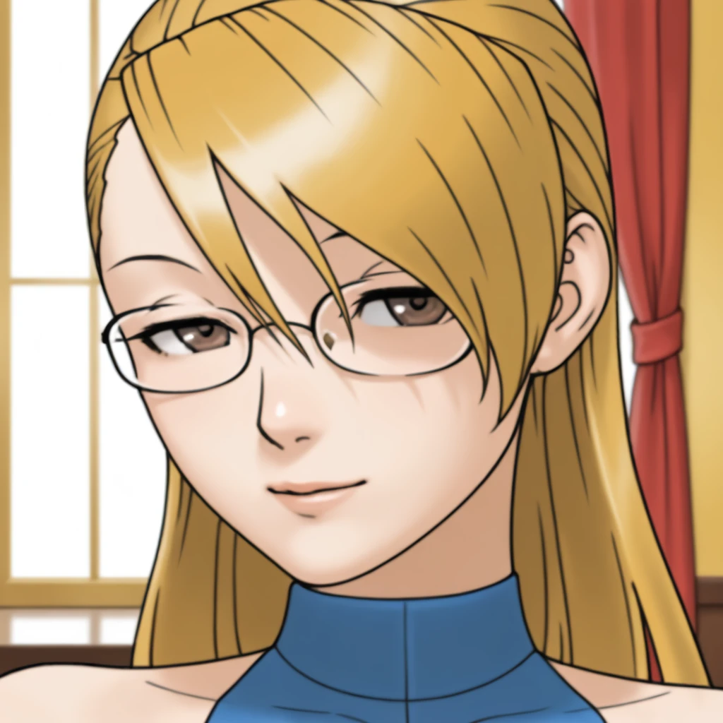 blonde hair, asymmetrical bangs, brown eyes, glasses