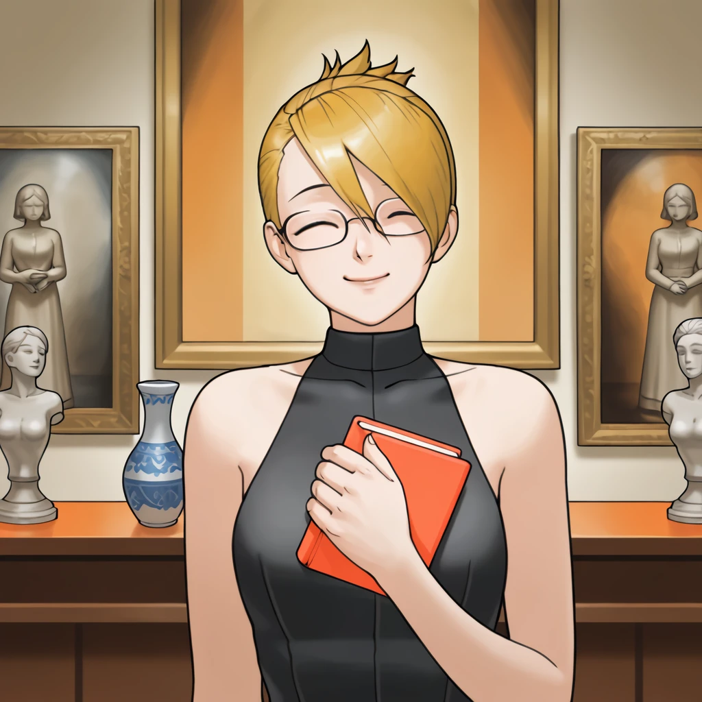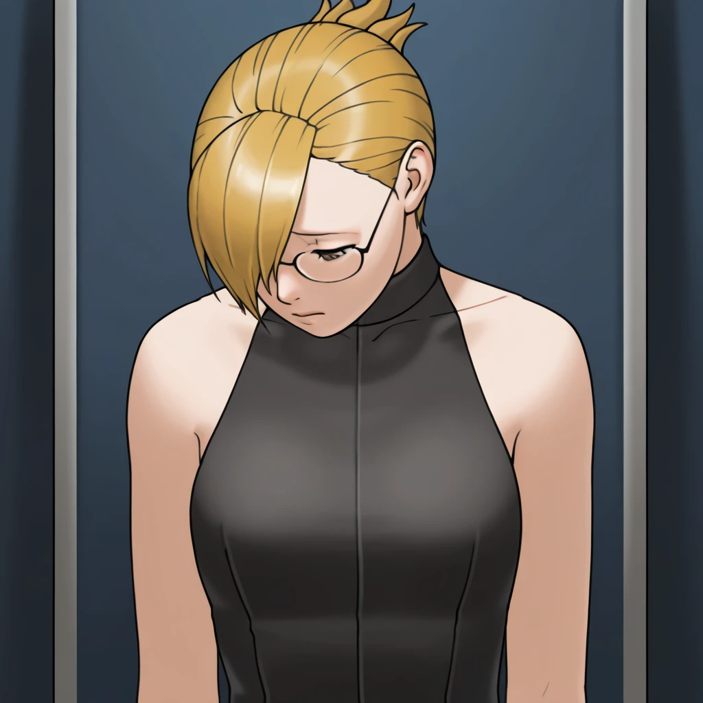 General Appearance Tags: blonde hair, asymmetrical bangs, brown eyes, glasses