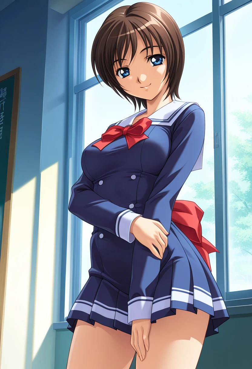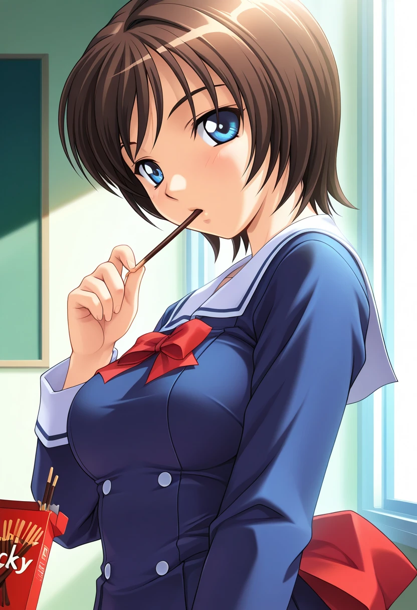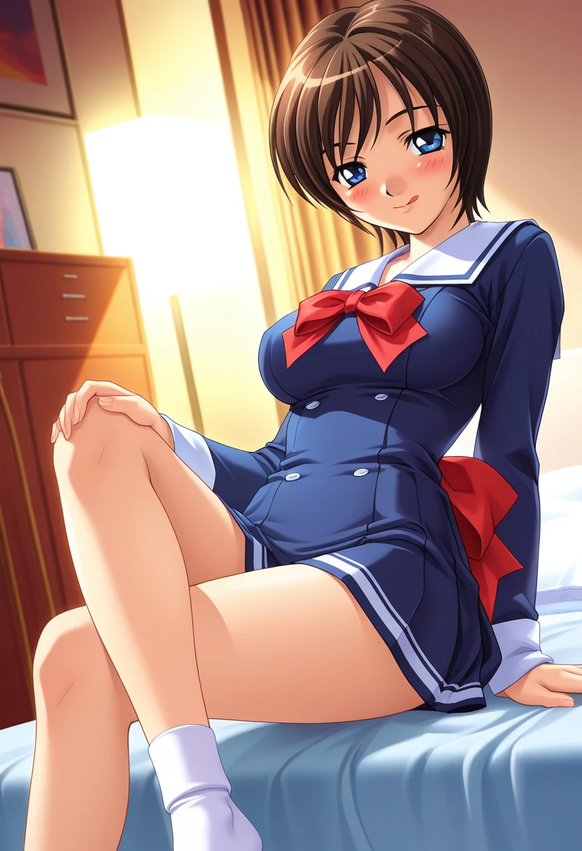 school uniform, white sailor collar, red bowtie, blue sailor dress, pleated dress, short dress, long sleeves, buttons, red back bow, white ankle socks, sneakers,