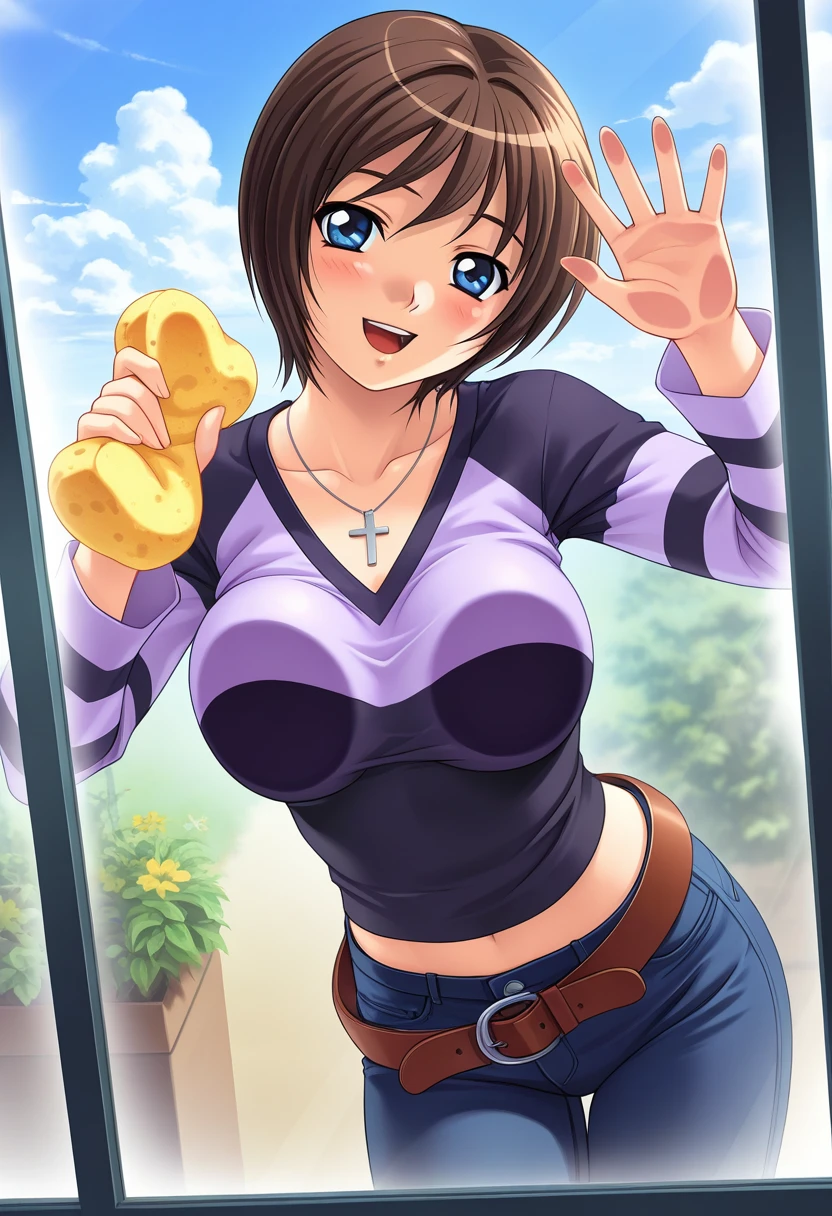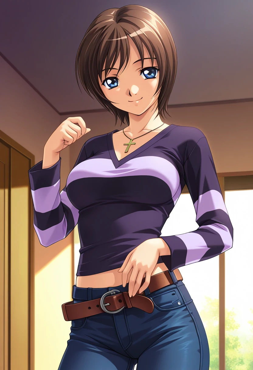 casual, cross necklace, v-neck, crop top, two-tone shirt, striped shirt, black shirt, light purple shirt, long sleeves, striped sleeves, black sleeves, light purple sleeves, midriff peek, brown belt, loose belt, denim, jeans, sneakers,