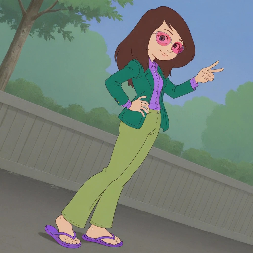 (official style, screencap:1.2), flat color, light brown long hair, classic green blazer, purple blouse peeks, pink sunglasses, light green trousers offer, purple flip-flops,light smile, cute, dutch angle, cute pose, looking at viewer, one hand on hips, v, from side, solo, dynamic pose, cowboy shot, head tilt, outdoors, blue sky, trees,