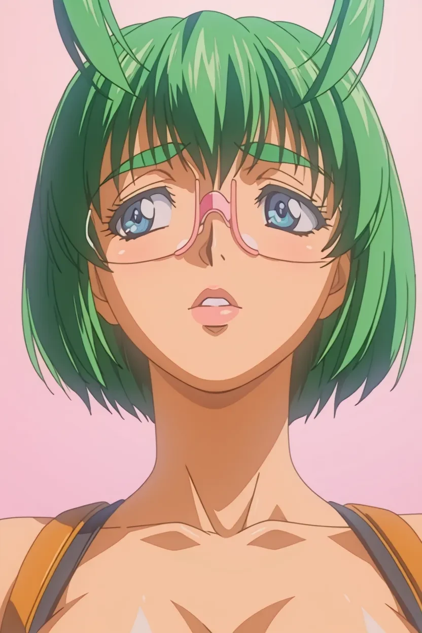 1girl, Chiharu Kunisaki (M.E.M. Lost Virginity), green_hair, short_hair, blue_eyes, glasses, lips, glossy_lips, , M.E.M. Lost Virginity_art_style, HD, Hi-res, No-Flaws, Excellent_Quality