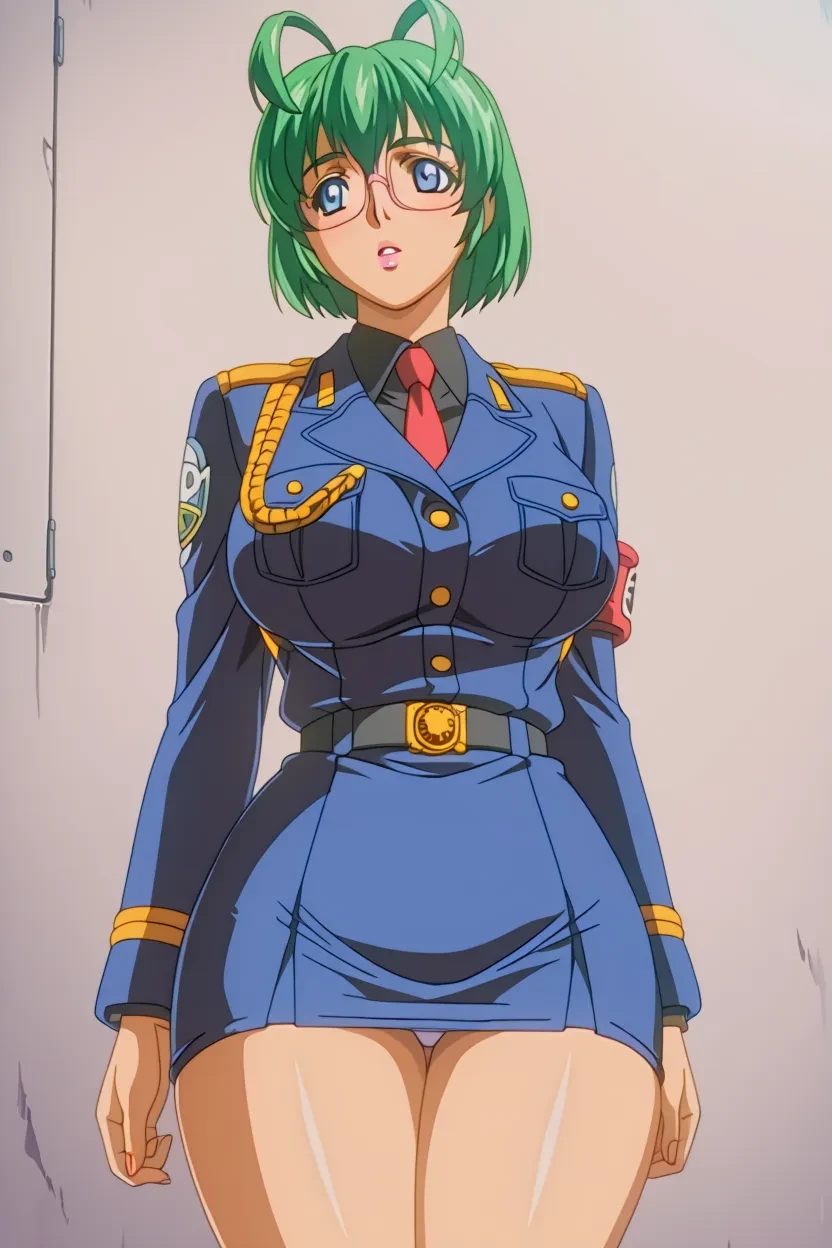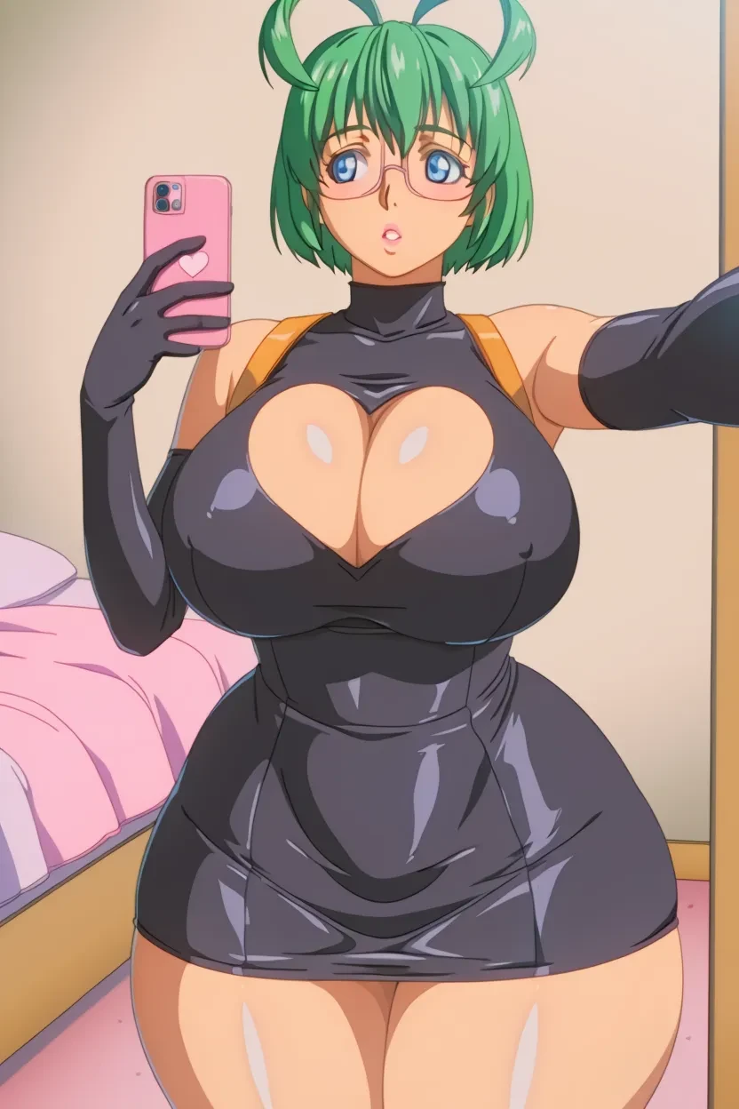 1girl, Chiharu Kunisaki (M.E.M. Lost Virginity), green_hair, short_hair, blue_eyes, glasses, lips, glossy_lips, , extremely , curvy, wide , thick thighs, M.E.M. Lost Virginity_art_style, HD, Hi-res, No-Flaws, Excellent_Quality