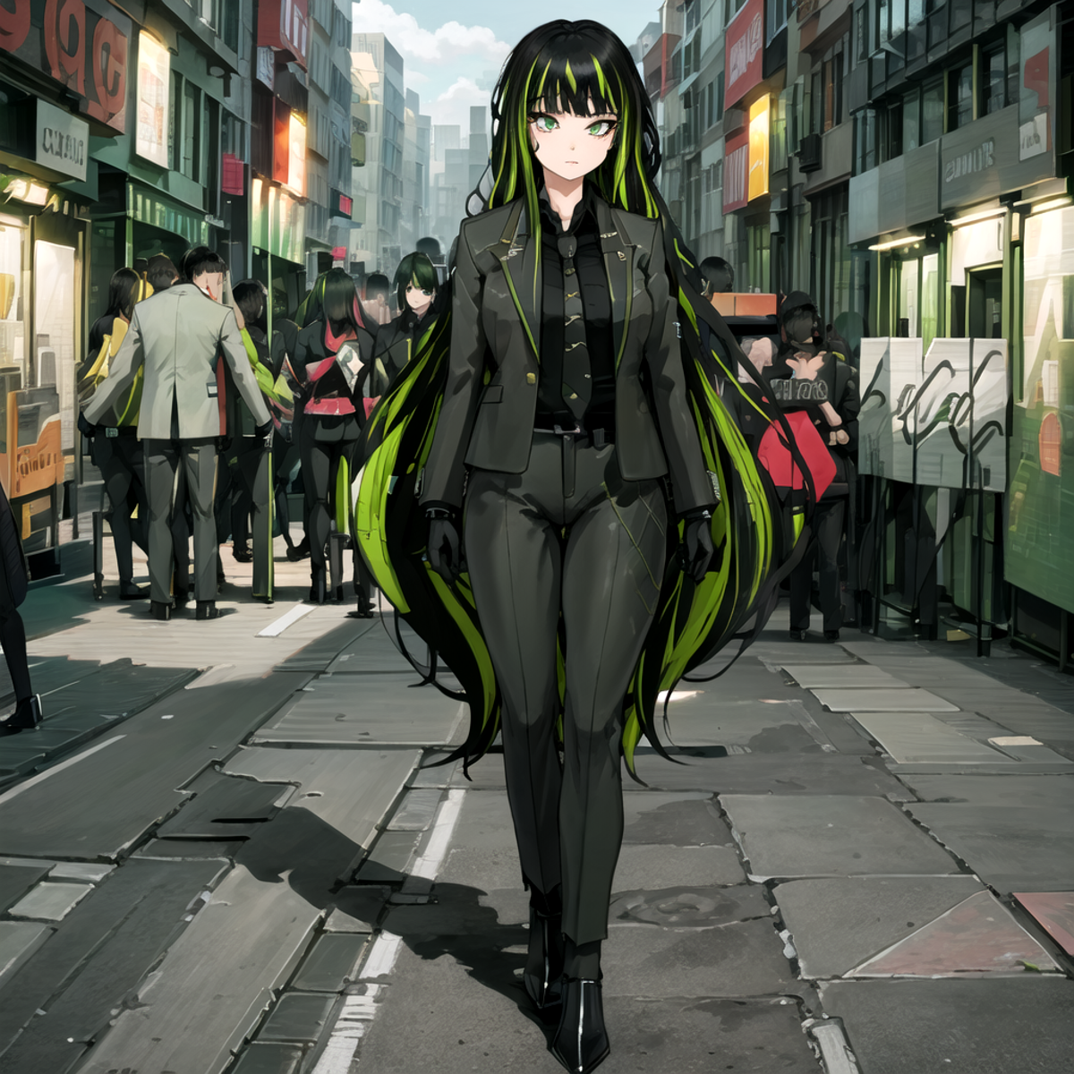 the girl wearing a black suit and green hair, long hair, solo, multicolored hair, 1girl, green hair, streaked hair, gloves, formal, green eyes, black hair, black gloves, suit, pants, black footwear, necktie, full body, city background, very long hair, jacket, outdoors,