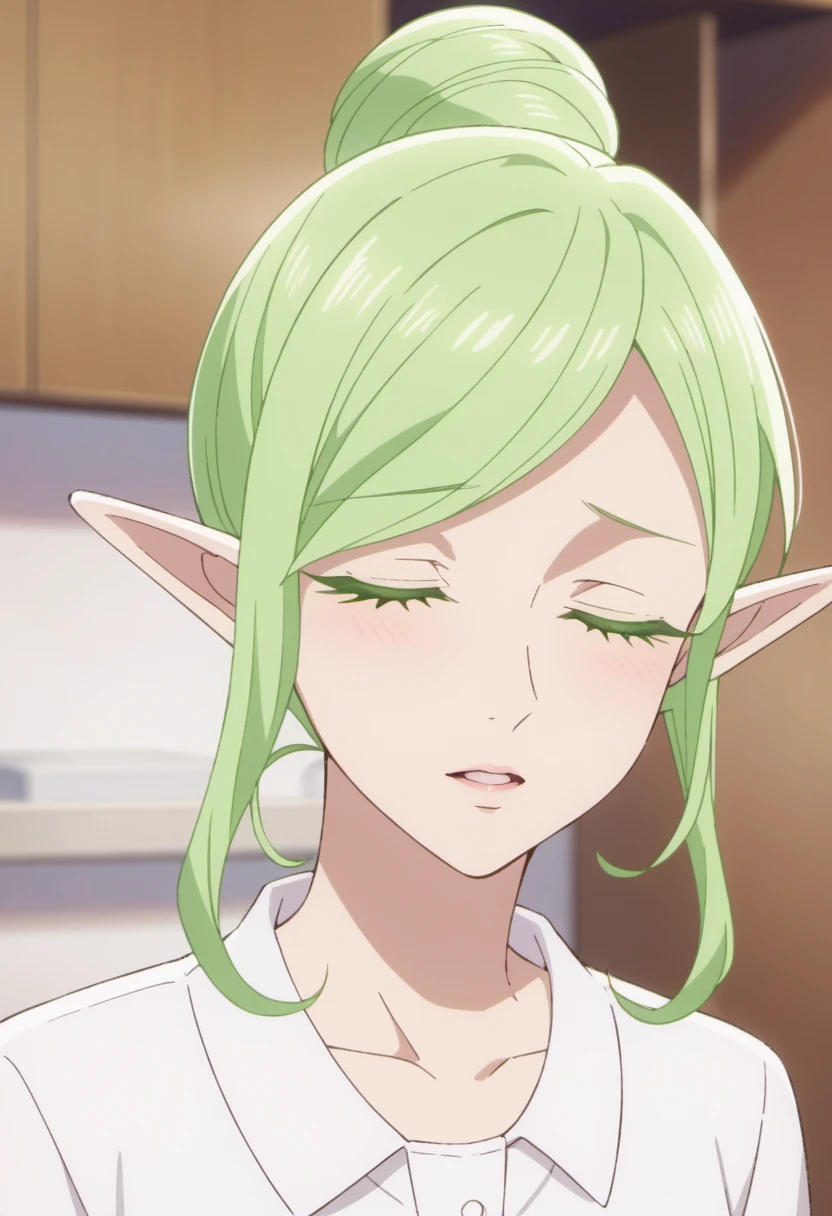 Trigger Words: light ( toumei otoko to ningen onna), pointy ears, hair bun, single hair bun, green hair, red eyes