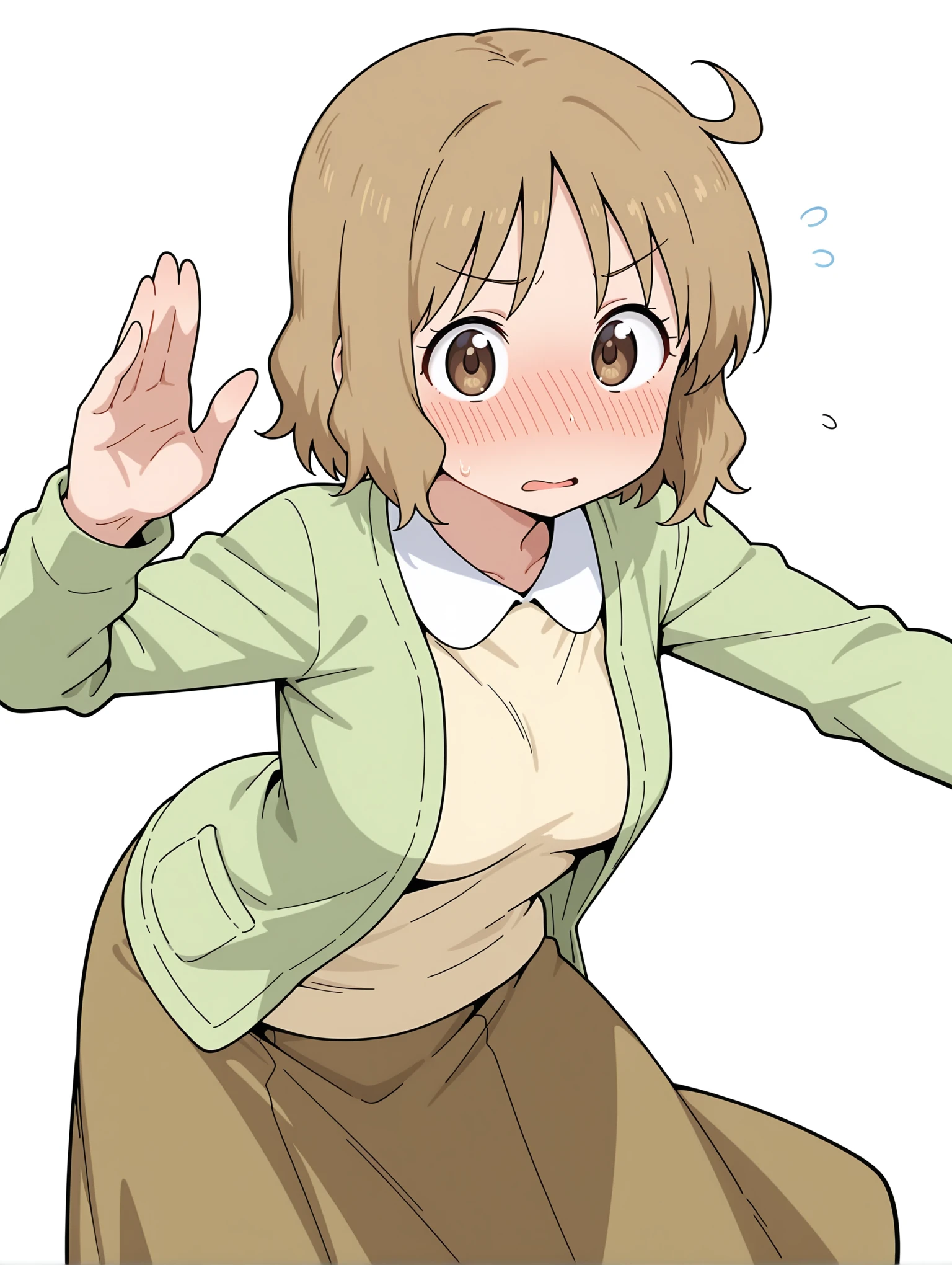 collared_shirt,green jacket,cardigan,long_sleeves,long_skirt,slippers,