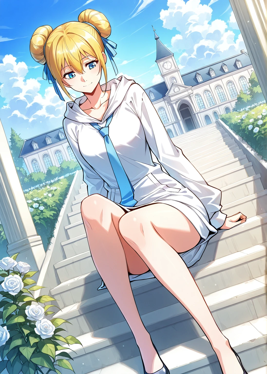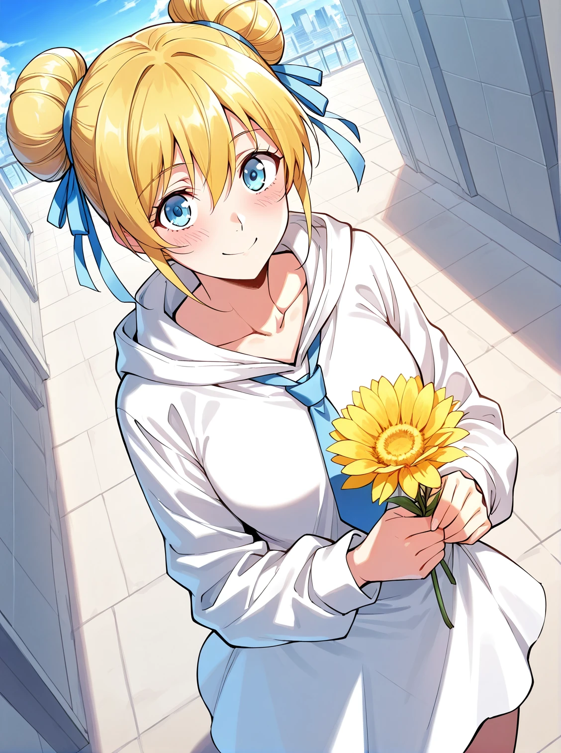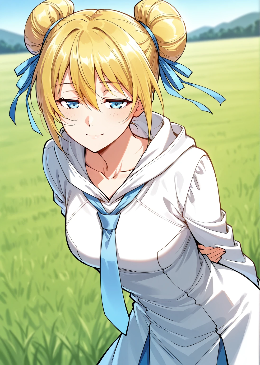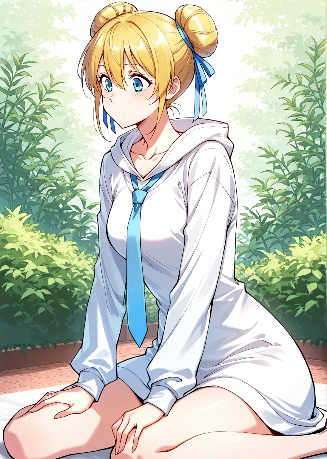 white dress, ribbon, hair ribbon, blue ribbon, blue necktie, short hair, hair bun, single hair bun, double bun, white hoodie, hair between eyes, collarbone, white sleeves, long sleeves