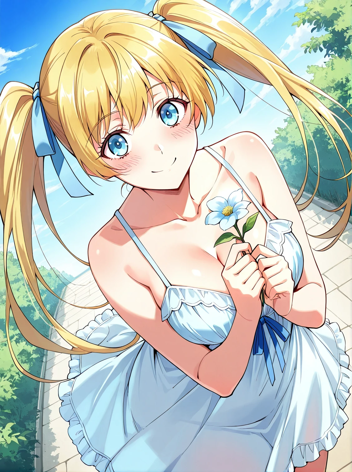 nightgown, sundress, collarbone, bare shoulders, blue ribbon, cleavage, twintails