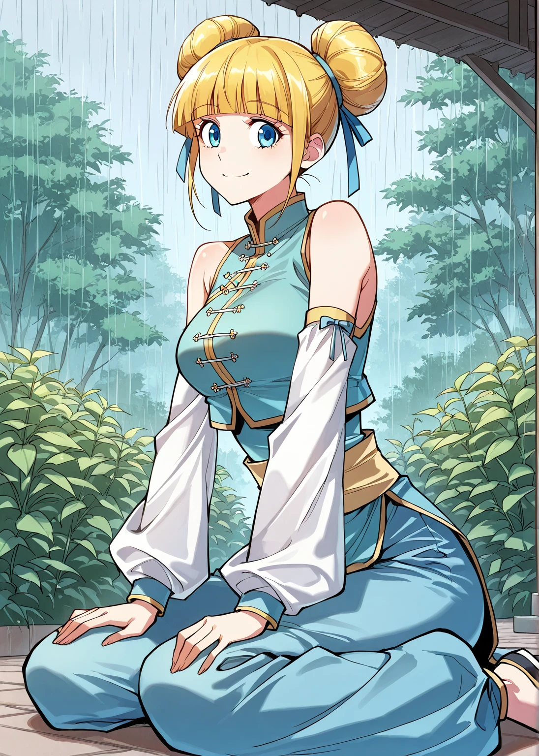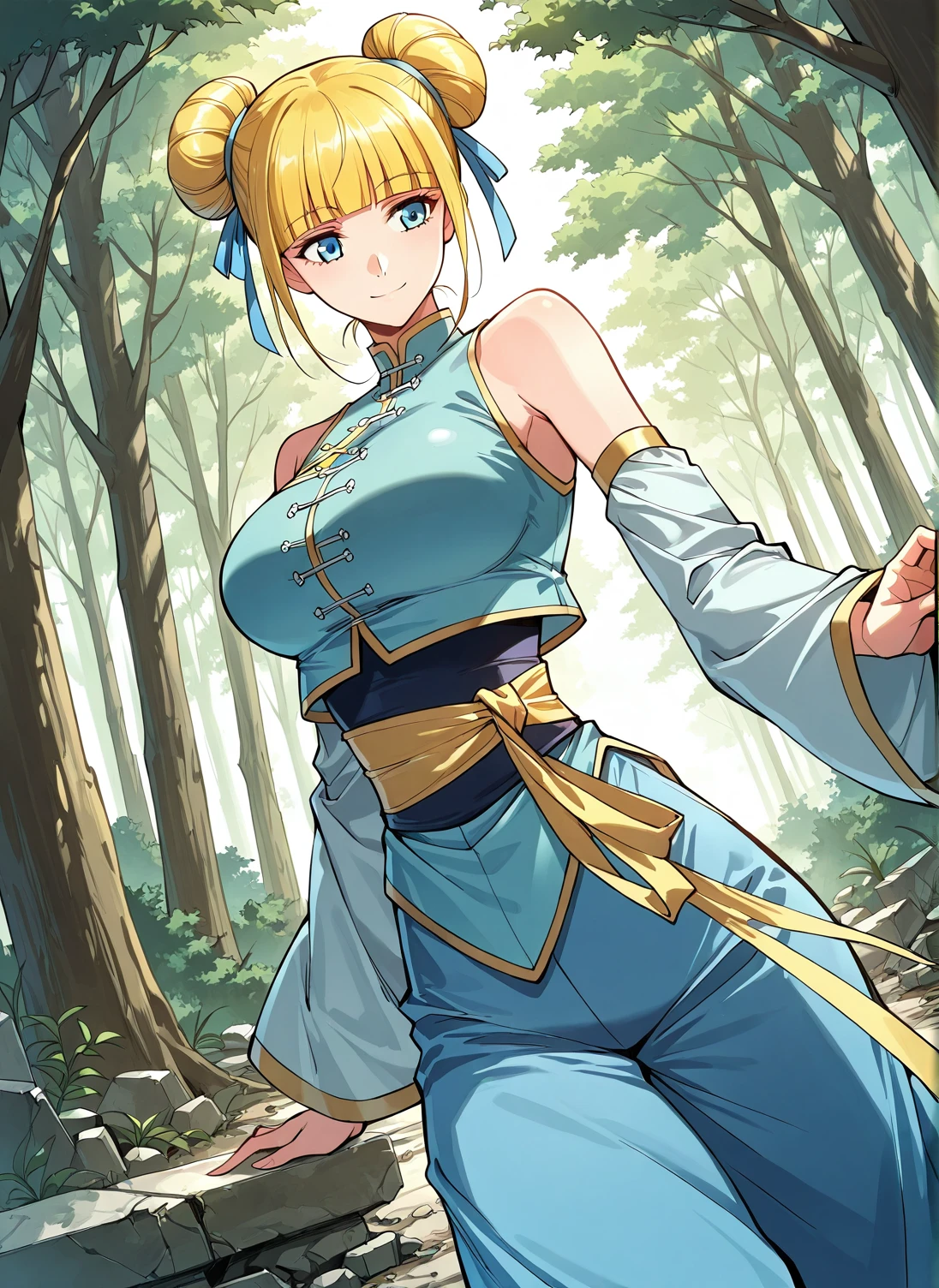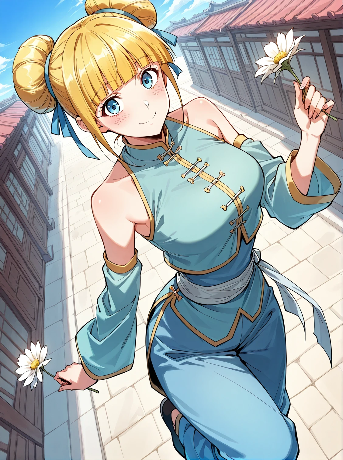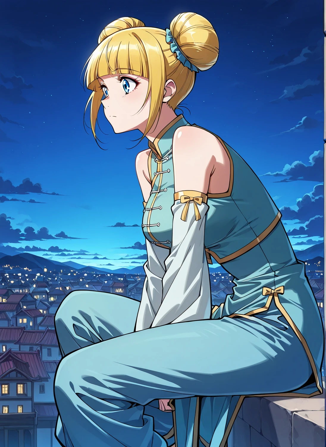 chinese clothes, blint bangs, bare shoulders, detached sleeves, hair bun, double bun, blunt bangs, blue pants, baggy pants