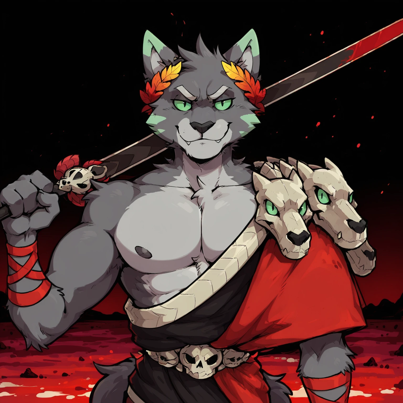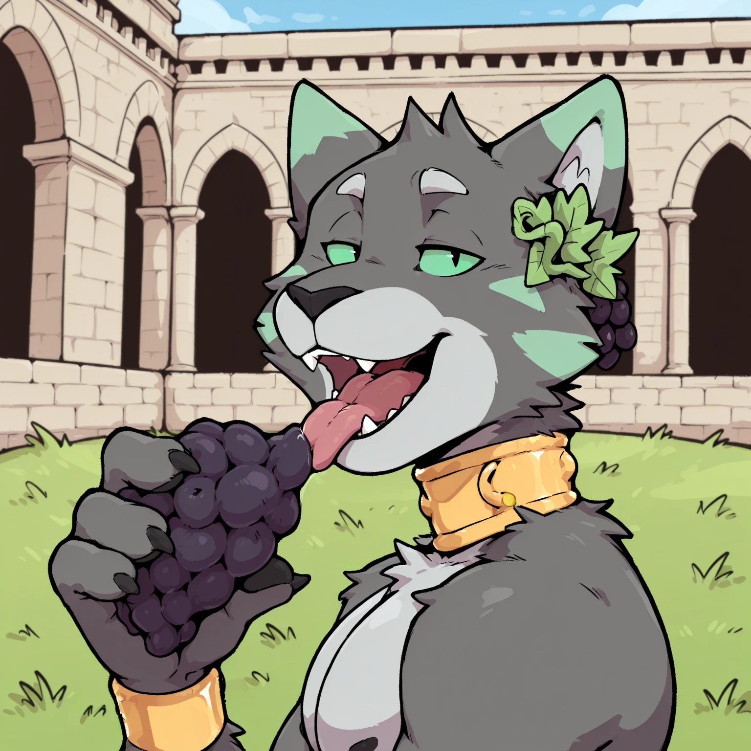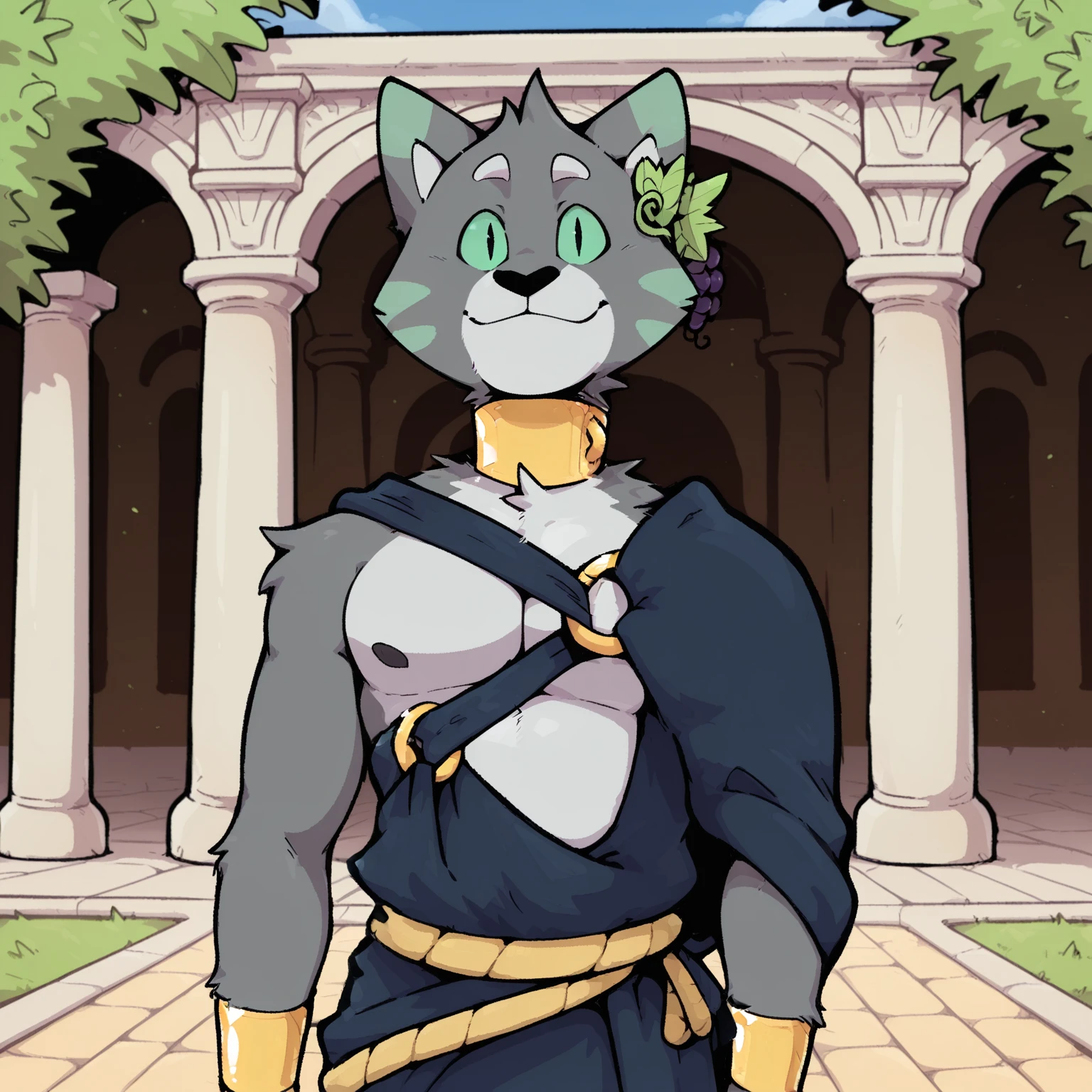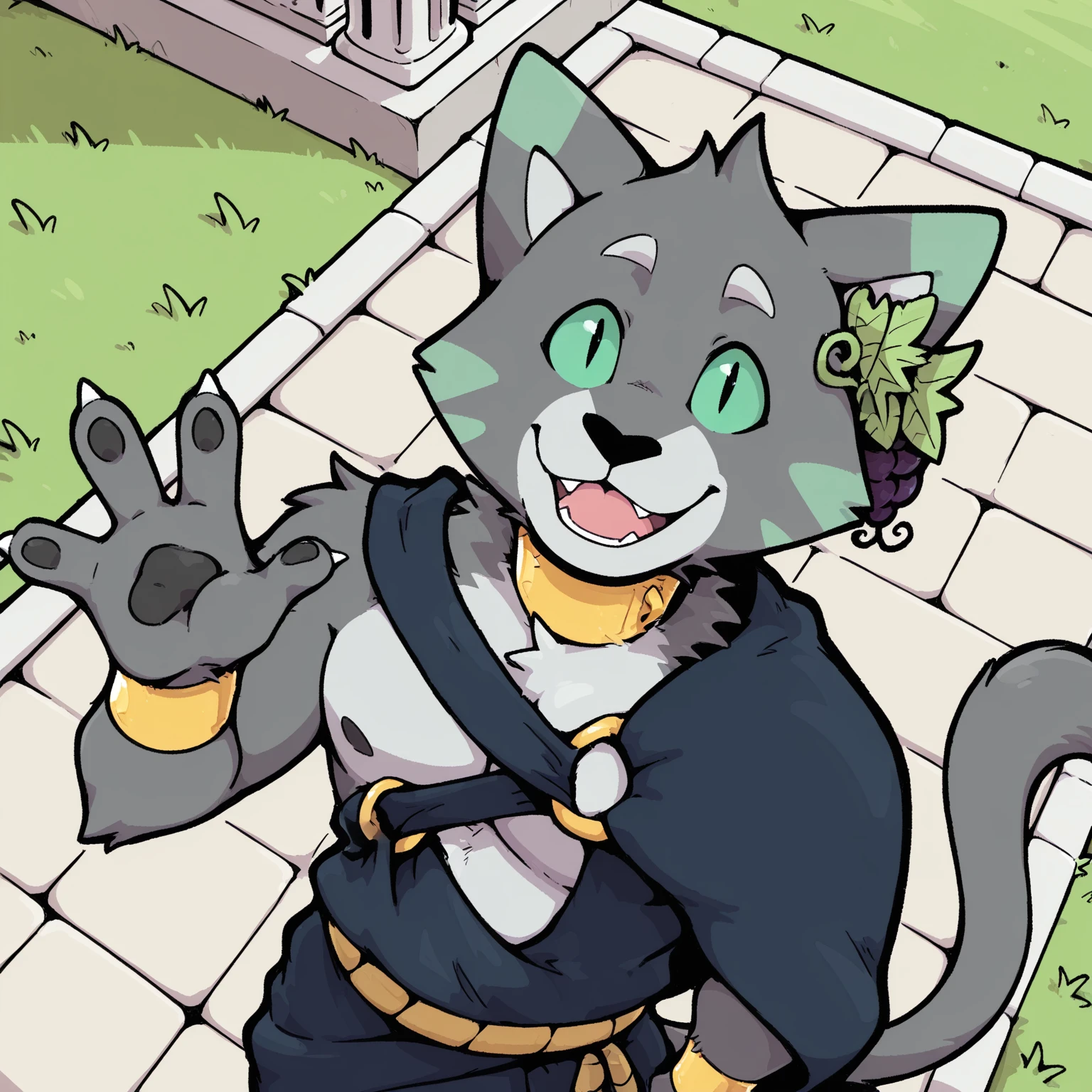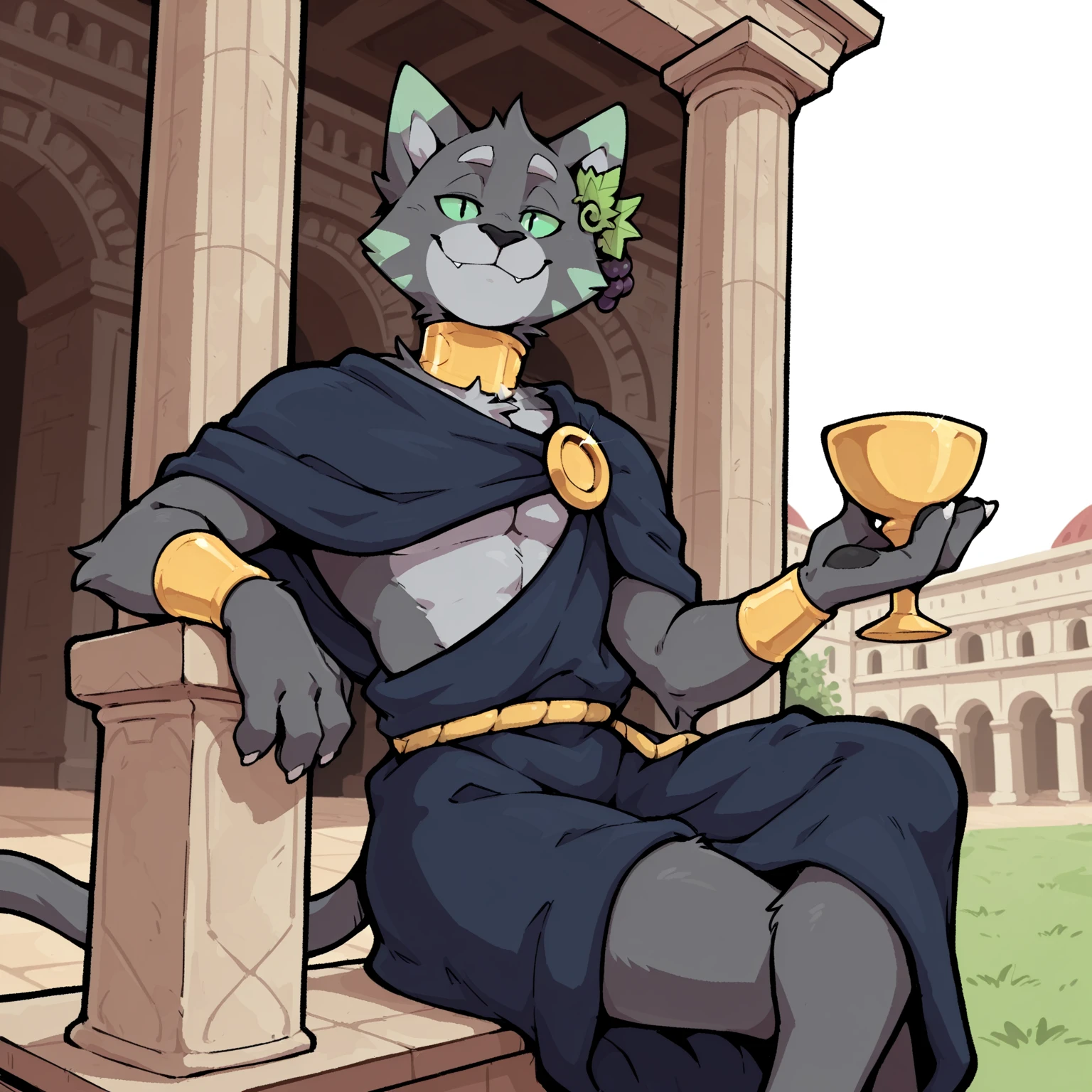 Positive Prompts: AlexiosAD, furry male, anthro, feline, cat, light-green ear tips, grey inner ear, light-green sclera, black pupils, slit pupils, light-green cheek markings, black nose, grey muzzle, dark-grey body, dark-grey fur, grey body, grey fur, two tone body, two tone fur, dark-grey tail, medium tail