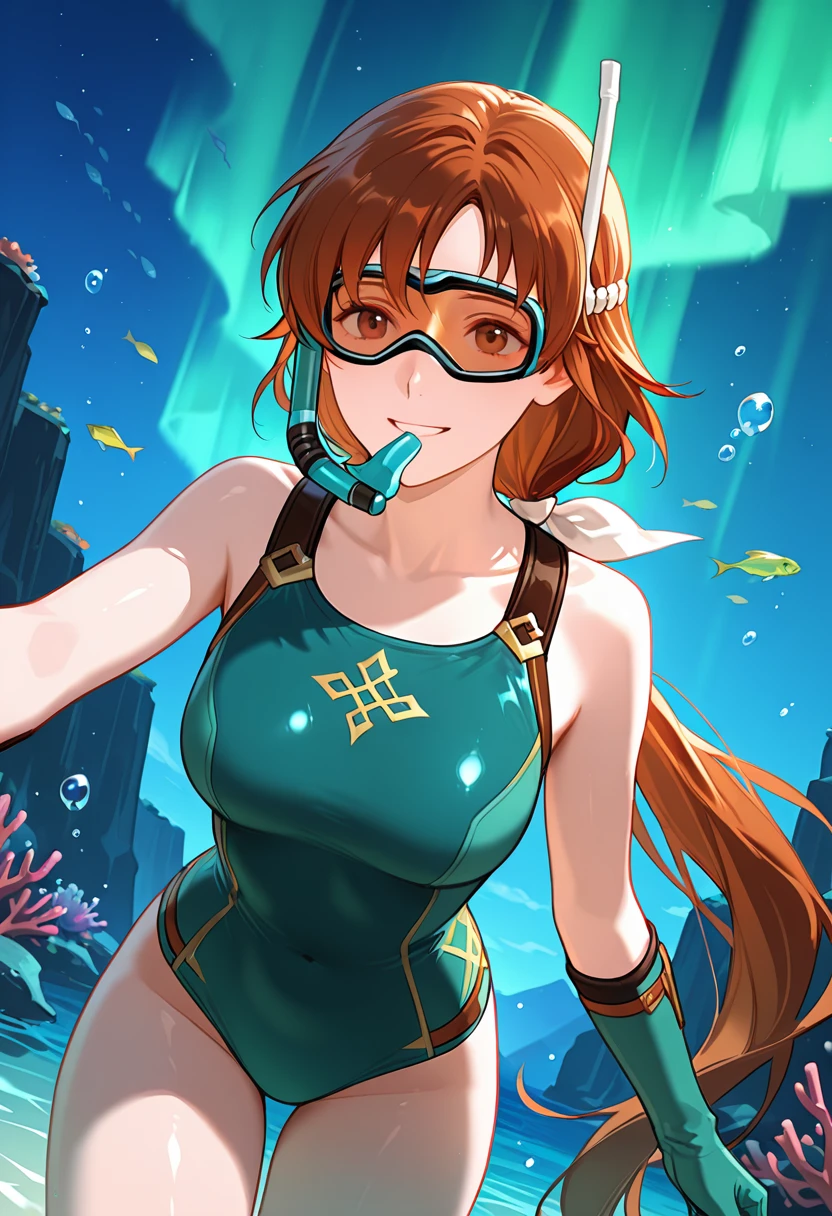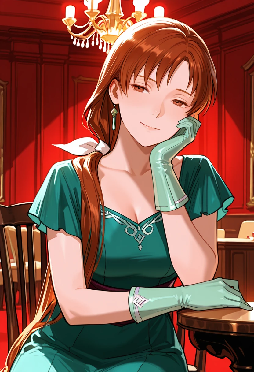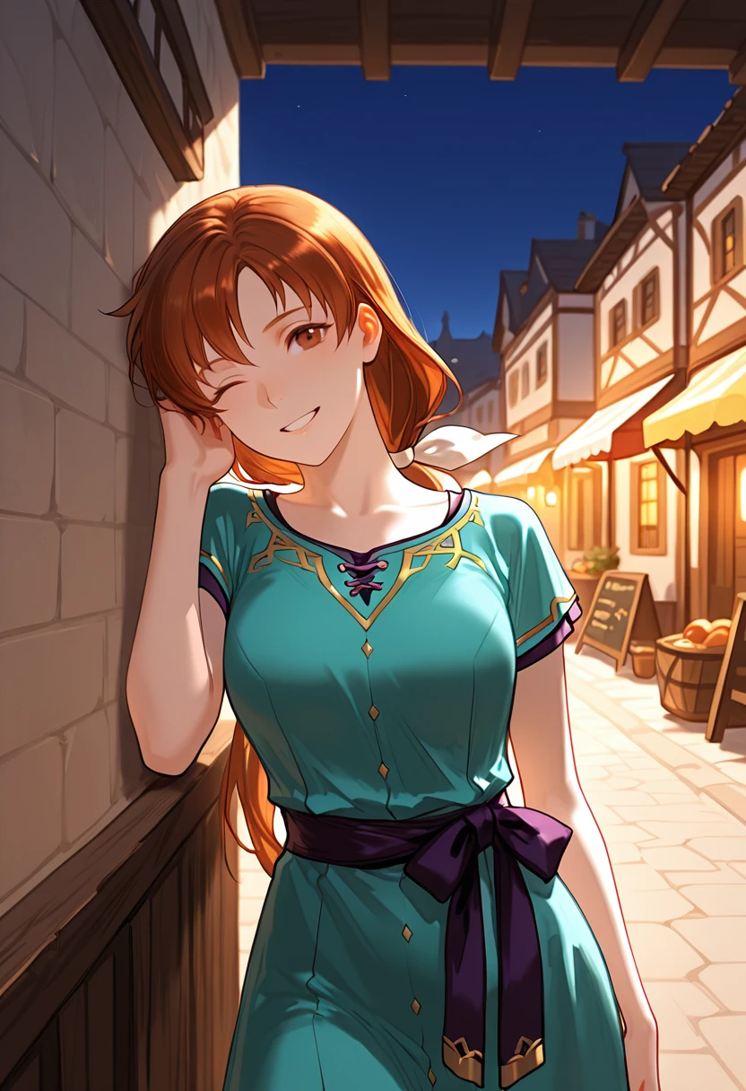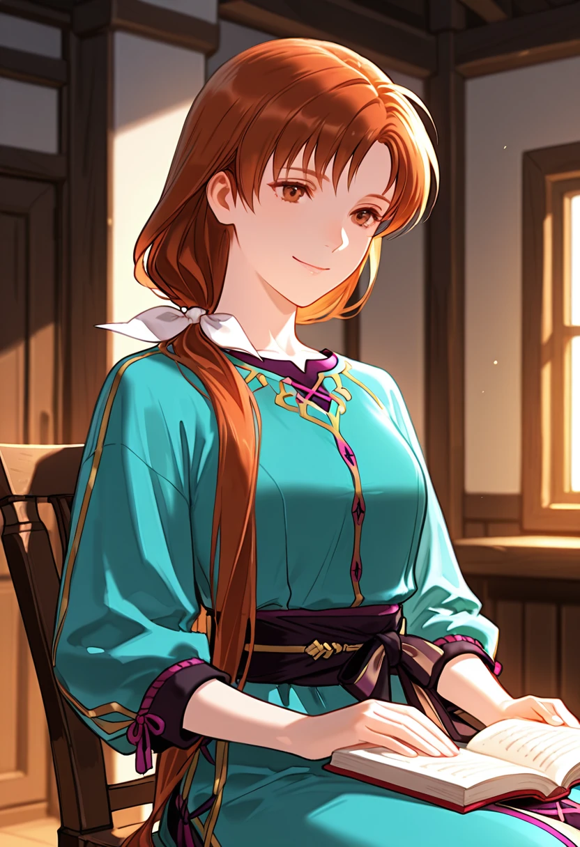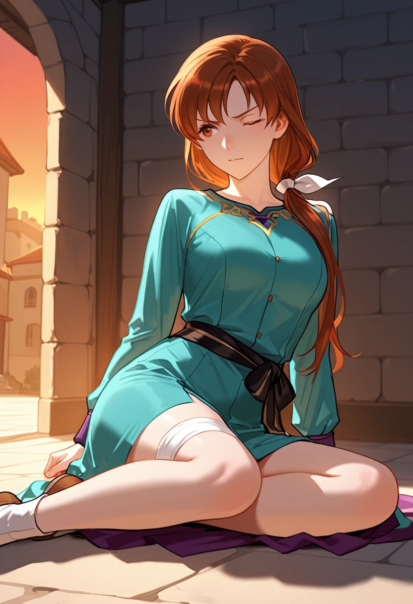 Trigger Words: NatalieFE, brown hair, long hair, low ponytail, bangs, hair bow, white bow, brown eyes, aqua dress, buttons, black sash,