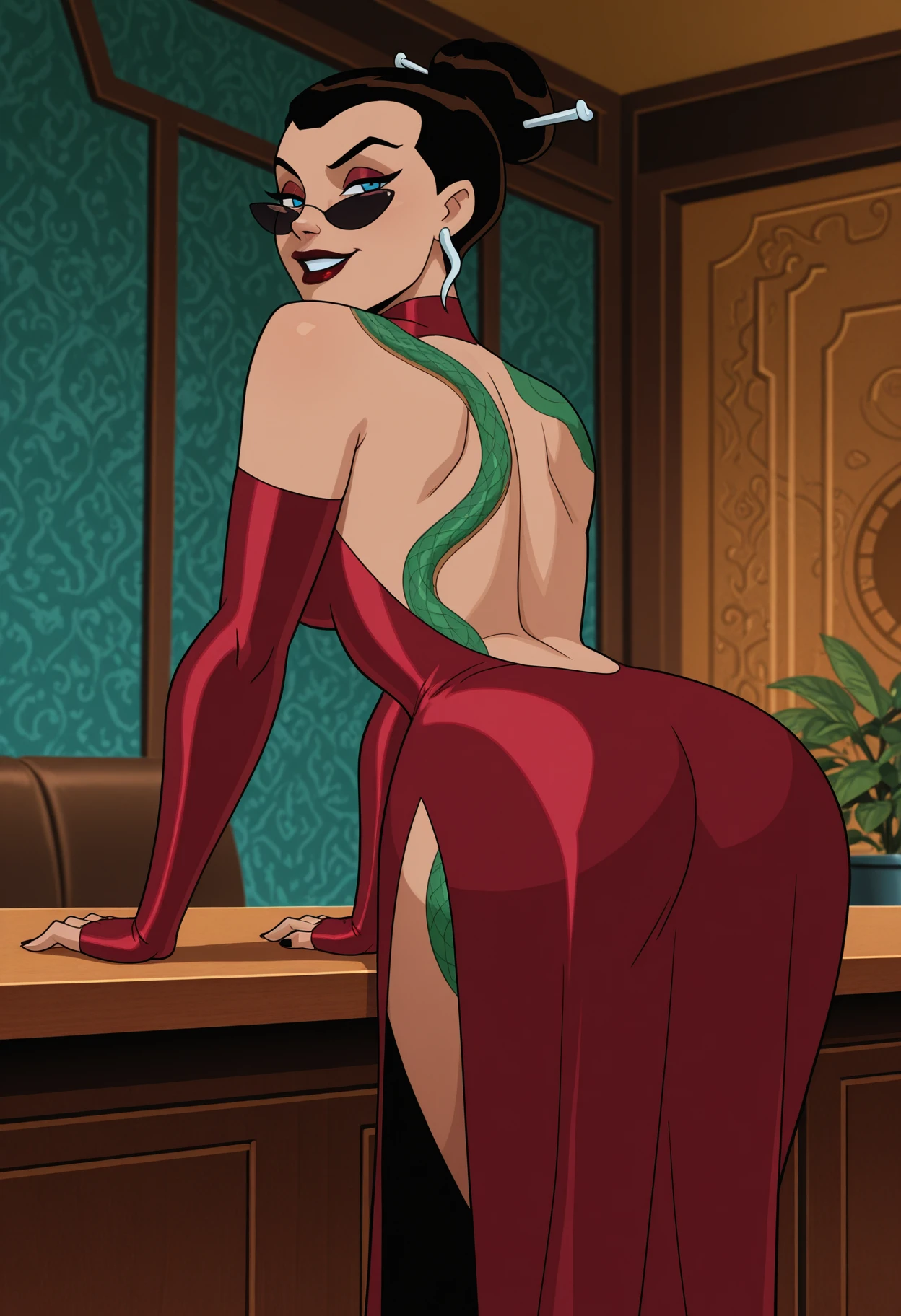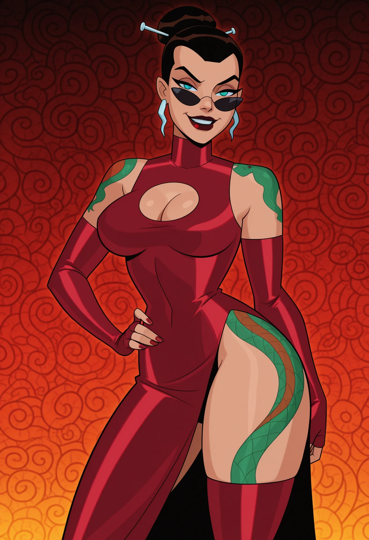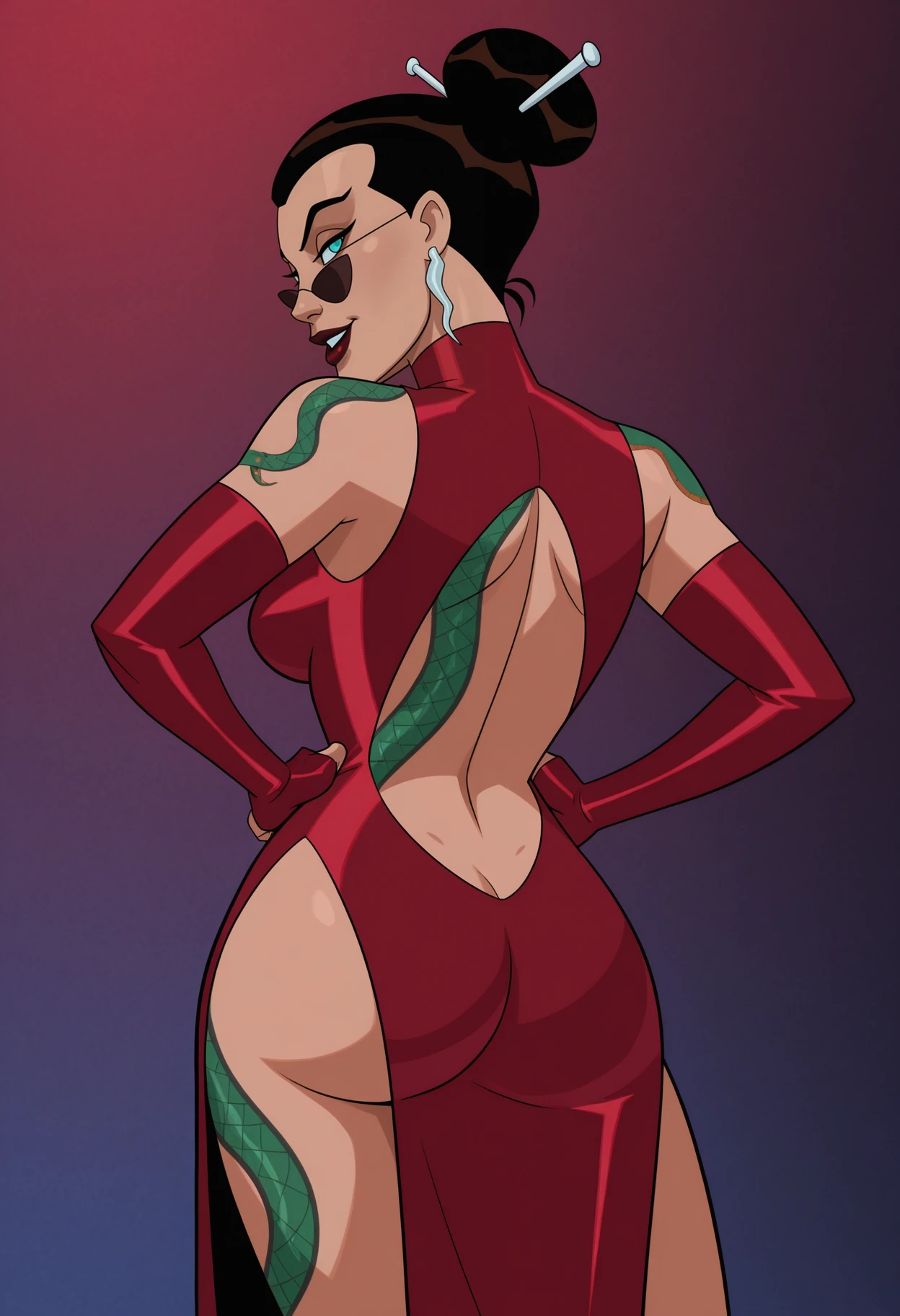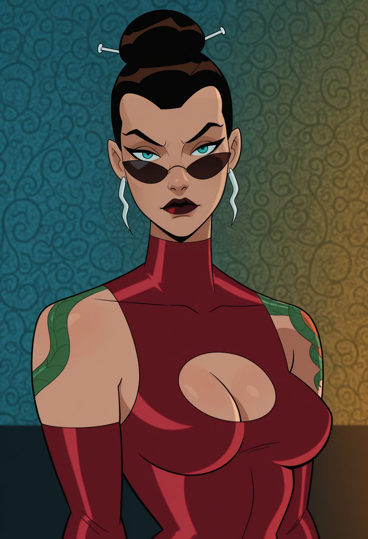 1girl, solo, blue eyes, aqua eyes, black hair, brown hair, short hair, hair bun, single hair bun, hair ornament, hair stick, breasts, large breasts, lips, lipstick, red lips, snake tattoo, shoulder tattoo, leg tattoo,main outfit tags: