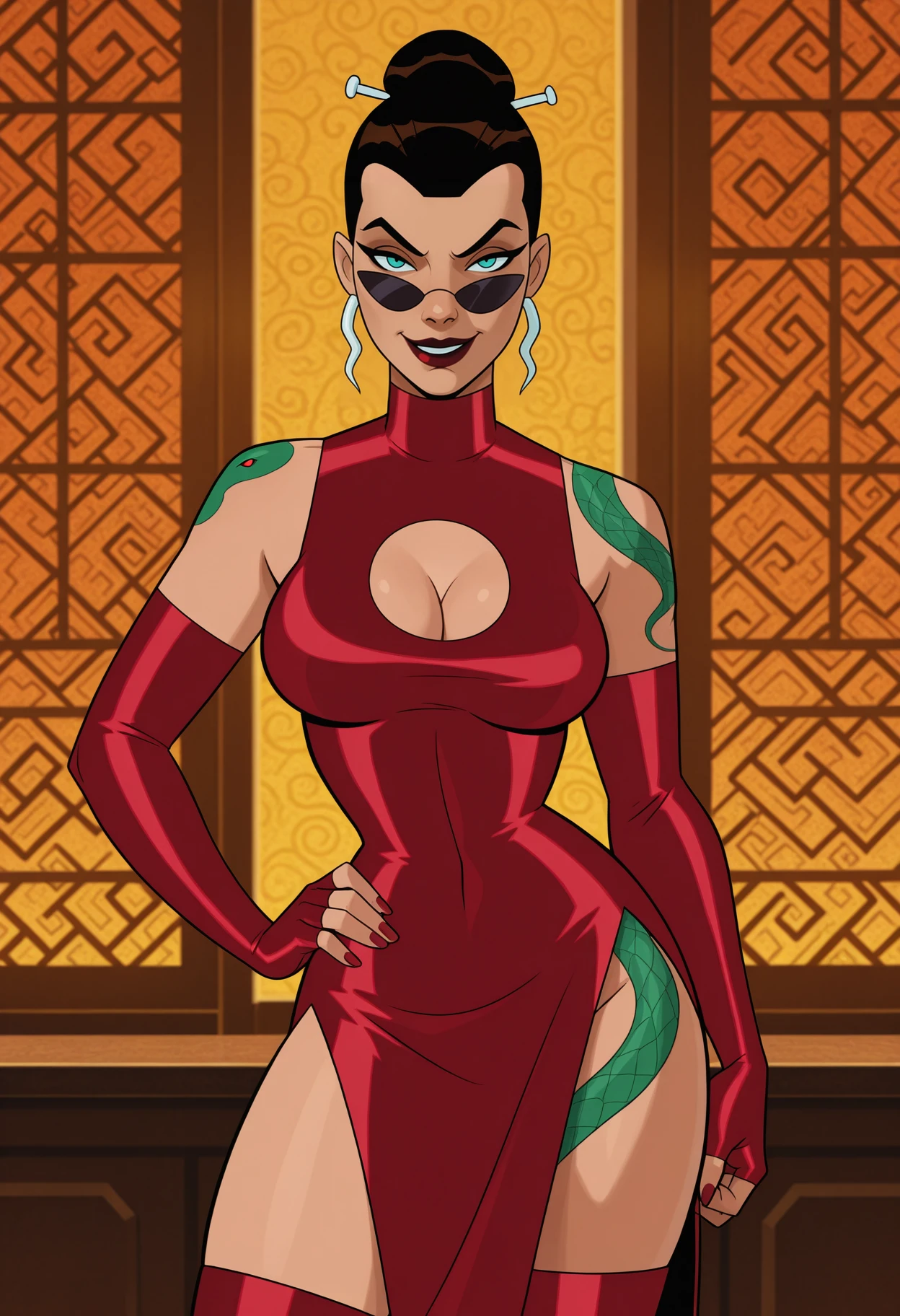 glasses, sunglasses, jewelry, earrings, bare shoulders, turtleneck, dress, china dress, red dress, long dress, clothing cutout, cleavage, cleavage cutout, side slit, sleeveless dress, detached sleeves, gloves, elbow gloves, red gloves, fingerless gloves, thighs, boots, red footwear,