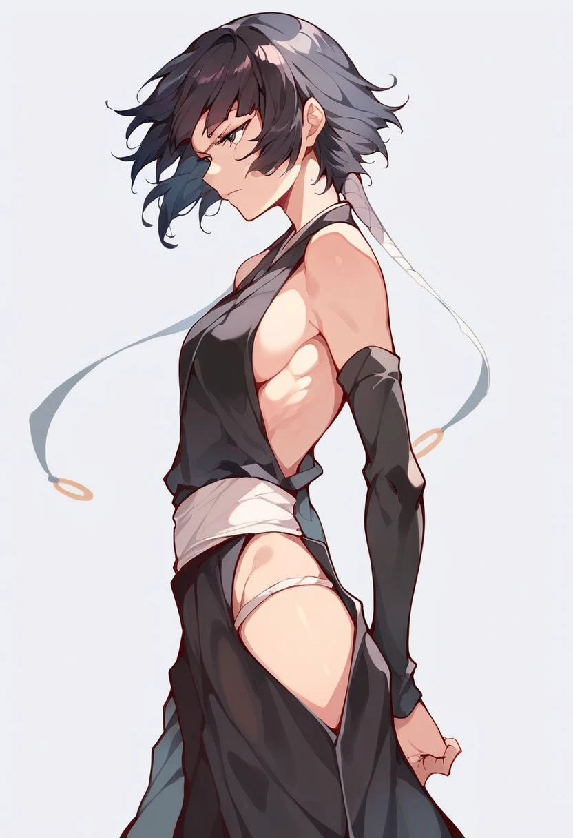 1girl, solo, soifon, bangs, black eyes, black hair, japanese clothes, sideboob, black hakama, hip vent, detached sleeves, bare shoulders,