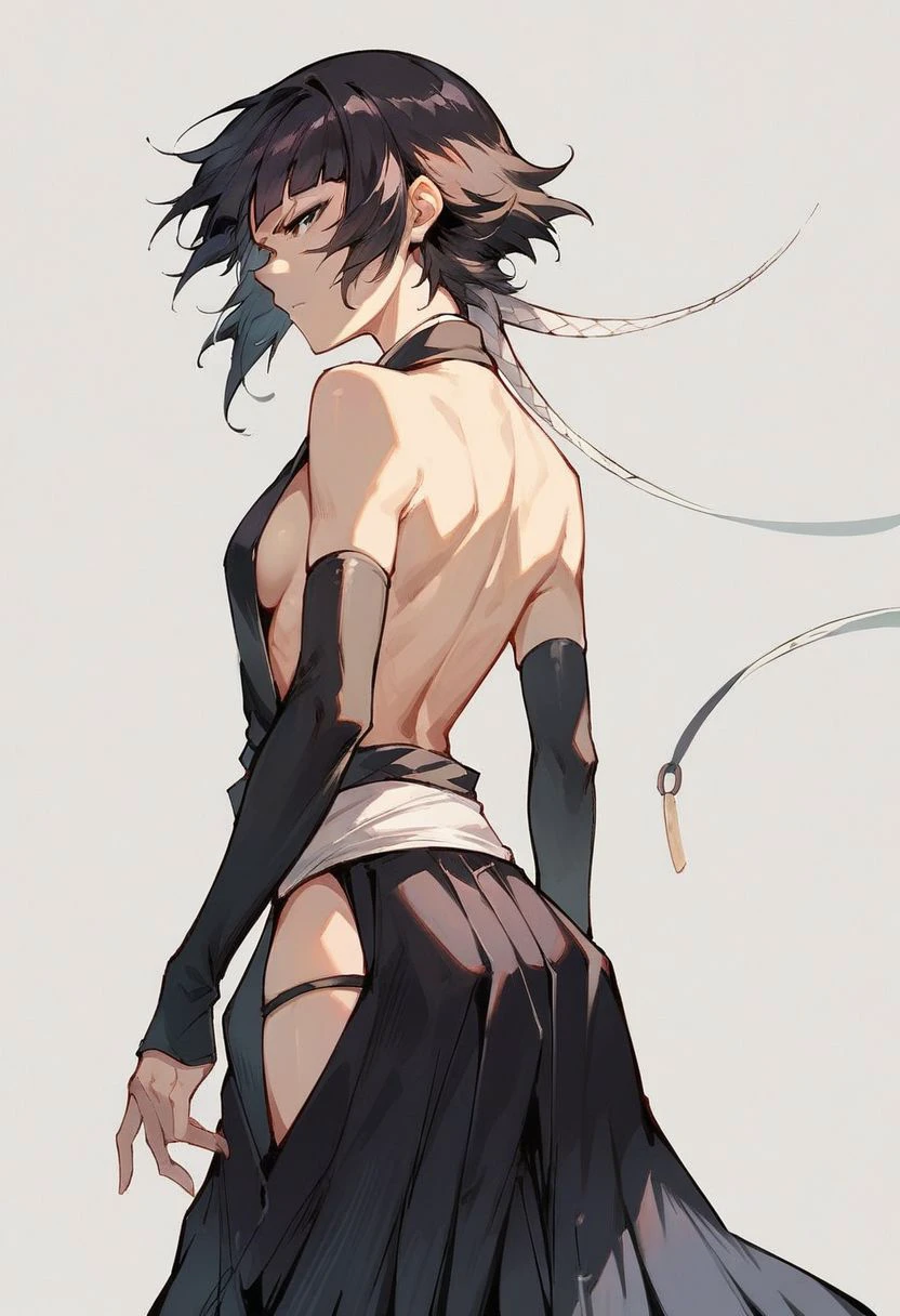 outfits: 1girl, solo, soifon, bangs, black eyes, black hair, japanese clothes, sideboob, black hakama, hip vent, detached sleeves, bare shoulders,