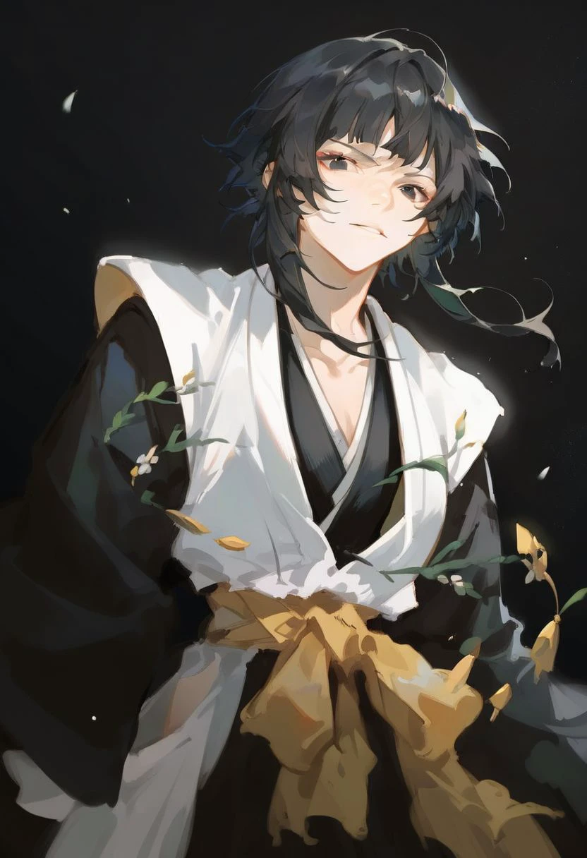 1girl, solo, soifon, bangs, black eyes, black hair, japanese clothes, black kimono, sleeveless white haori