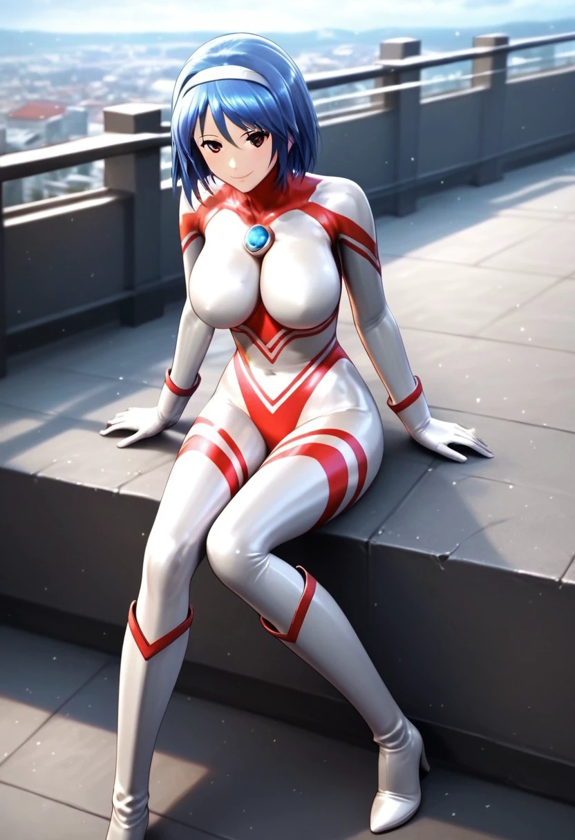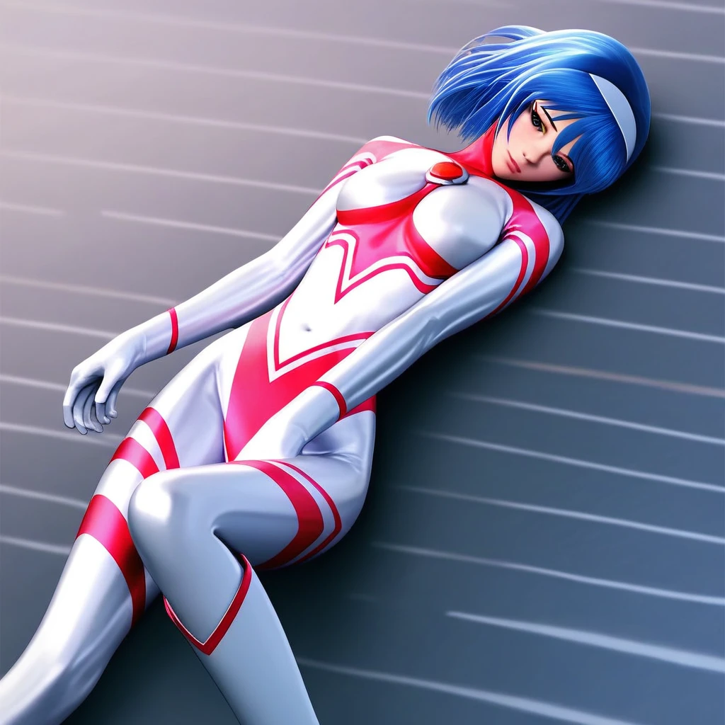 alice, blue hair, short hair, hairband, bodysuit, blue chest jewel, gloves, knee-high boots,