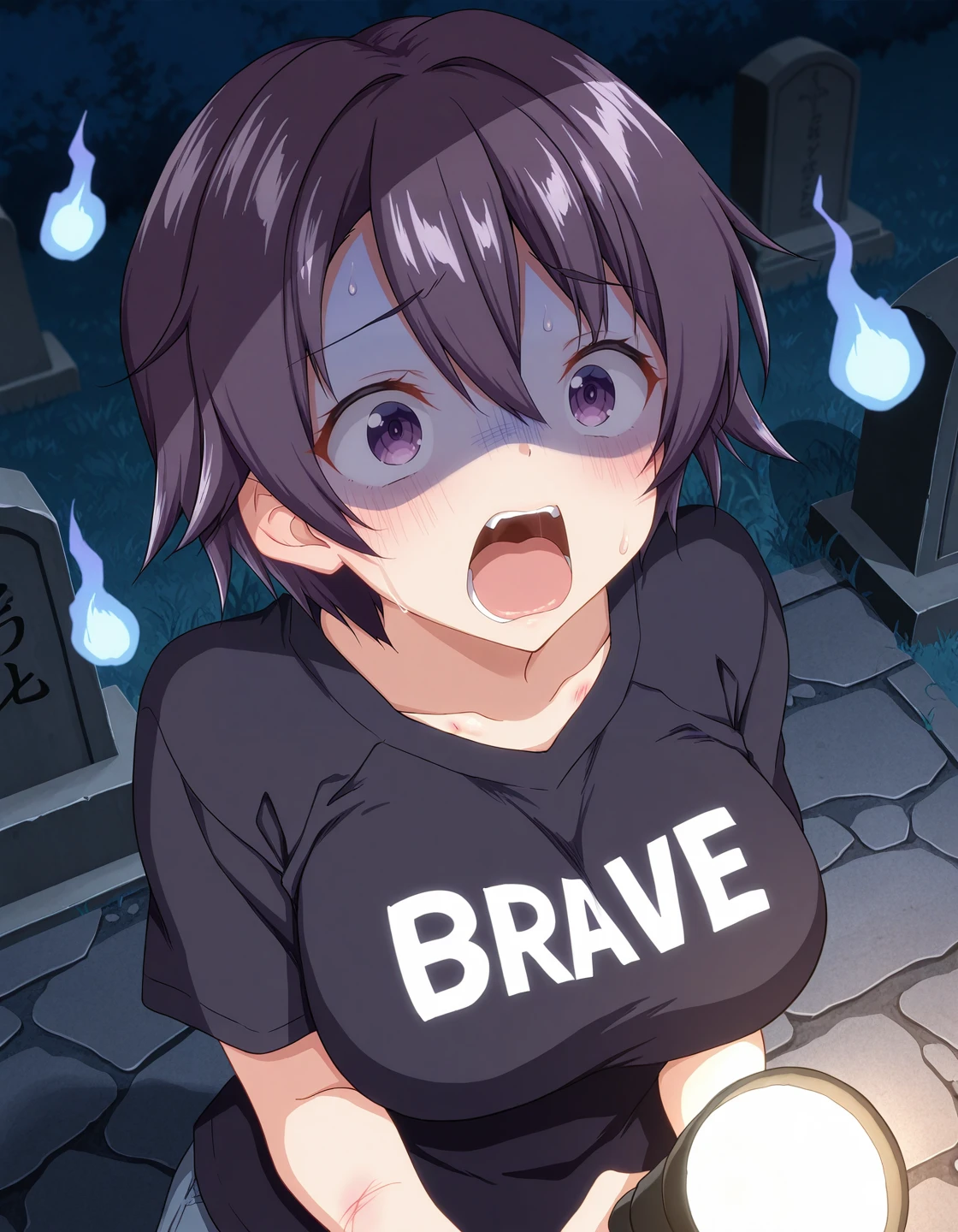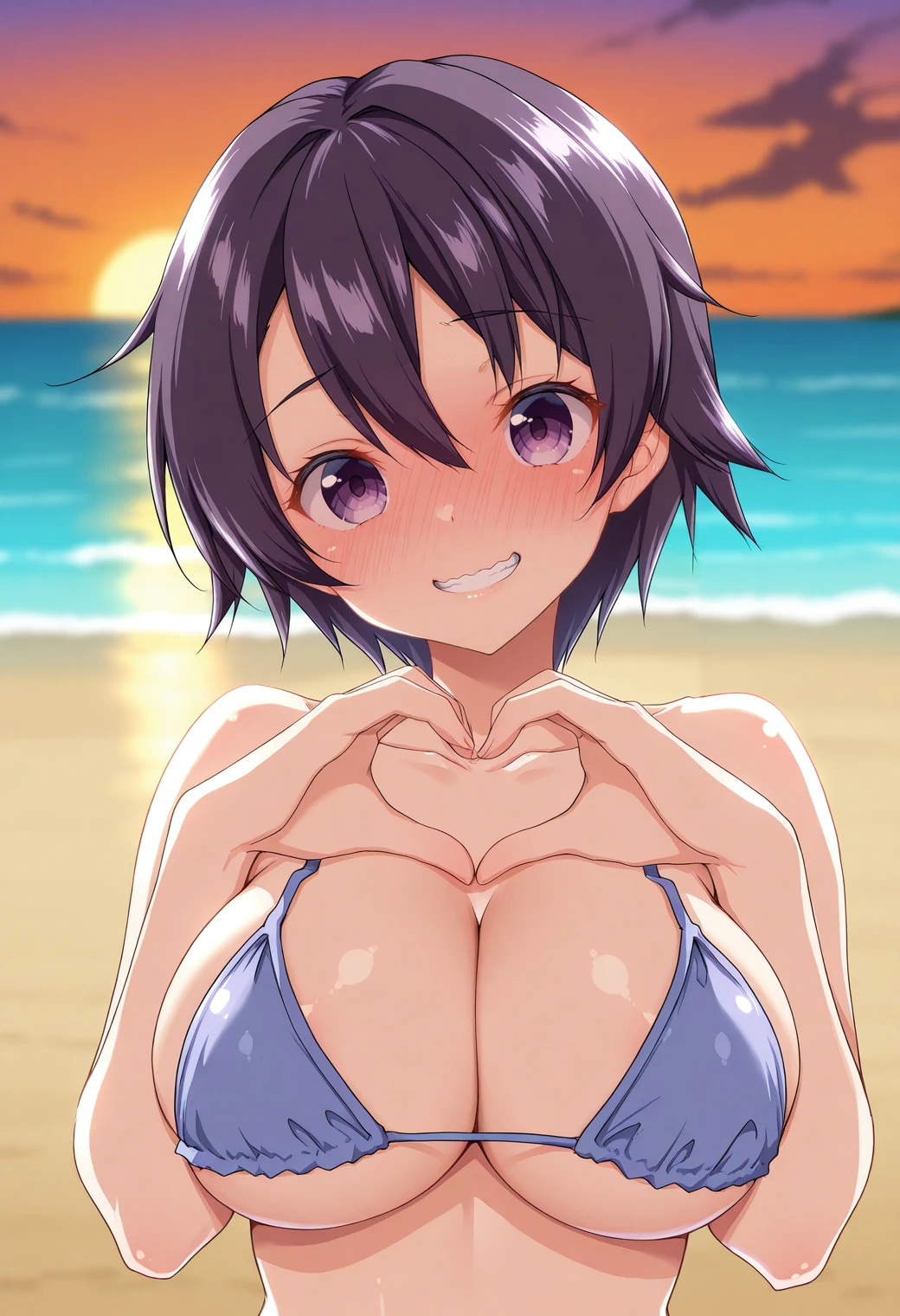 short hair, bangs, hair between eyes, purple eyes, purple eyes, large breast