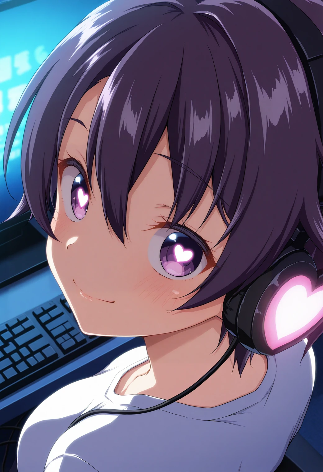 short hair, bangs, hair between eyes, purple hairs, purple eyesThe dataset has been updated to reduce the problems caused by manga images, so the tags: "bubble speech, text, moaning etc etc." are no longer needed in the negative.