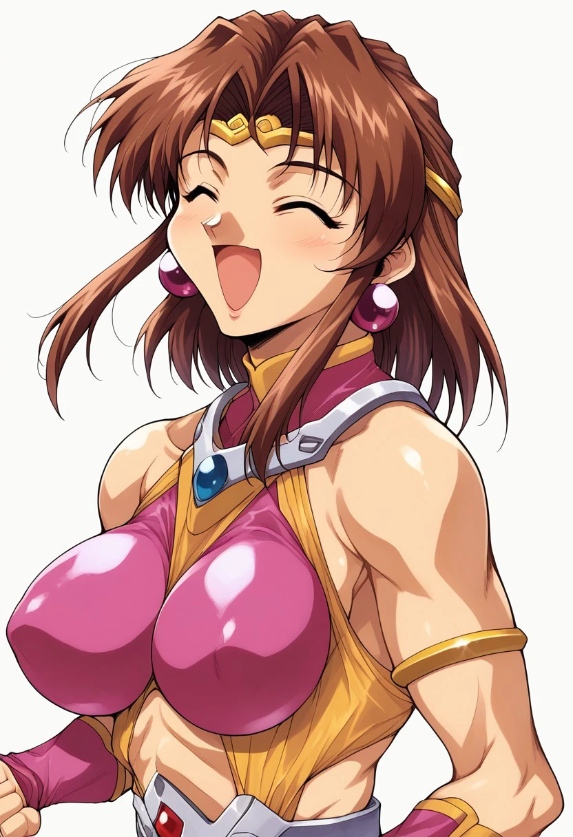 voltage fighter gowcaizer,seiten taisei karin /(game version style/),1girl,solo,breasts,closed eyes,large breasts,open mouth,jewelry,earrings,smile,clenched hands,brown hair,:d,upper body,happy,circlet,simple background,white background,^ ^,short hair, bare shoulders,1990s \(style\), retro artstyle
