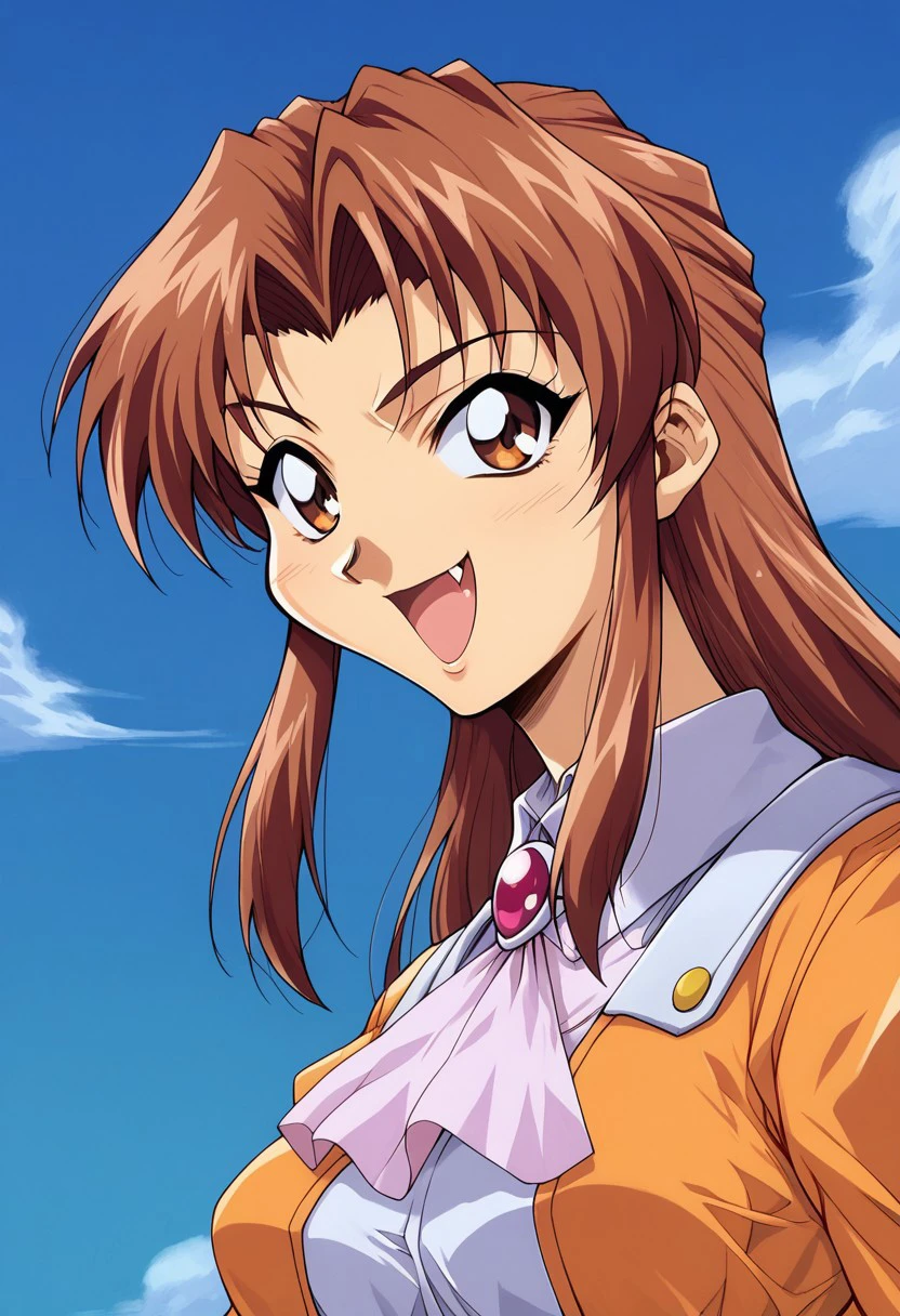 voltage fighter gowcaizer,karin son,1girl,solo,fang,long sleeves,brown hair,open mouth,long hair,smile,blue shirt,skirt,ascot,:d,blue,skirt,shirt,sky,looking at viewer,jacket,brown eyes,blue background,1990s \(style\), retro artstyle