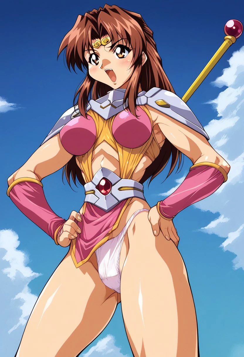 voltage fighter gowcaizer,karin son,1girl,solo,brown hair, brown eye,open mouth,long hair, breasts, large breasts,retro artstyle