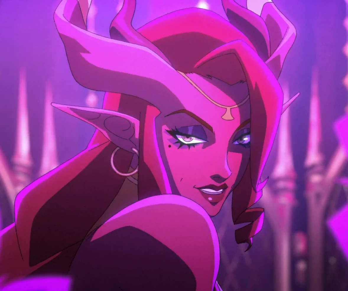 marion_mighty, long hair, red hair, braided hair, red skin, tiefling, horns, jewelry, makeup, lavender eyeshadow, amber eyes, red lipstick, mole under right eye, pointed ears, hoop earrings, cleavage, large breasts, petite waist, wide hips, bimbo ass, devil tail,