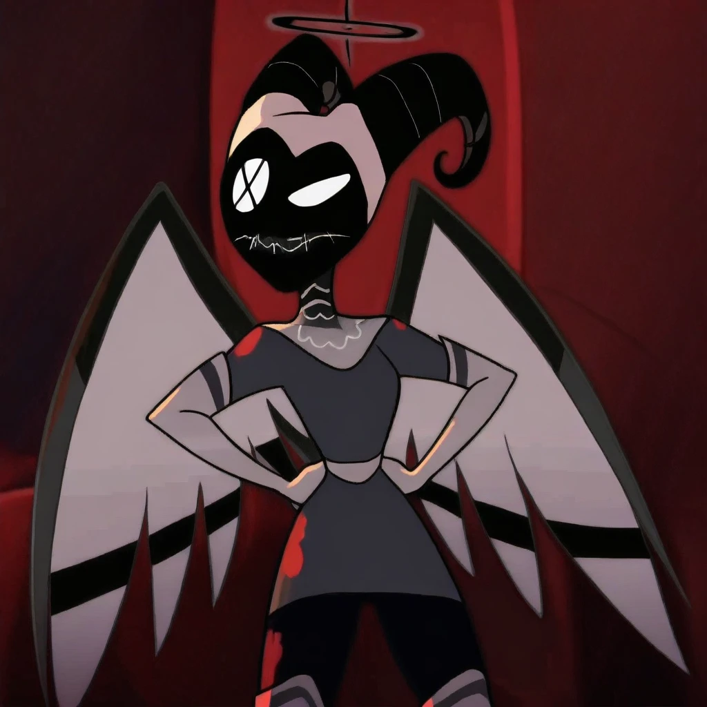 screencap, lute, halo, black halo, black halo with white outline, glowing outline, angel wings, pale skin, short hair, white hair, white sclera, yellow eyes, turtleneck dress, white belt, white elbow gloves, black leggings, exorcist uniform,