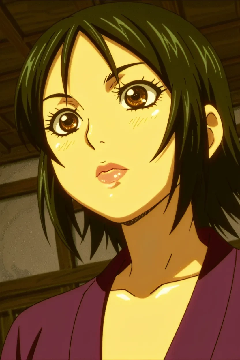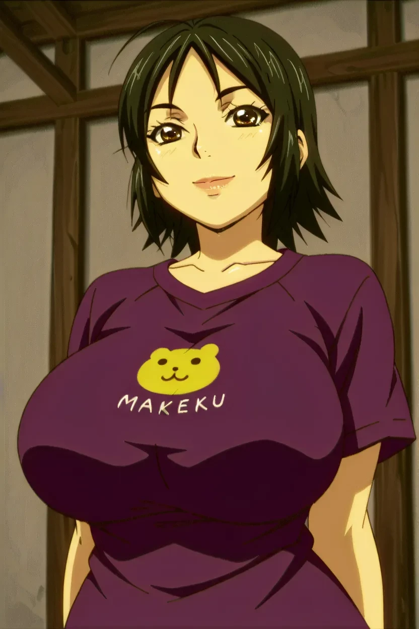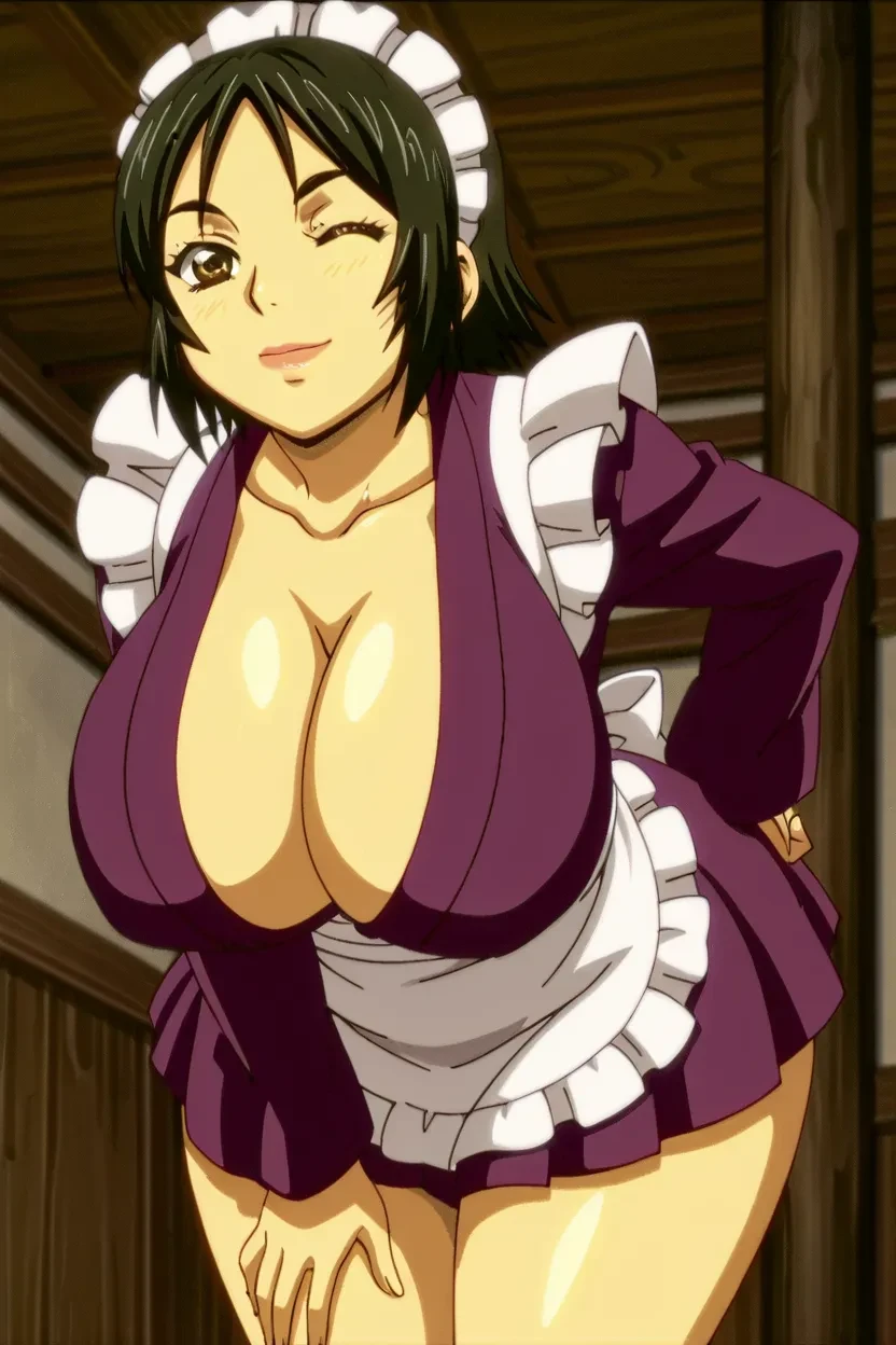 1girl, Beauty Cafe Manager (Manyuu Hikenchou), black_hair, short hair, brown_eyes, lips, glossy lips, thick lips, massive breasts, Manyuu Hikenchou_art_style, 4k, HD, excellent quality, high-resolution, clear animation