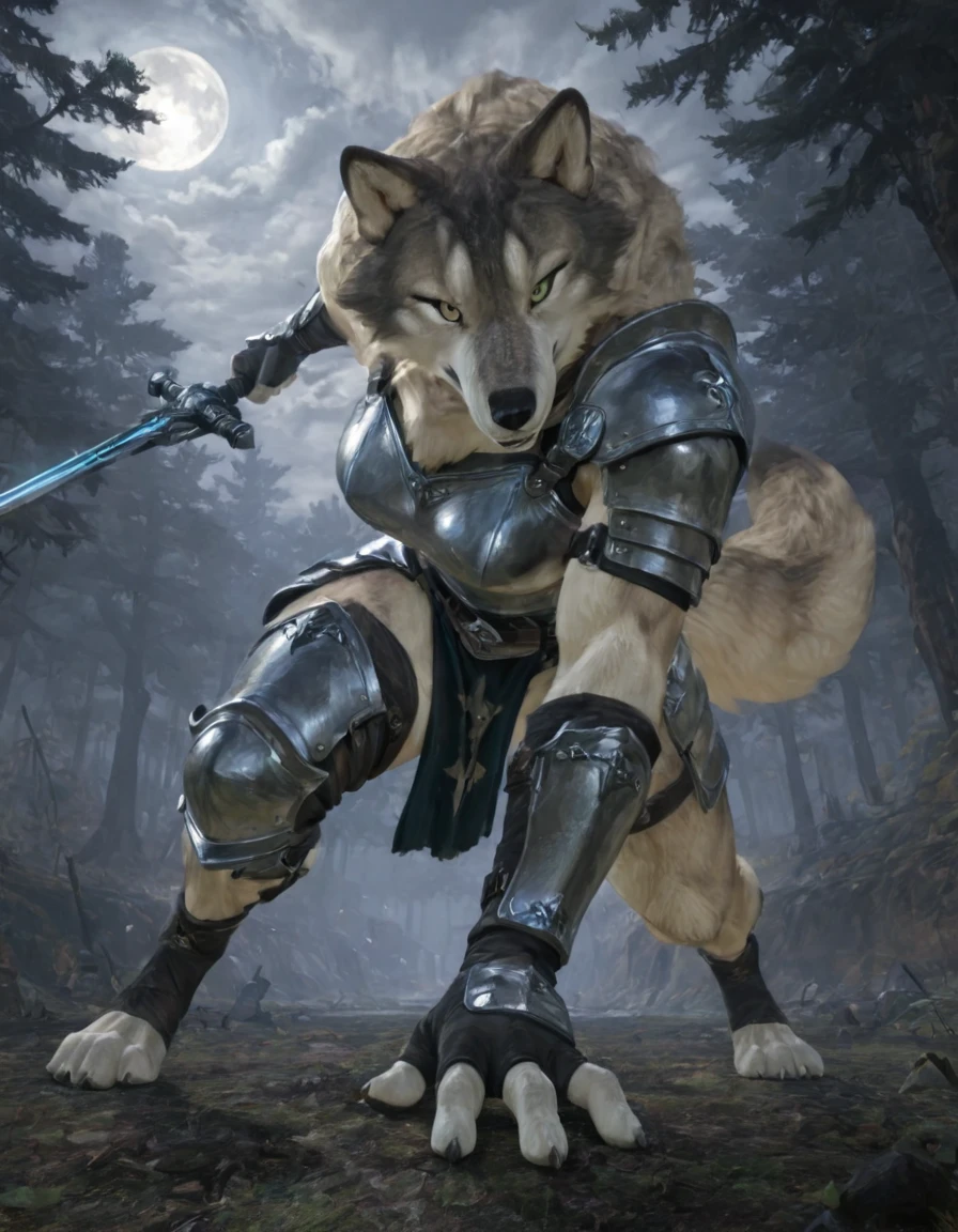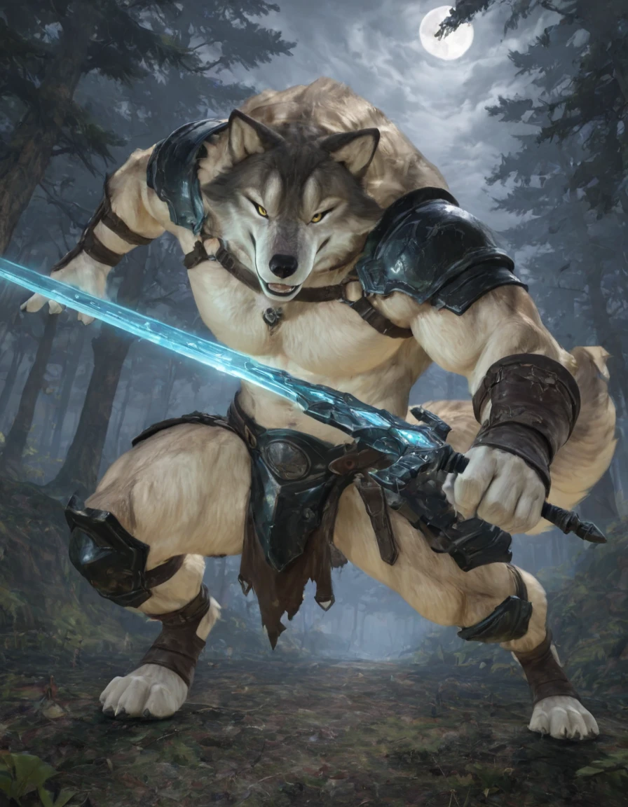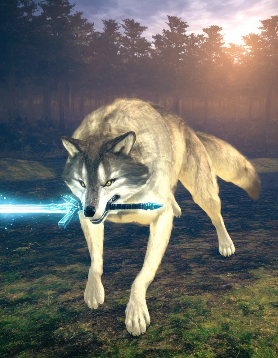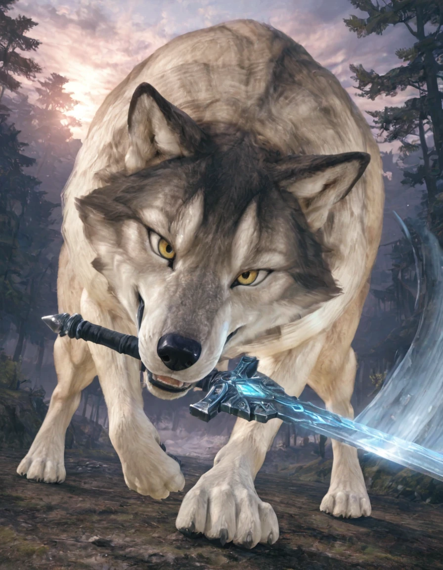 sif, wolf, feral, grey fur, giant, no humans, outdoors, glowing weapon, holding sword, mouth hold,